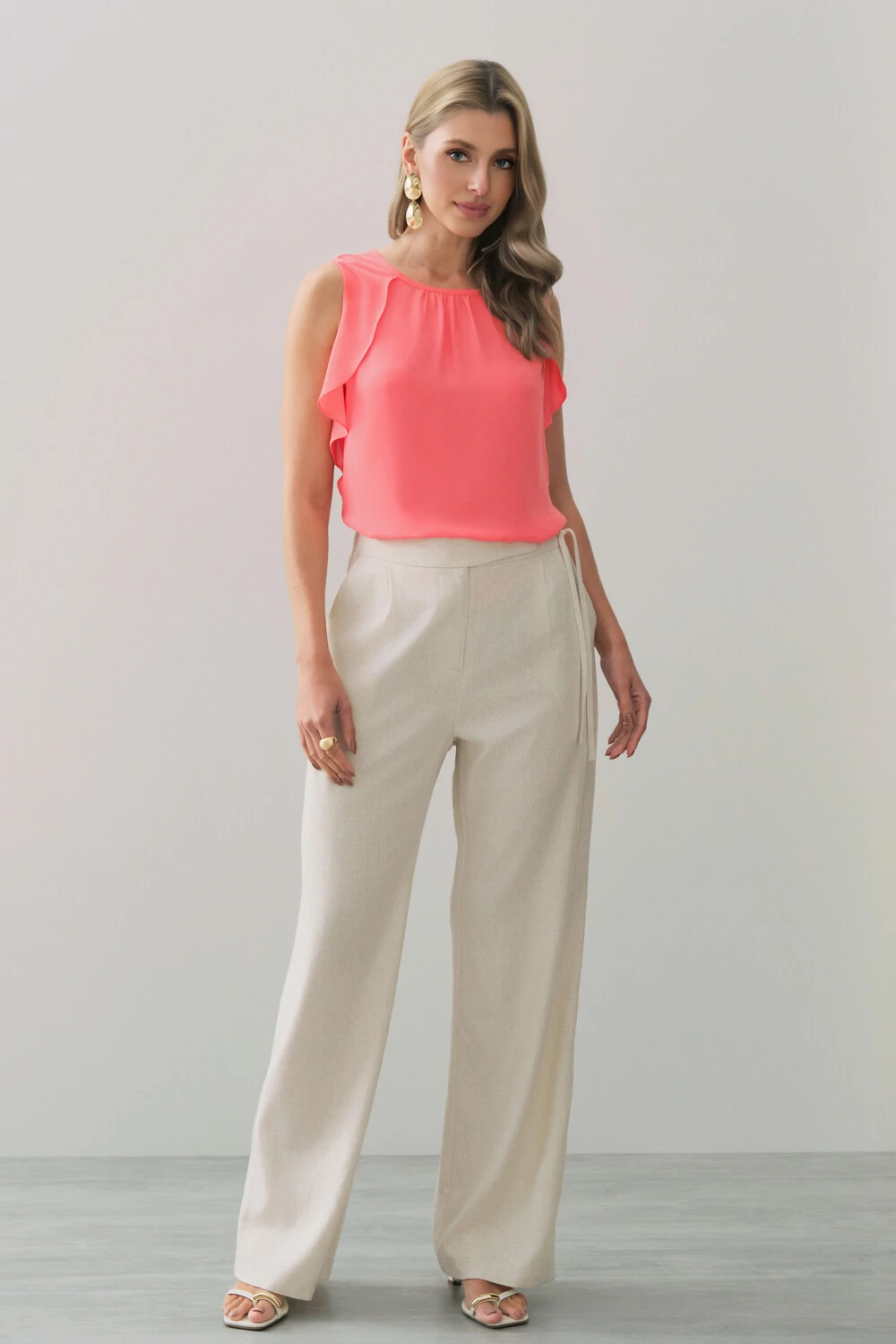 Calça Reta de Linho Prega Laço Lateral