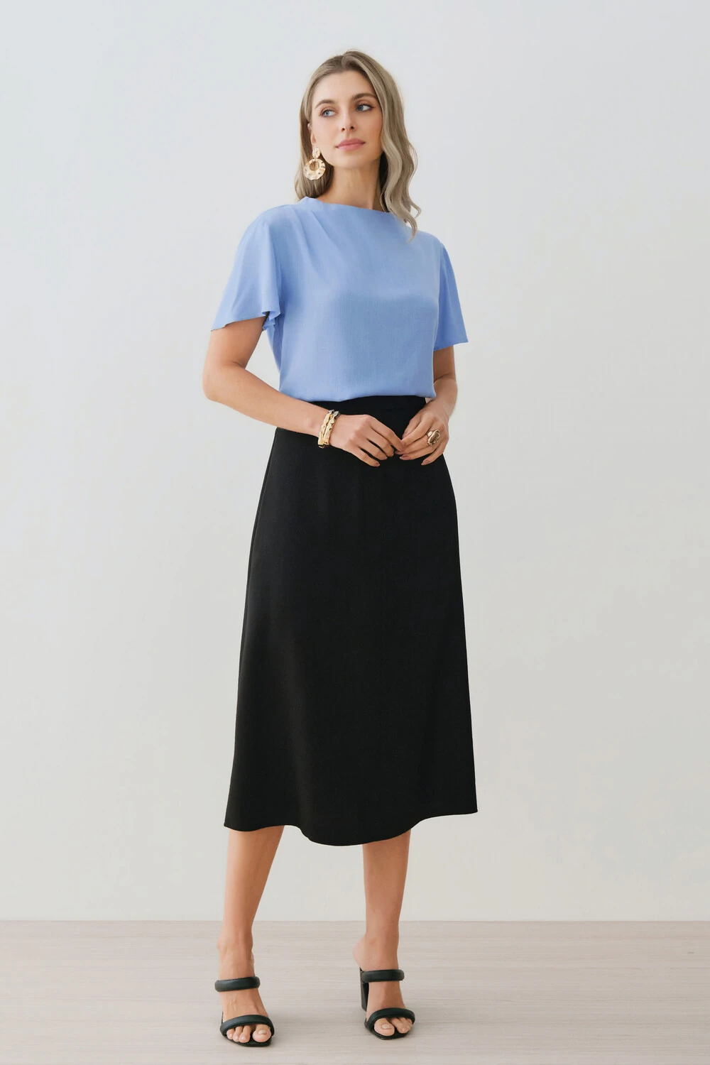 Saia Midi Evasê Botão Forrado