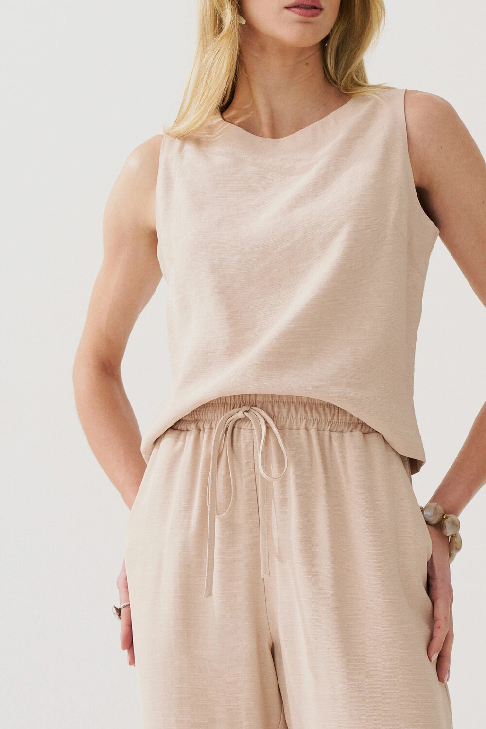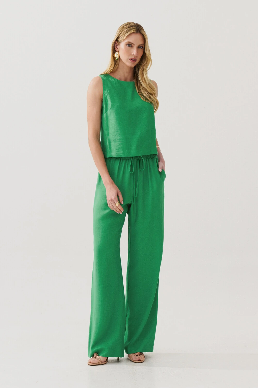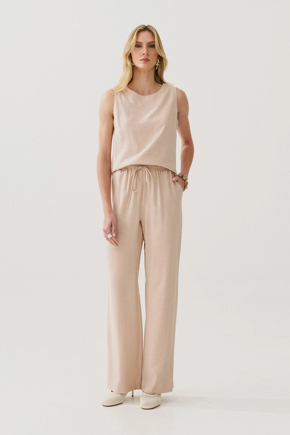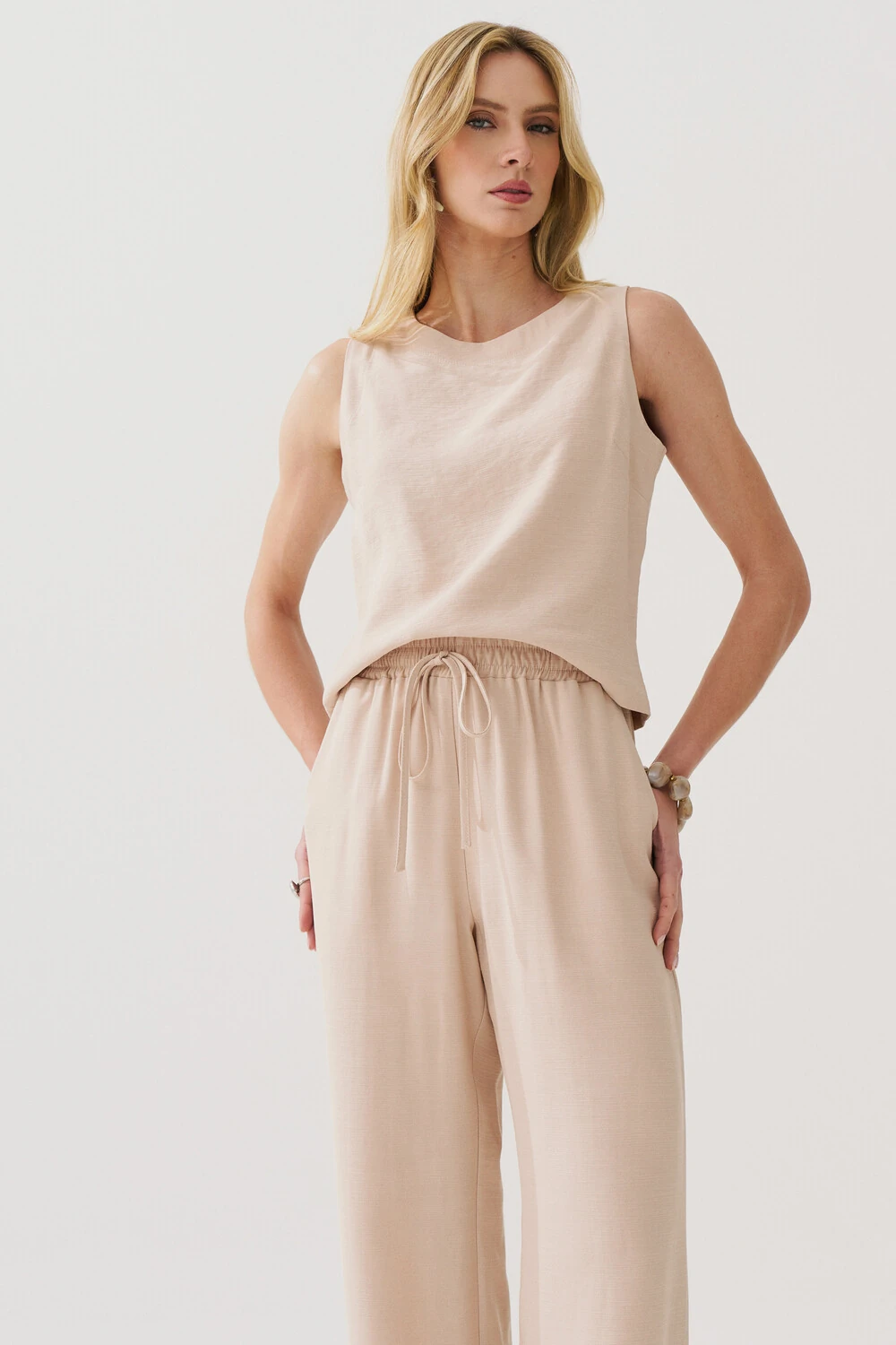 Conjunto de blusa regata crop com pence e calça reta com elástico e laço na cintura e bolso faca.
