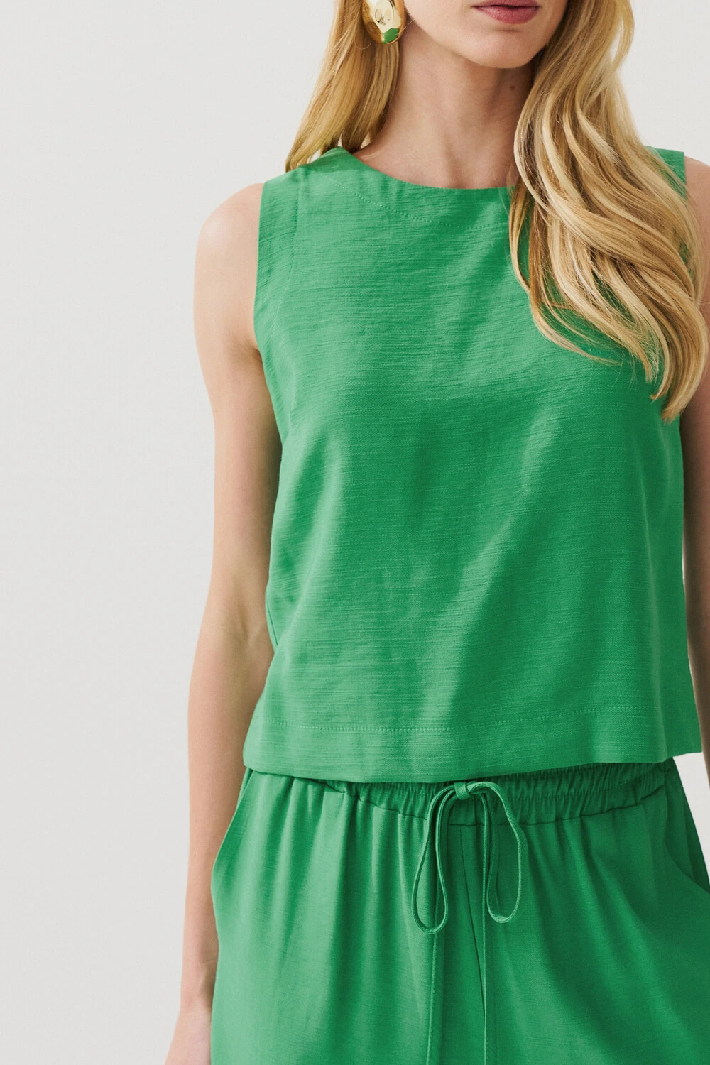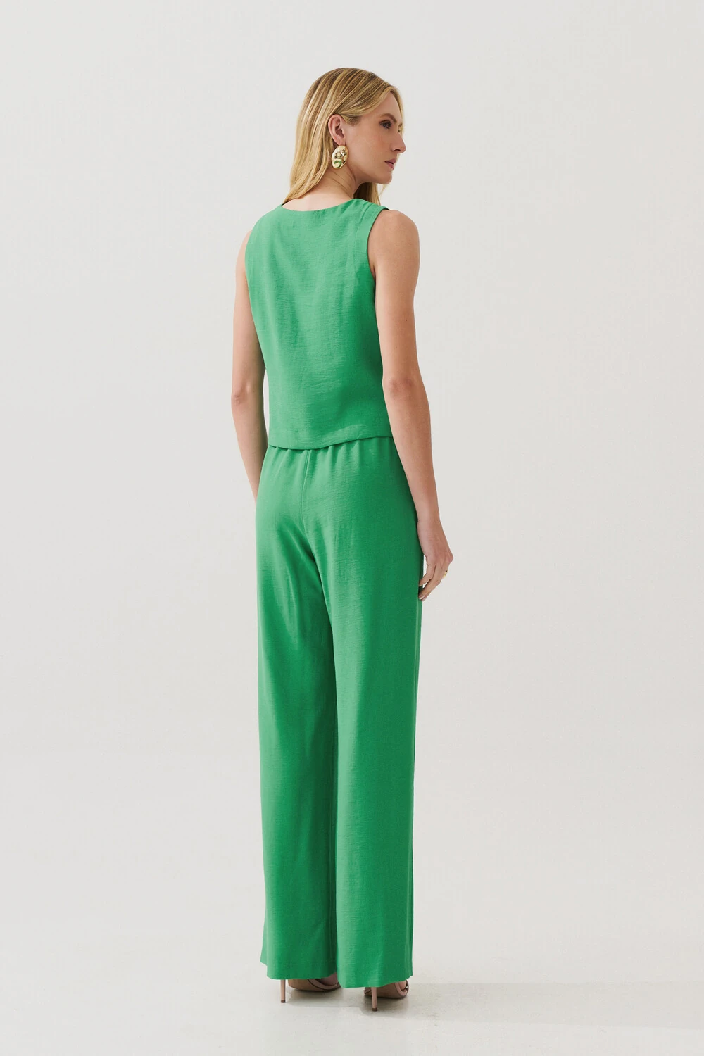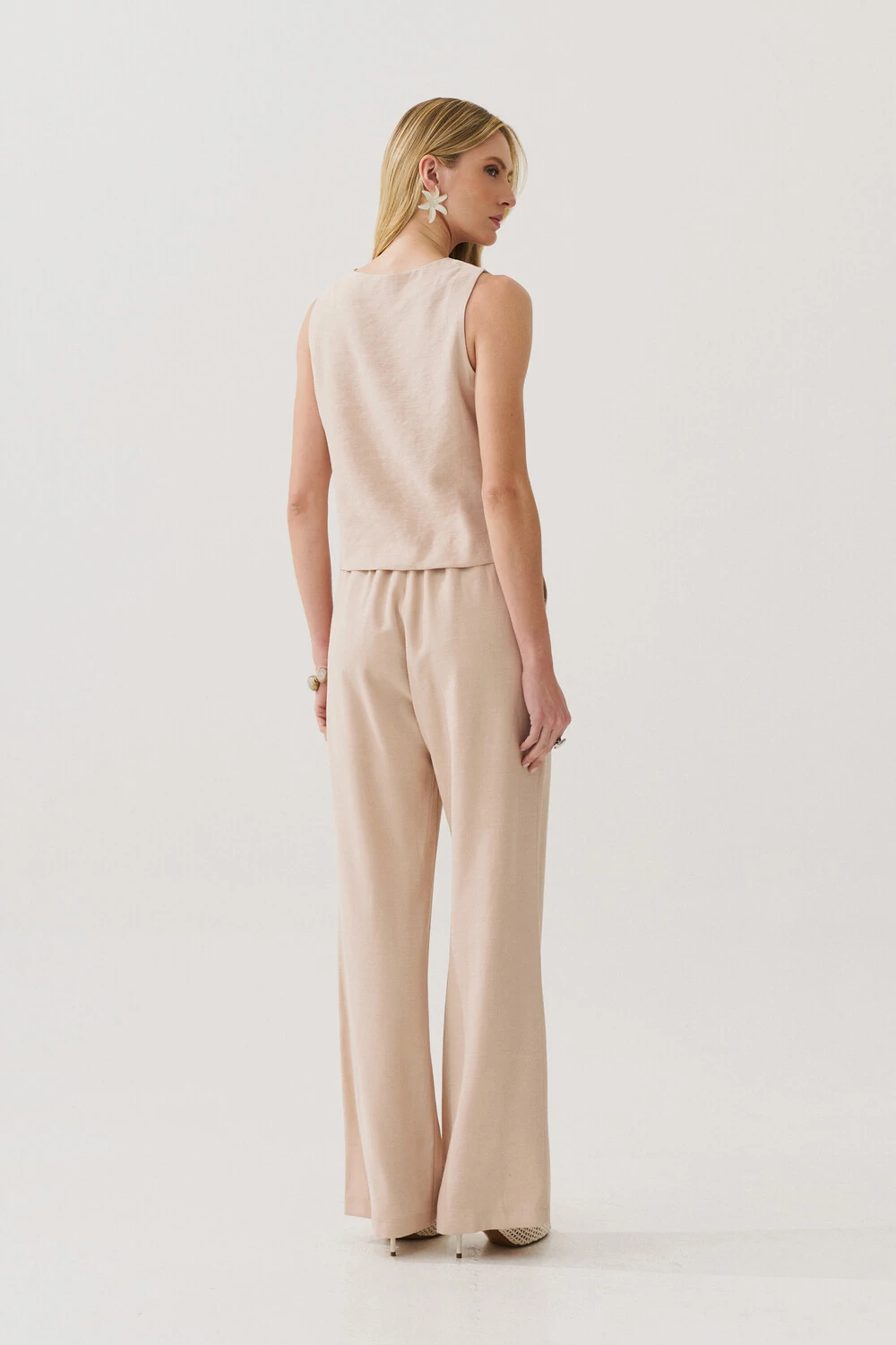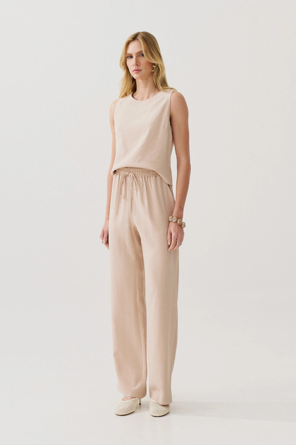 Conjunto de blusa regata crop com pence e calça reta com elástico e laço na cintura e bolso faca.