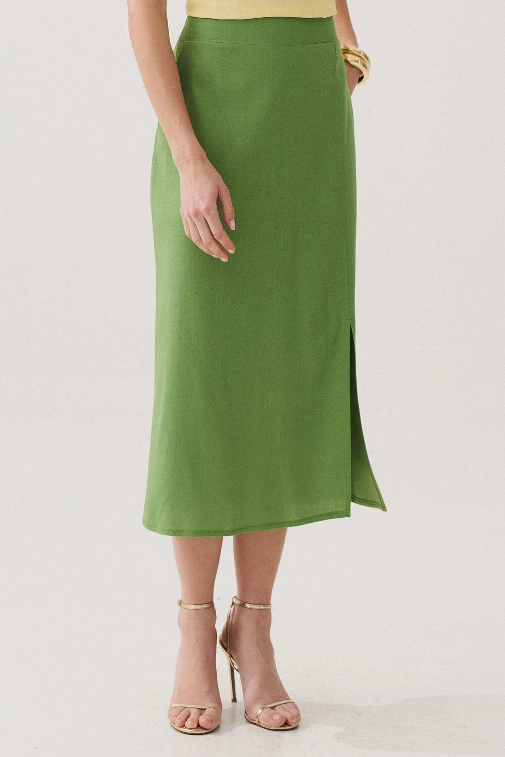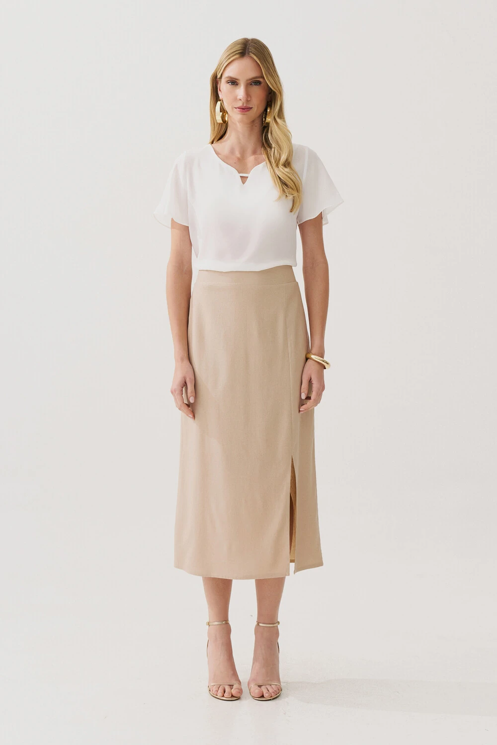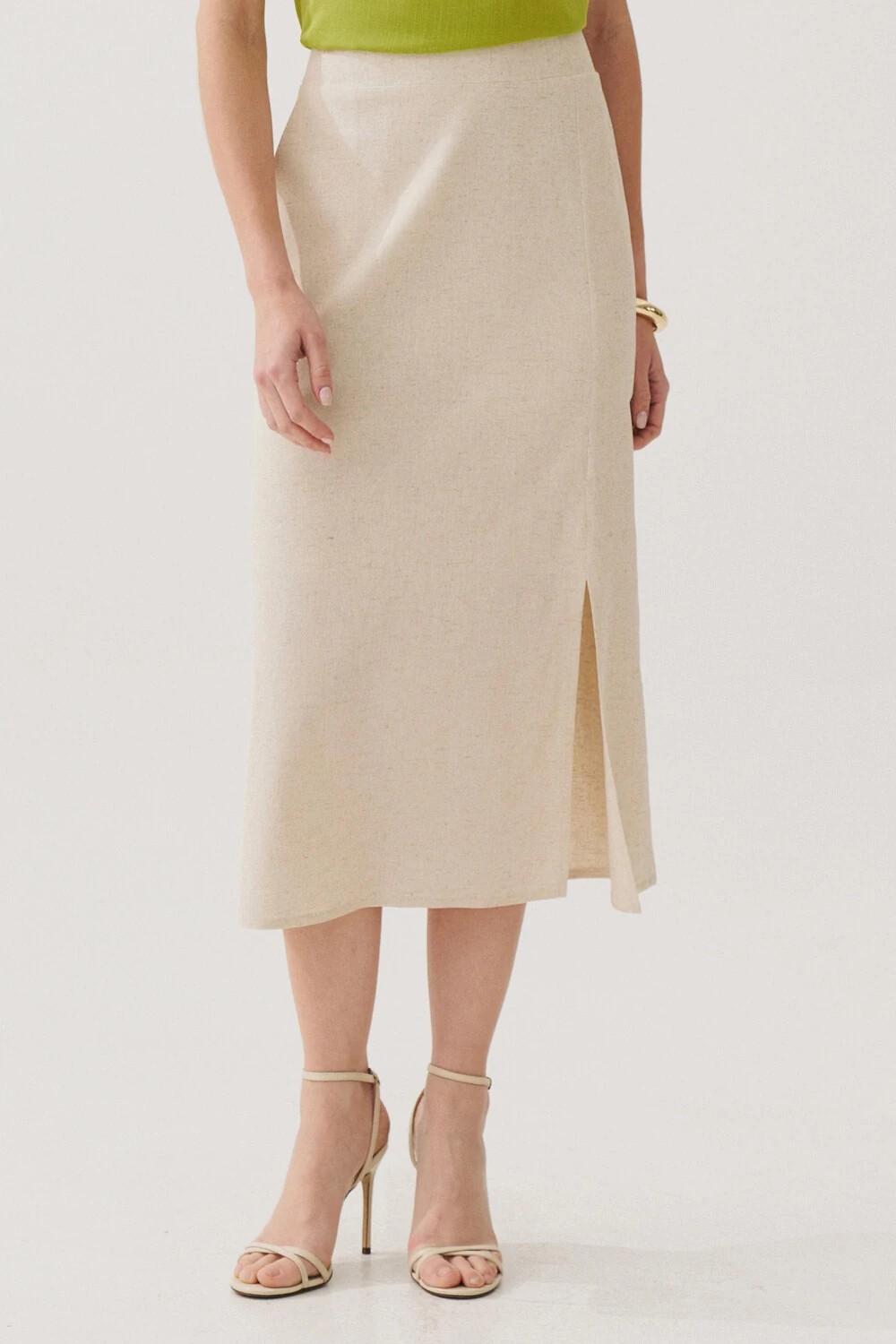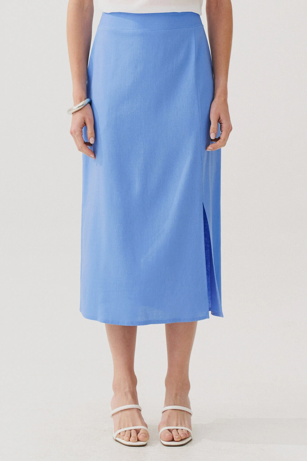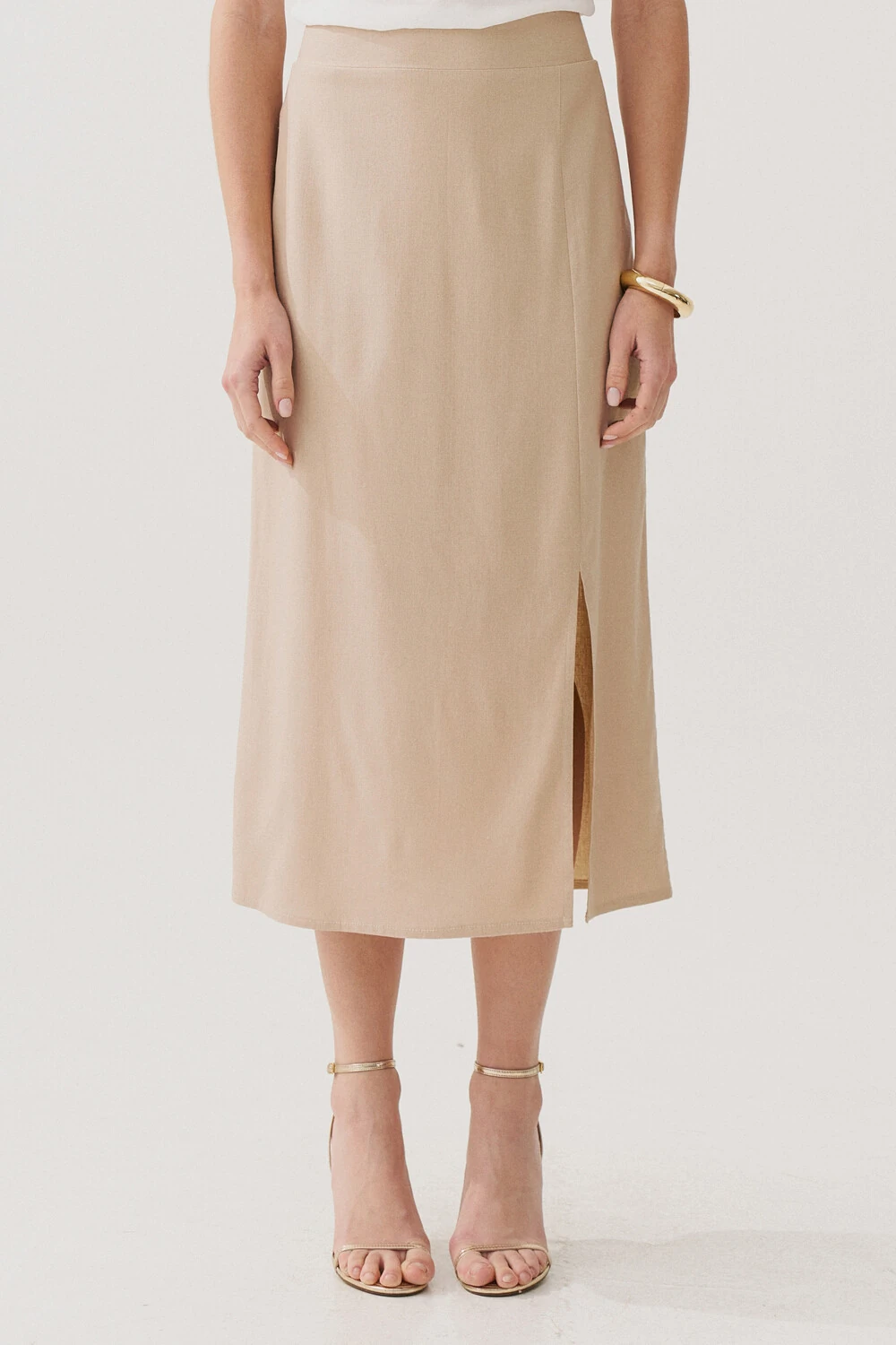 Saia midi de linho com fenda lateral. A saia contém o ziper invisível nas costas.