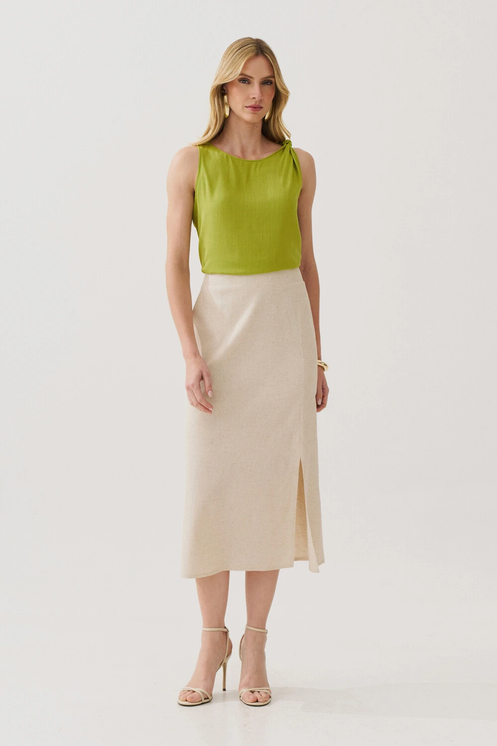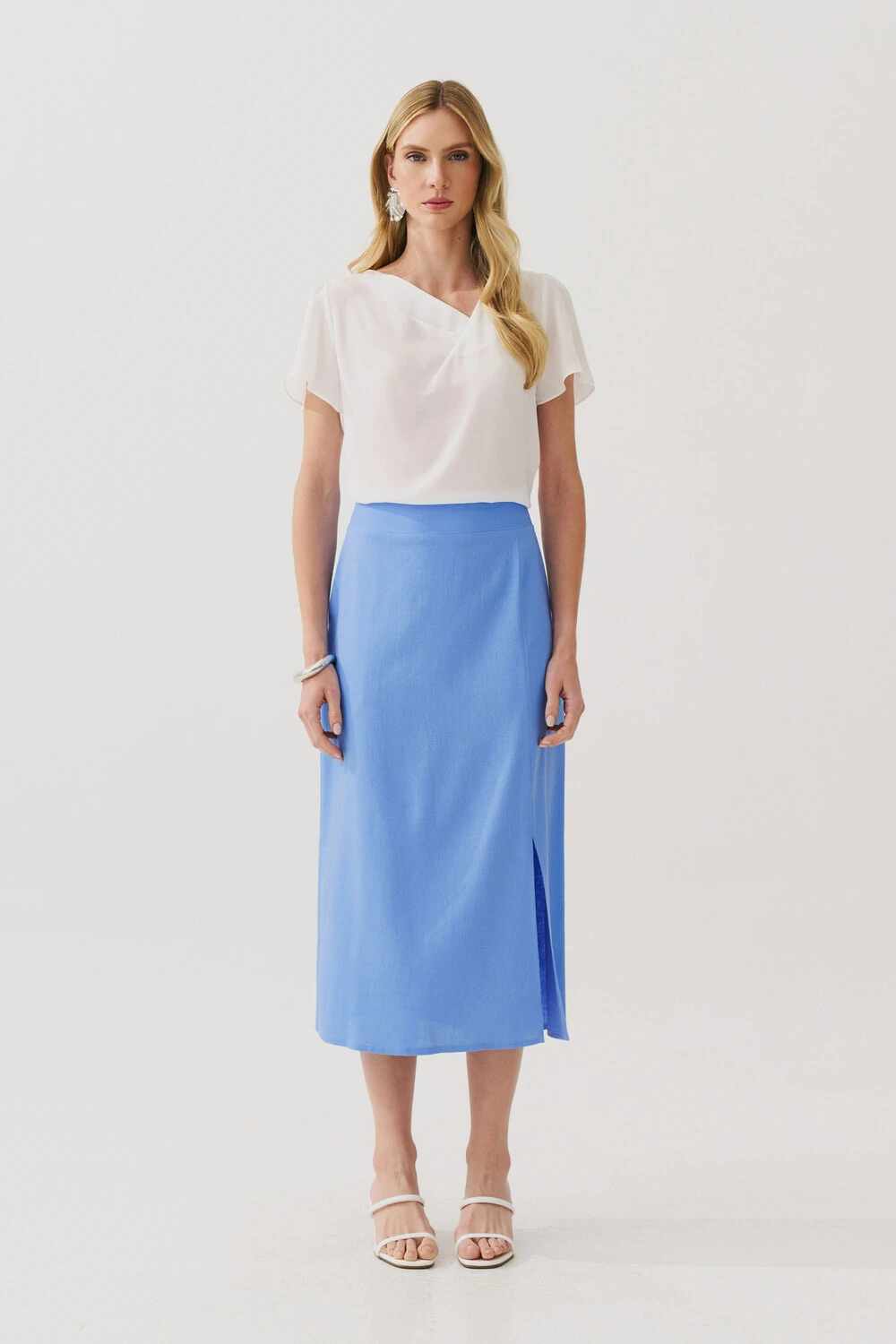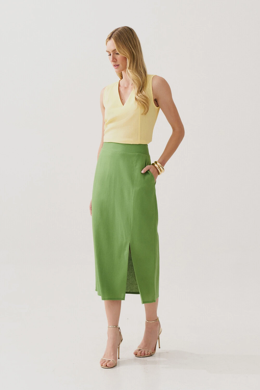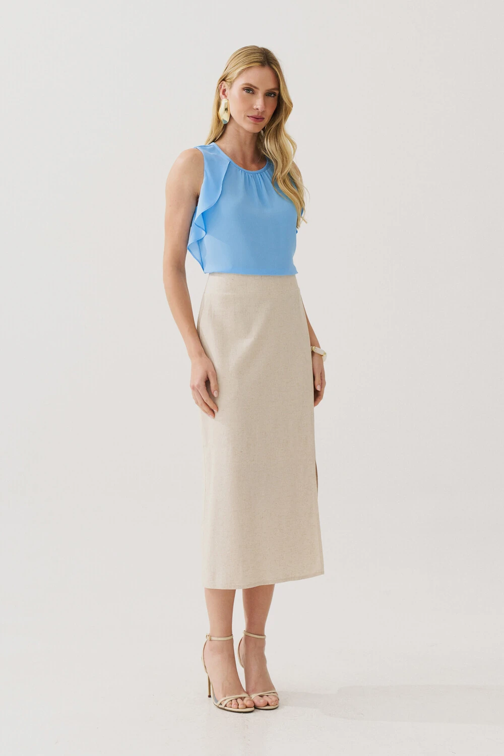 Saia midi de linho com fenda lateral. A saia contém o ziper invisível nas costas.
