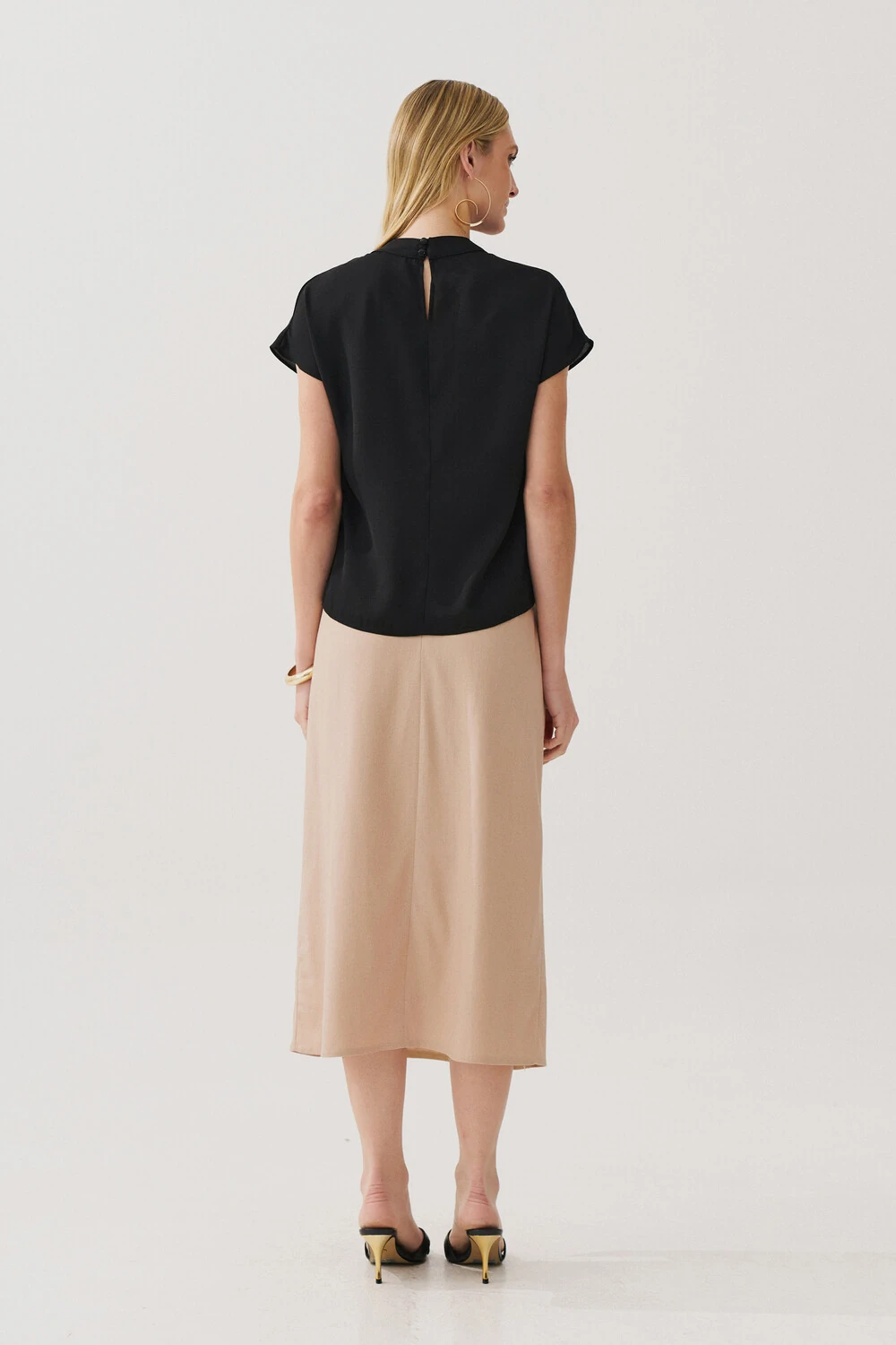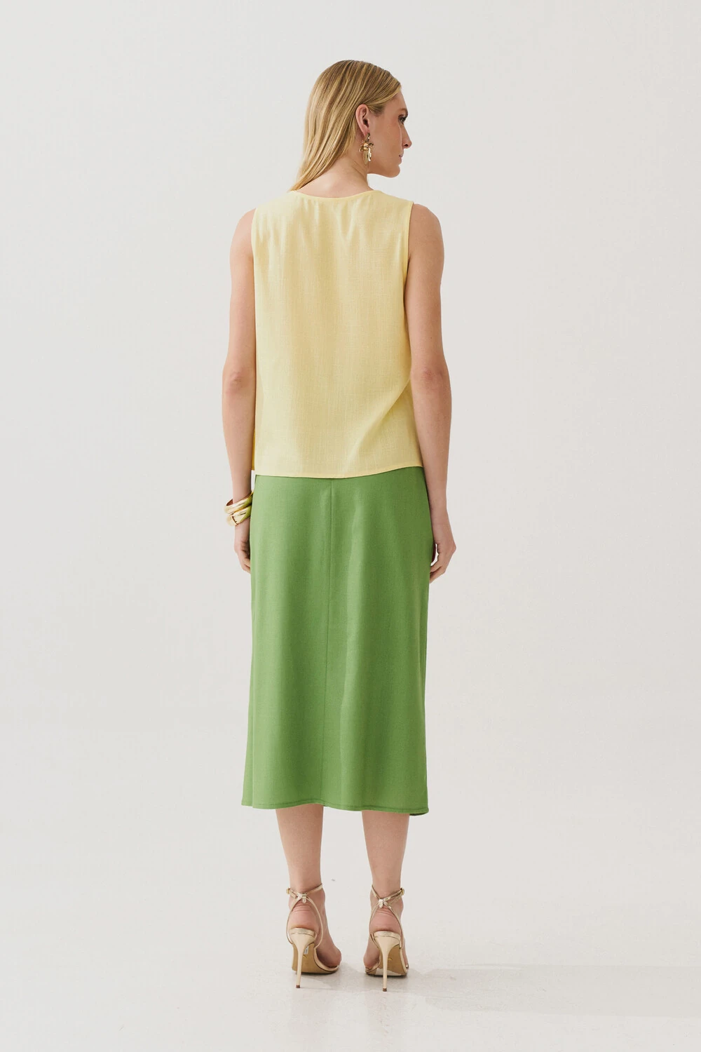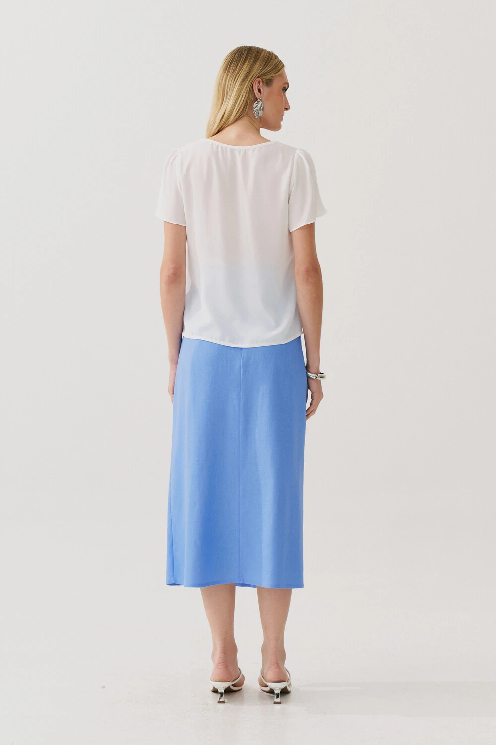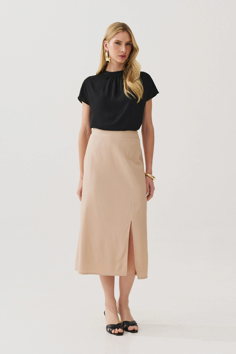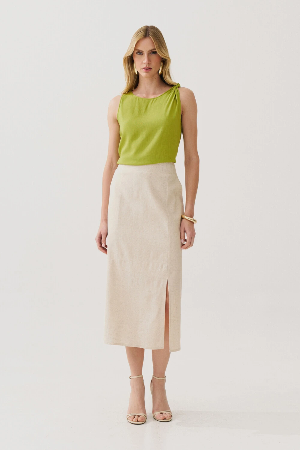 Saia midi de linho com fenda lateral. A saia contém o ziper invisível nas costas.