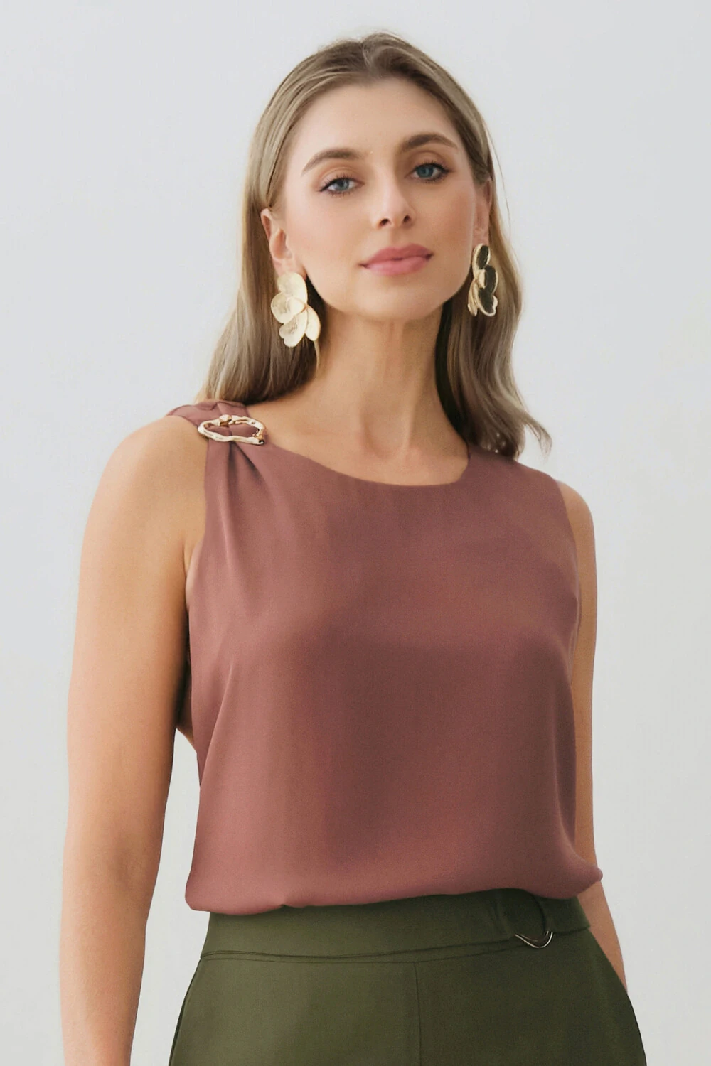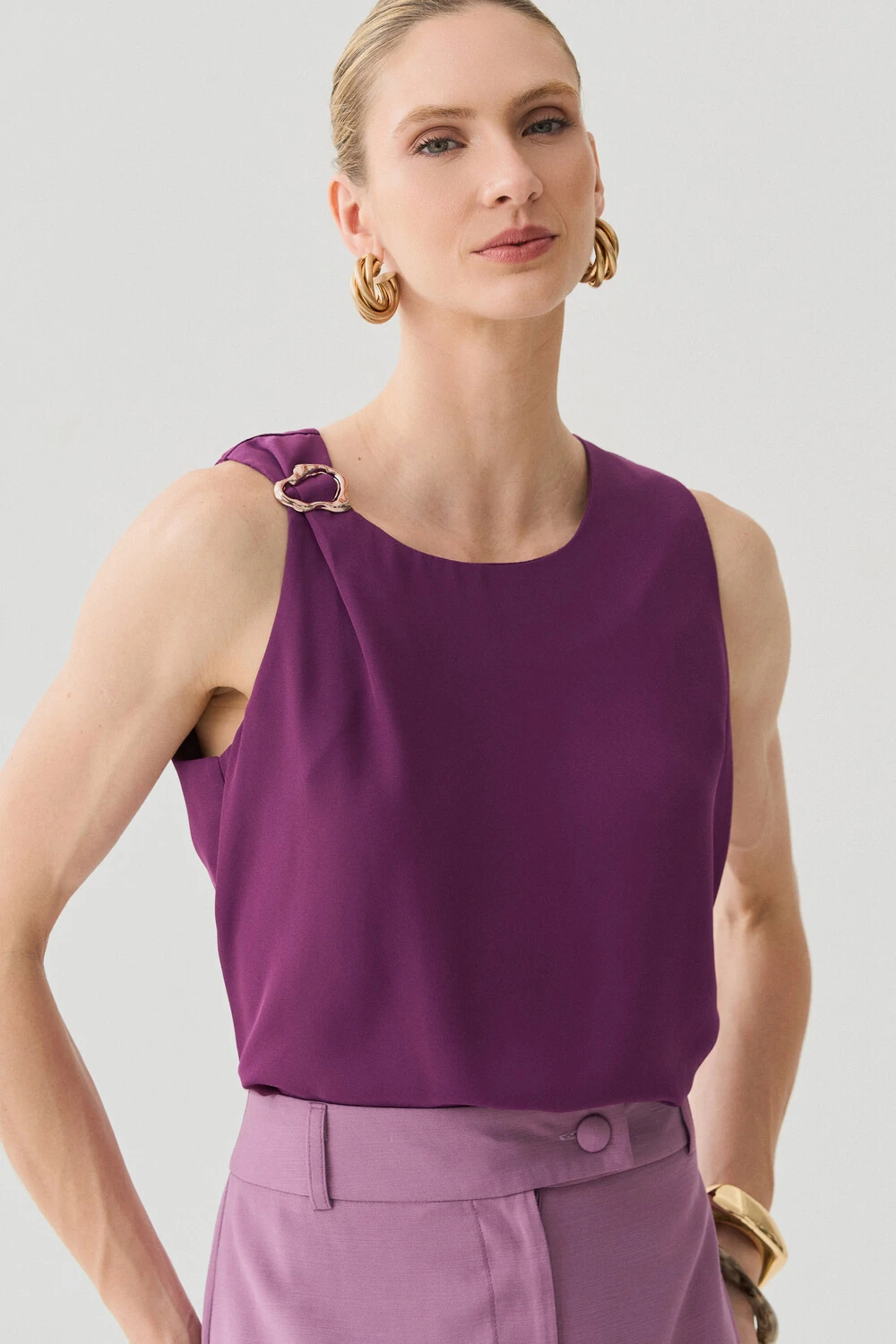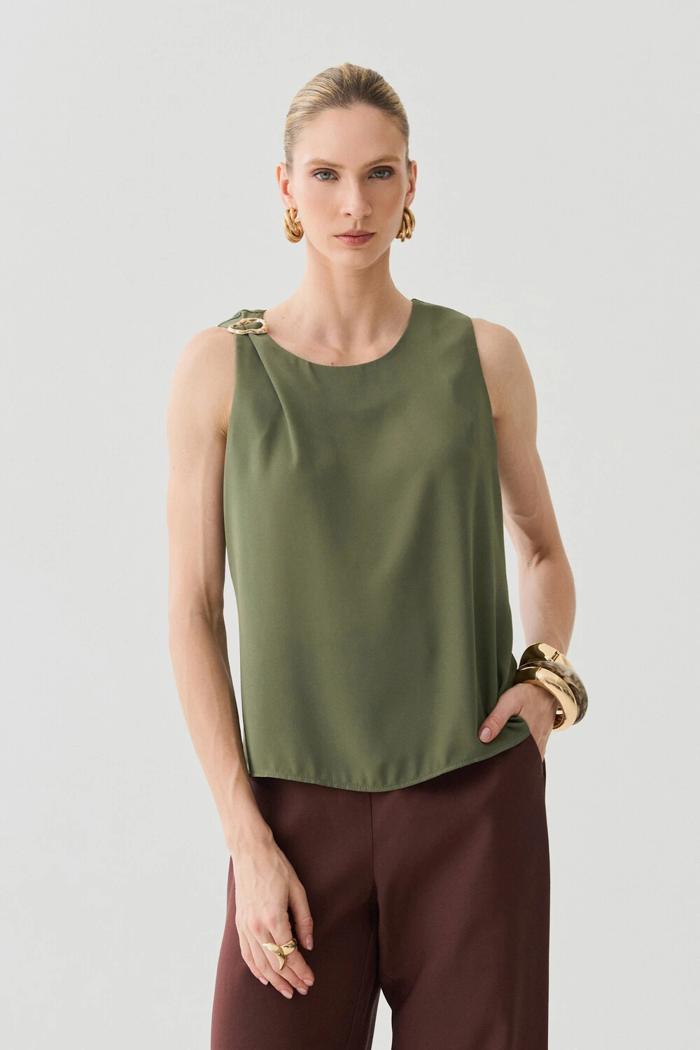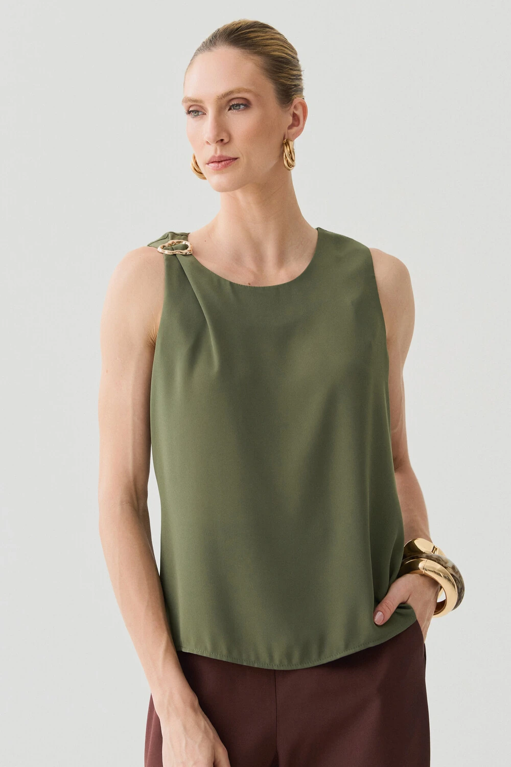 Possui detalhe metálico dourado aplicado no ombro direito, agregando sofisticação e ponto de destaque à peça.
