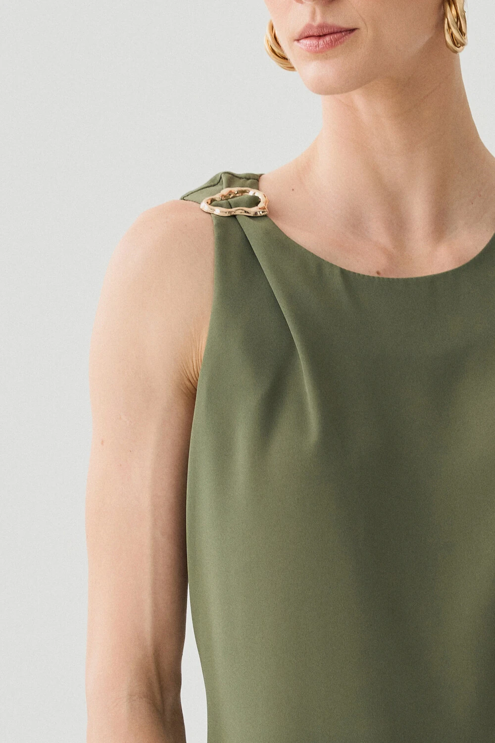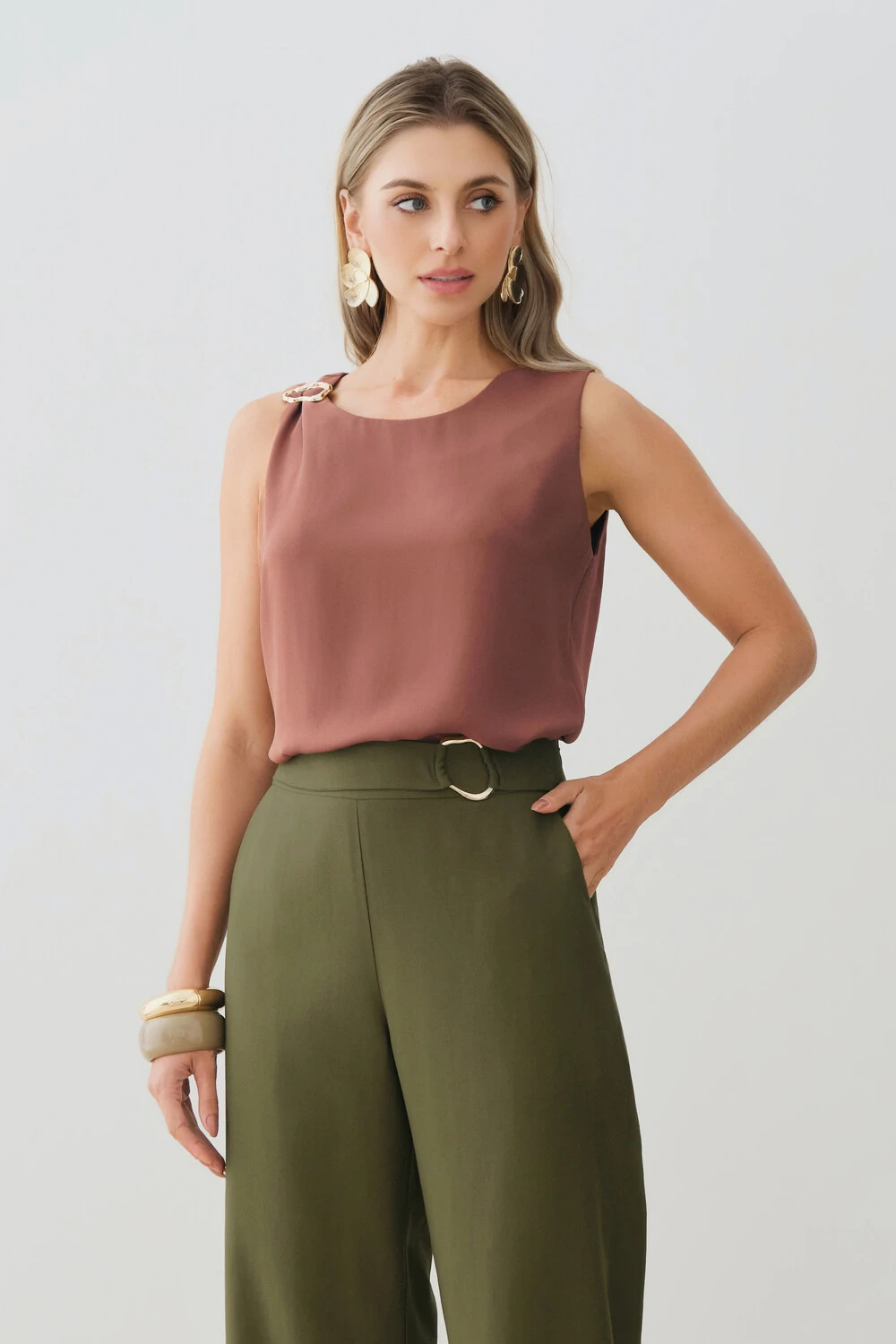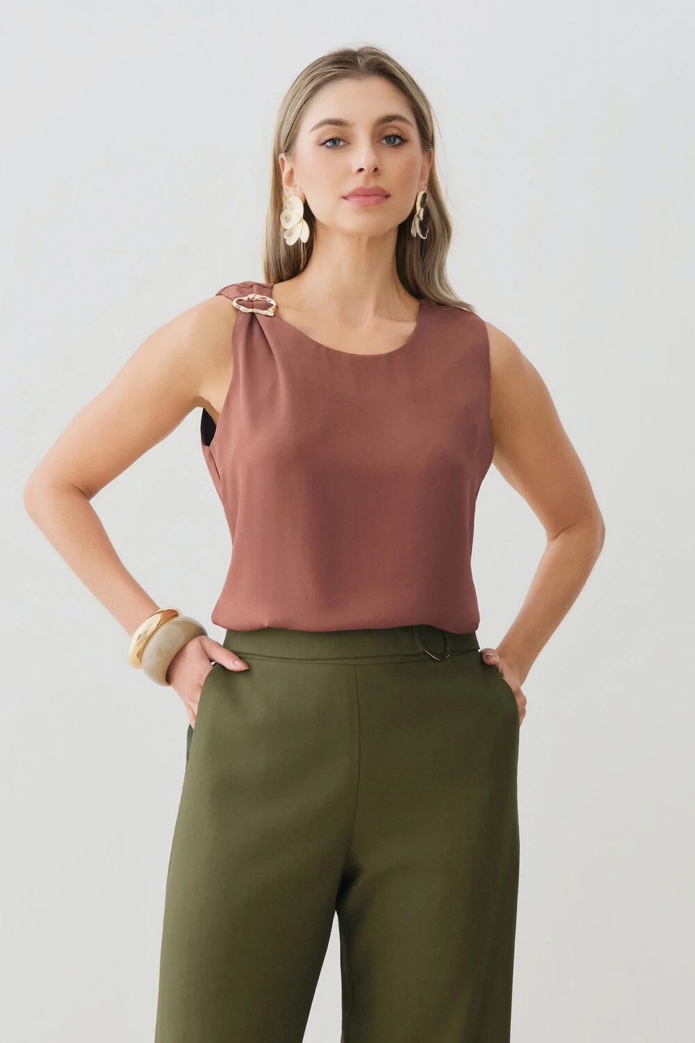 Possui detalhe metálico dourado aplicado no ombro direito, agregando sofisticação e ponto de destaque à peça.