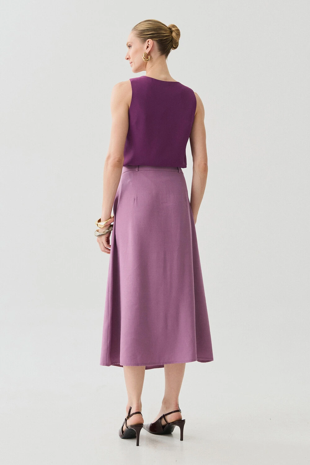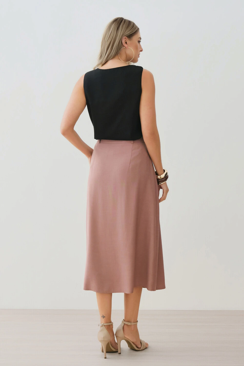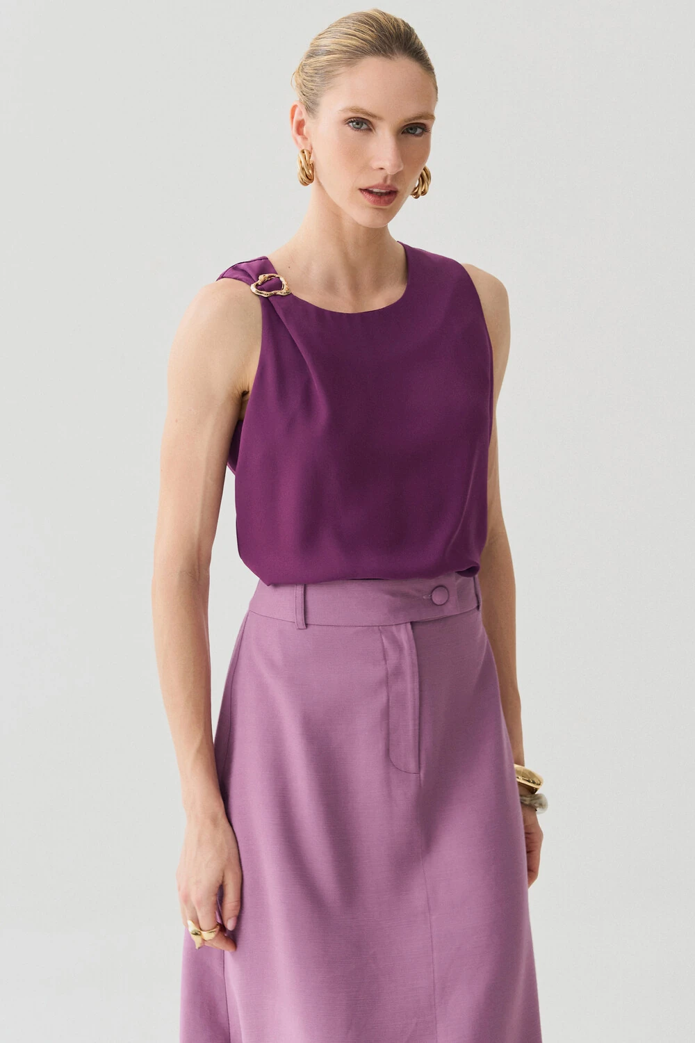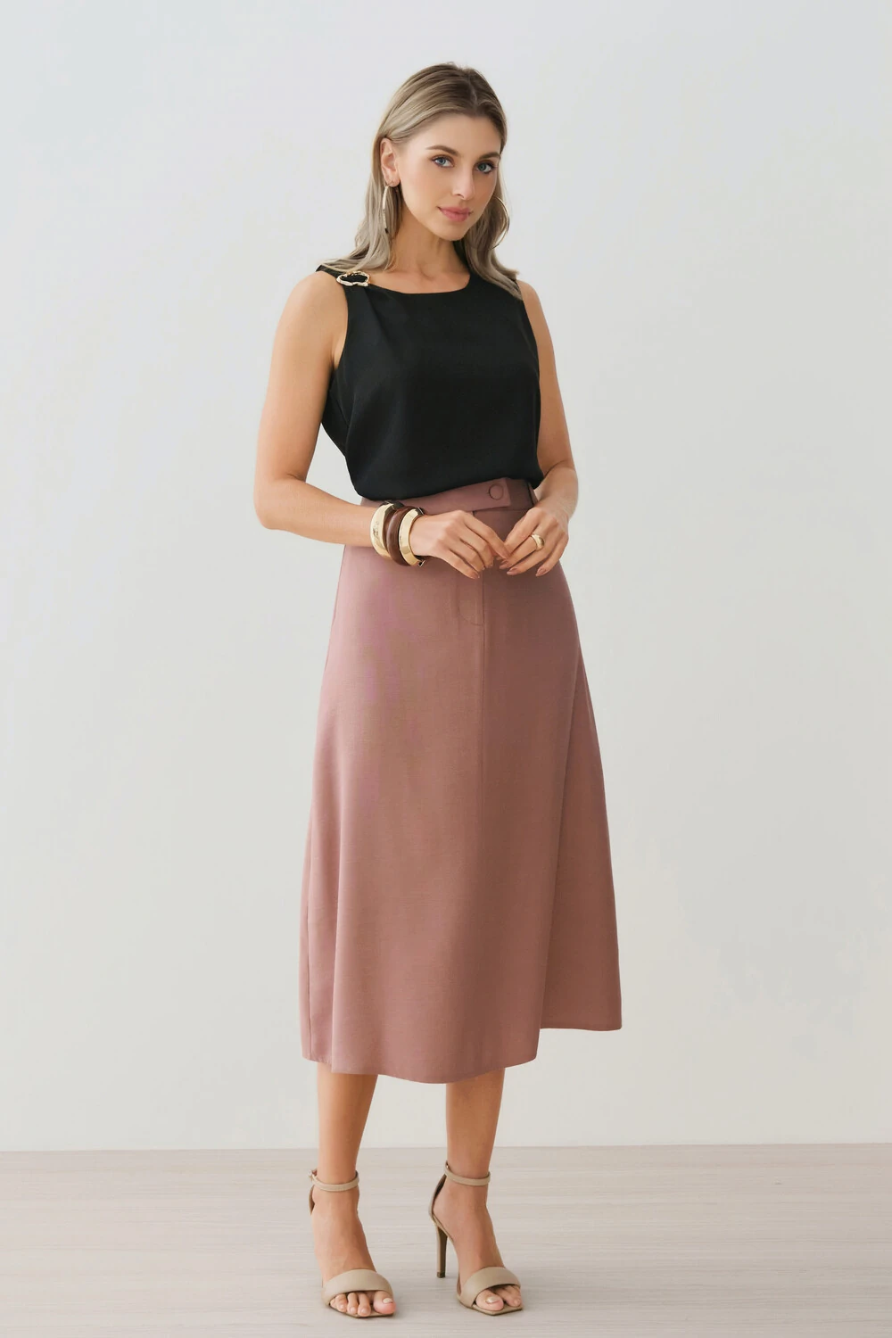Possui detalhe metálico dourado aplicado no ombro direito, agregando sofisticação e ponto de destaque à peça.