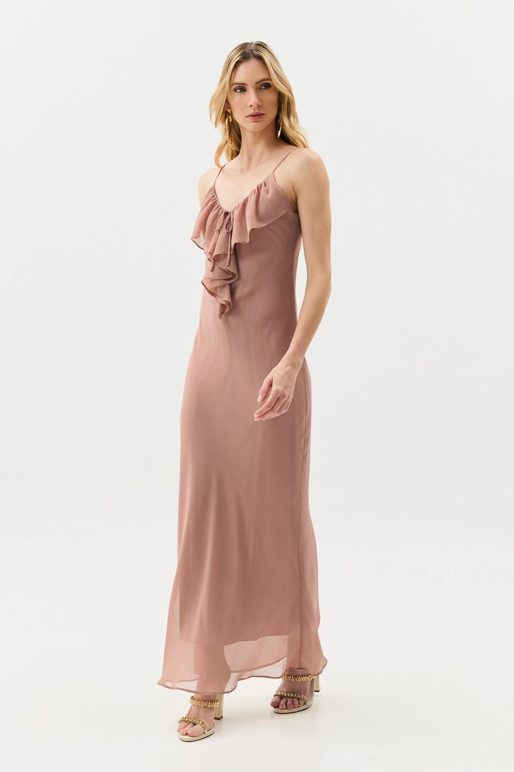 Vestido longo de alcinha de chiffon yoryu decote v com babado e laço.