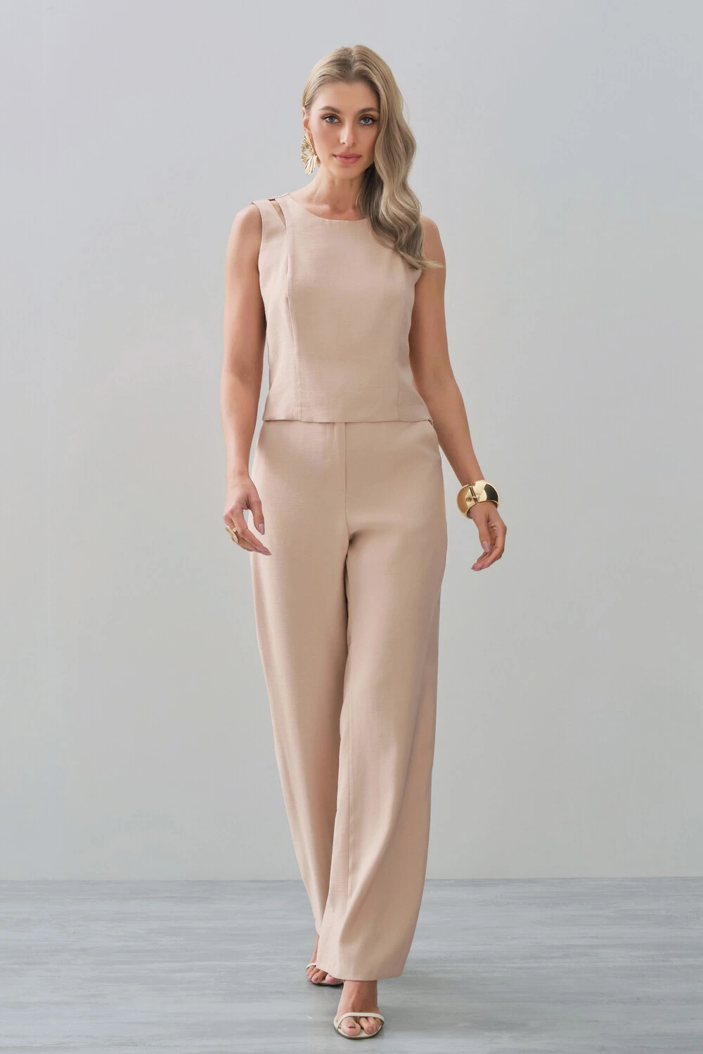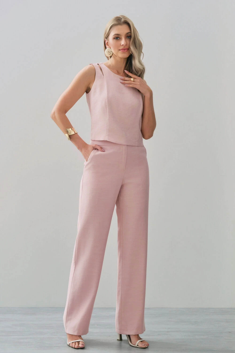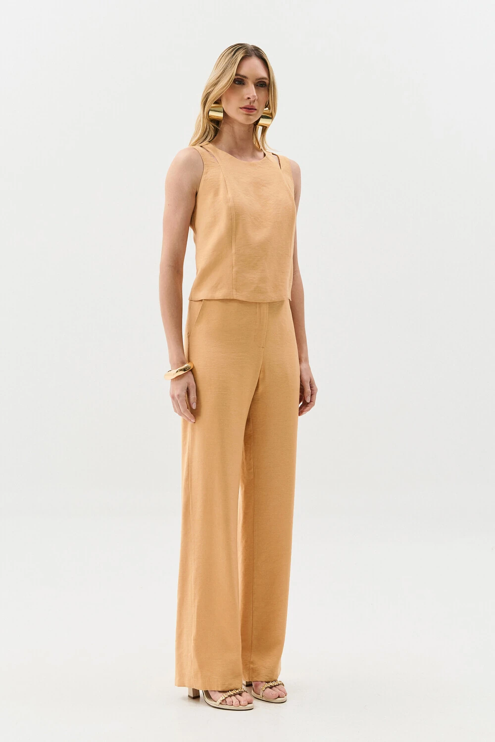 Conjunto de blusa regata crop ombro cut out com recorte e calça reta com botão forrado.