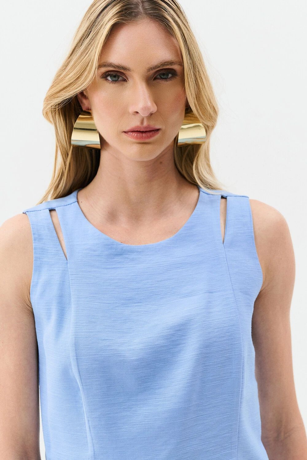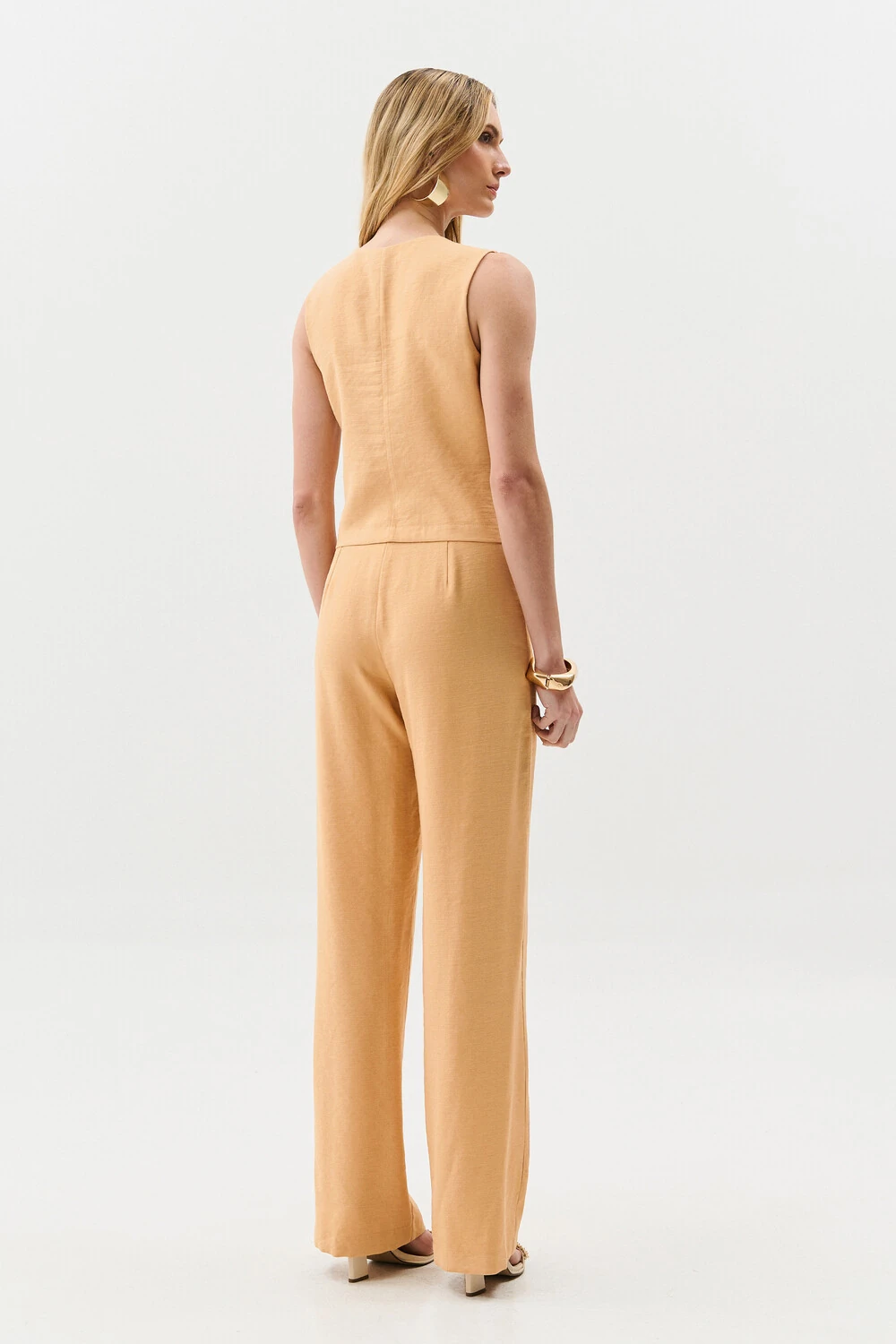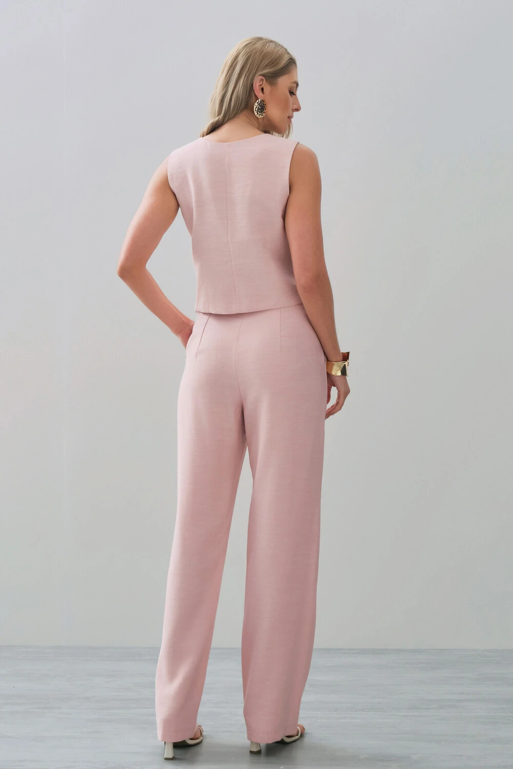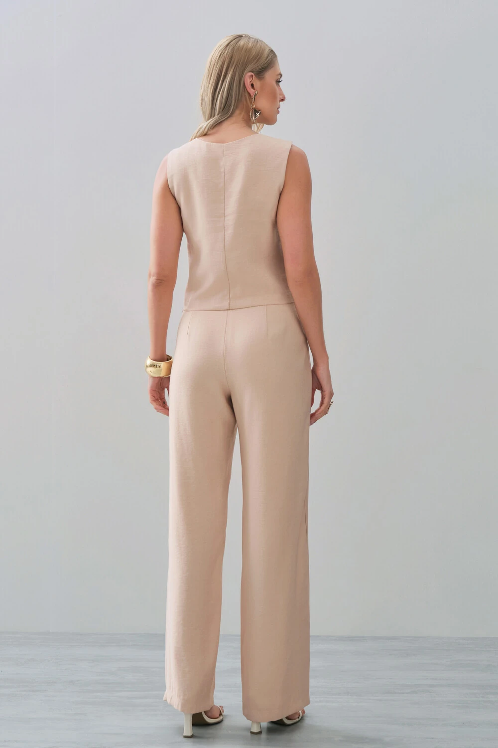 Conjunto de blusa regata crop ombro cut out com recorte e calça reta com botão forrado.