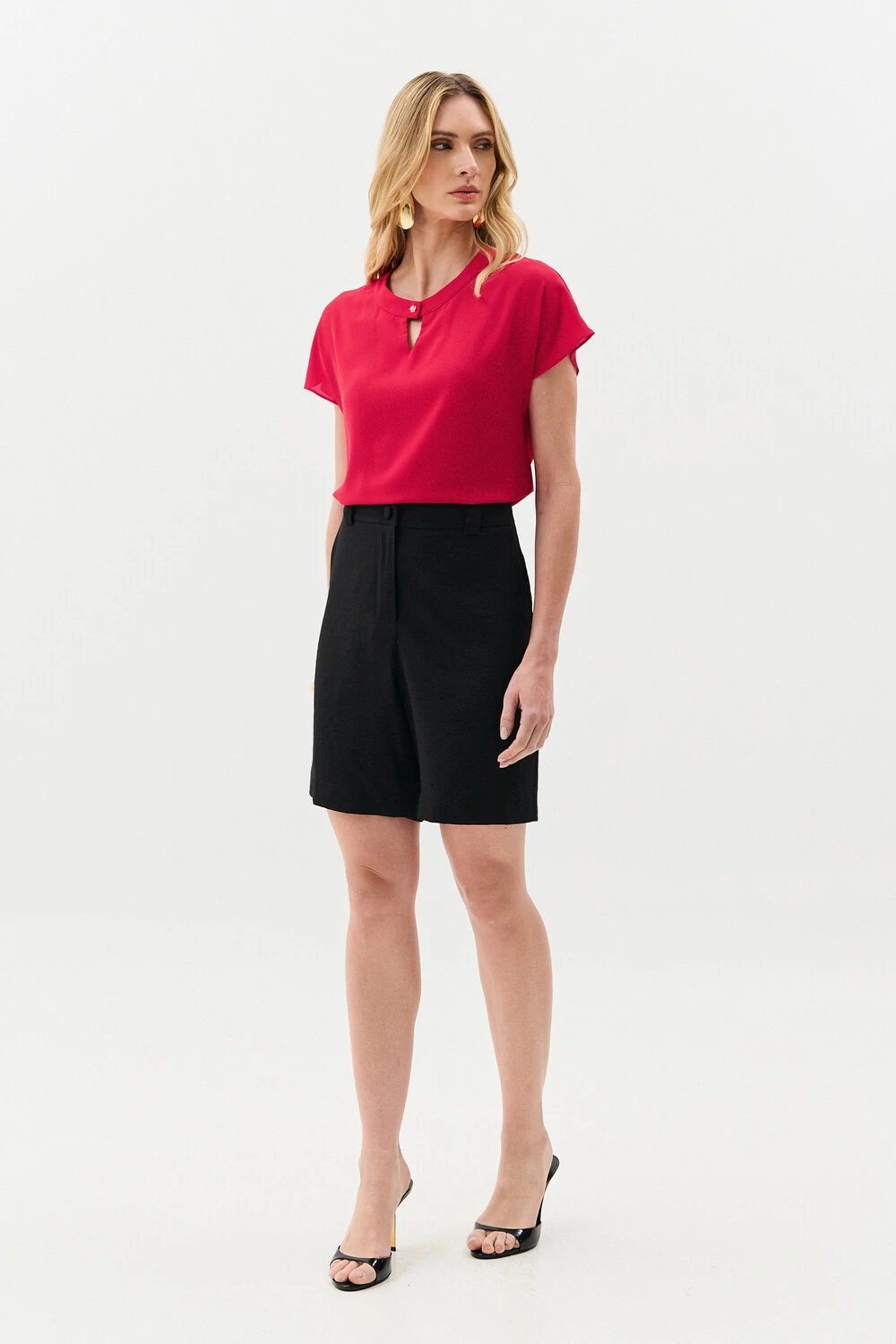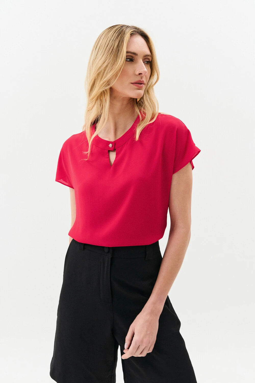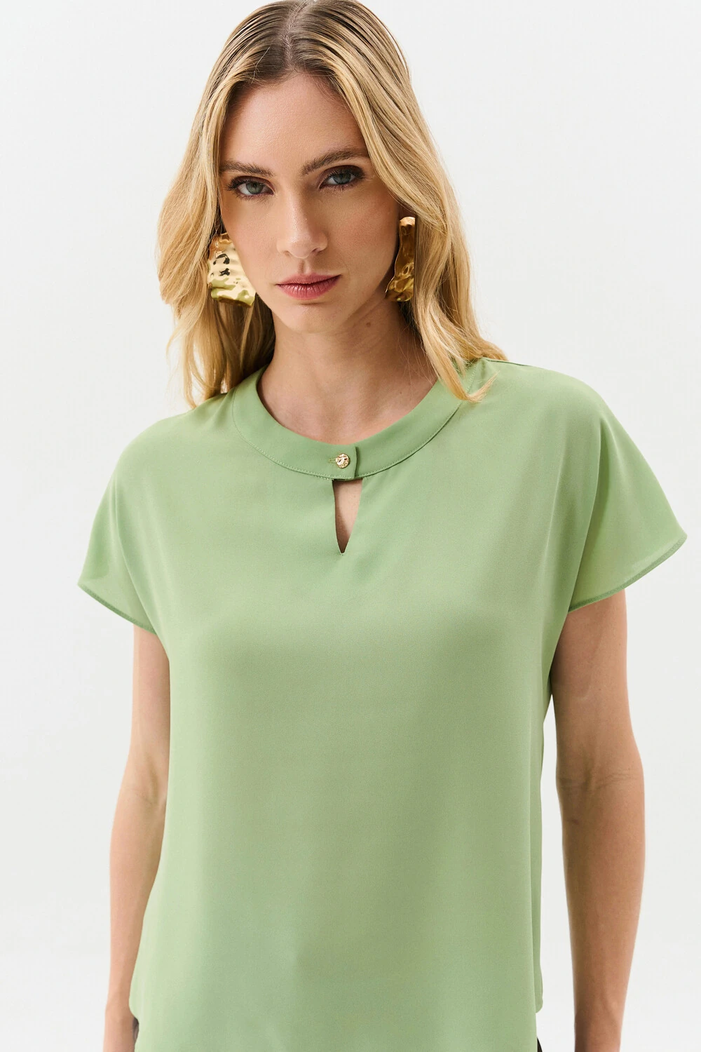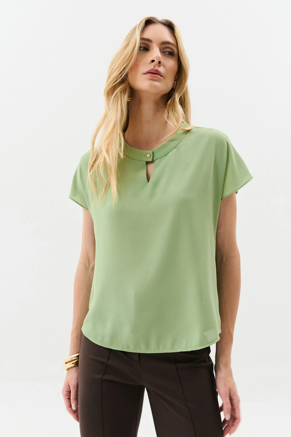 Blusa manga morcego decote redondo vazado com pala e botão dourado.