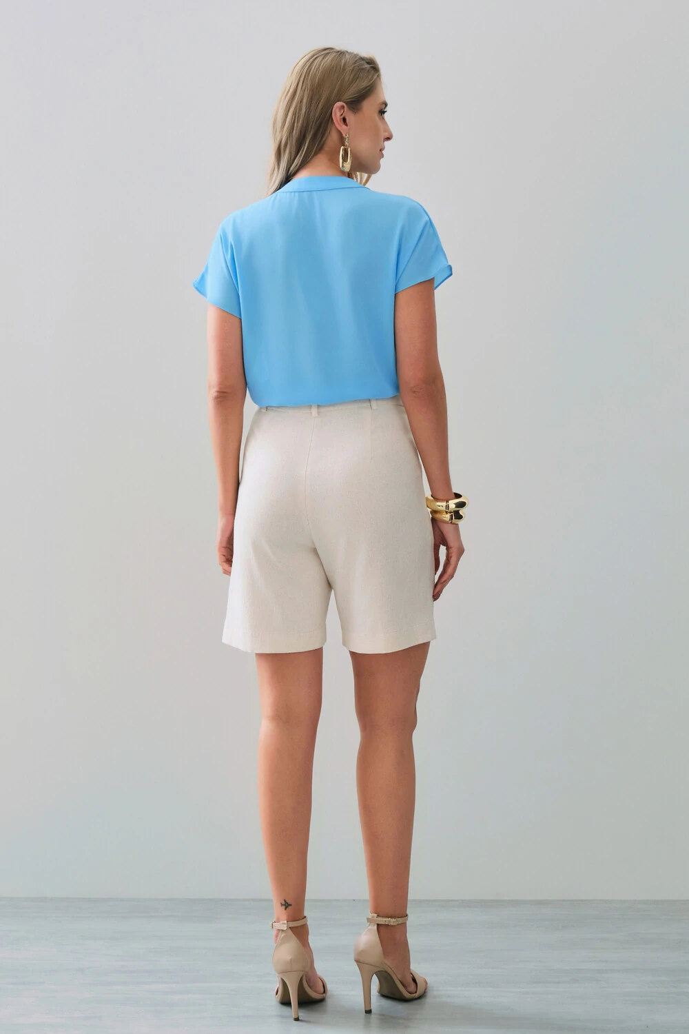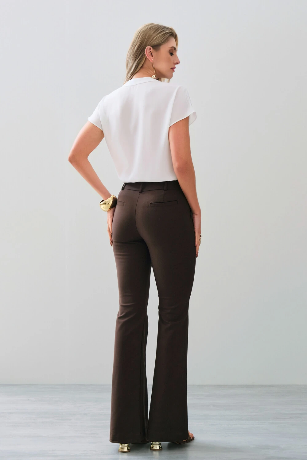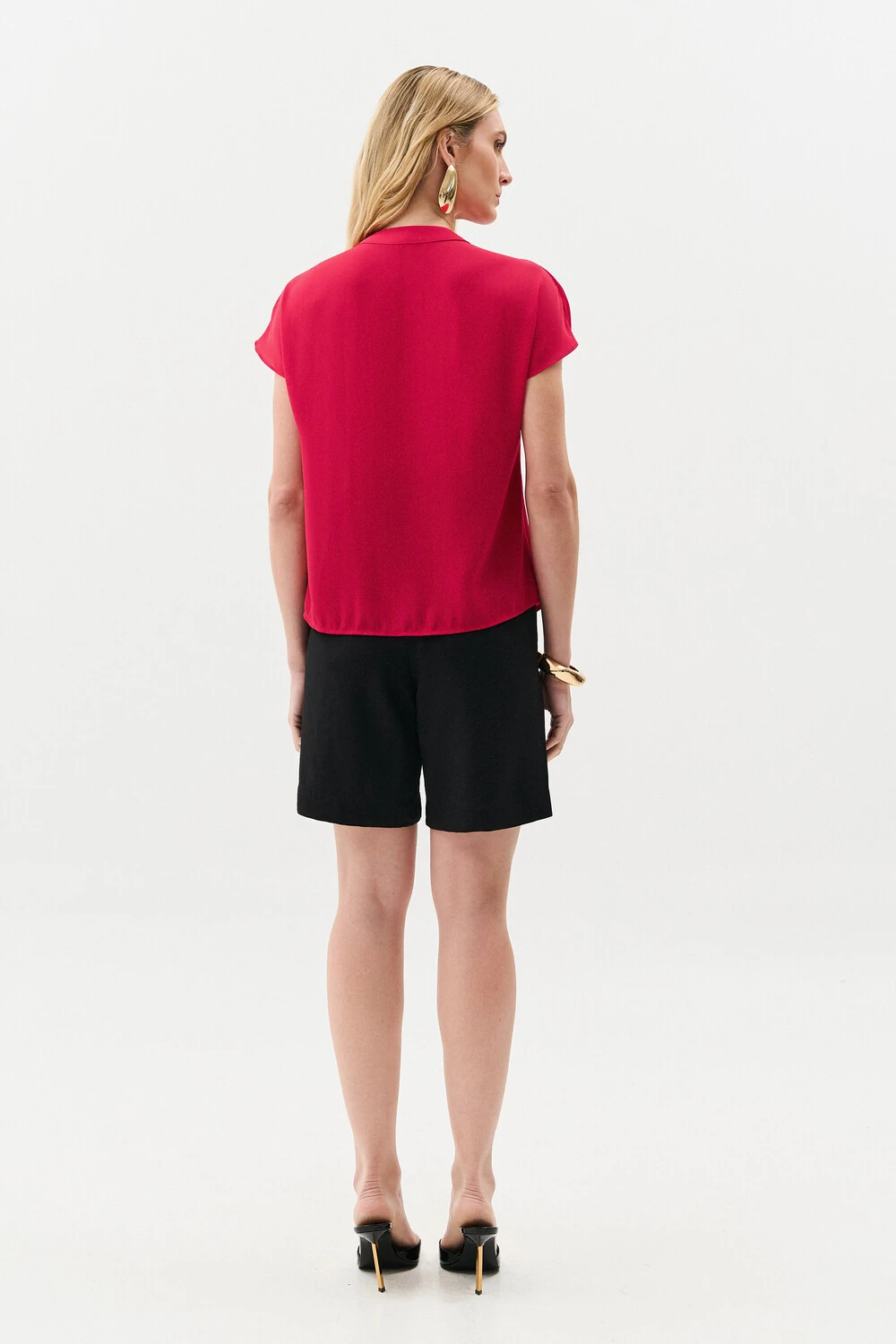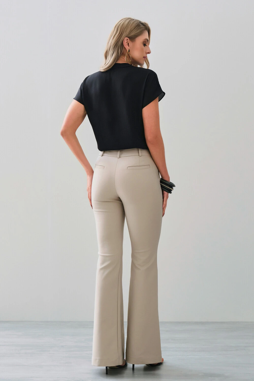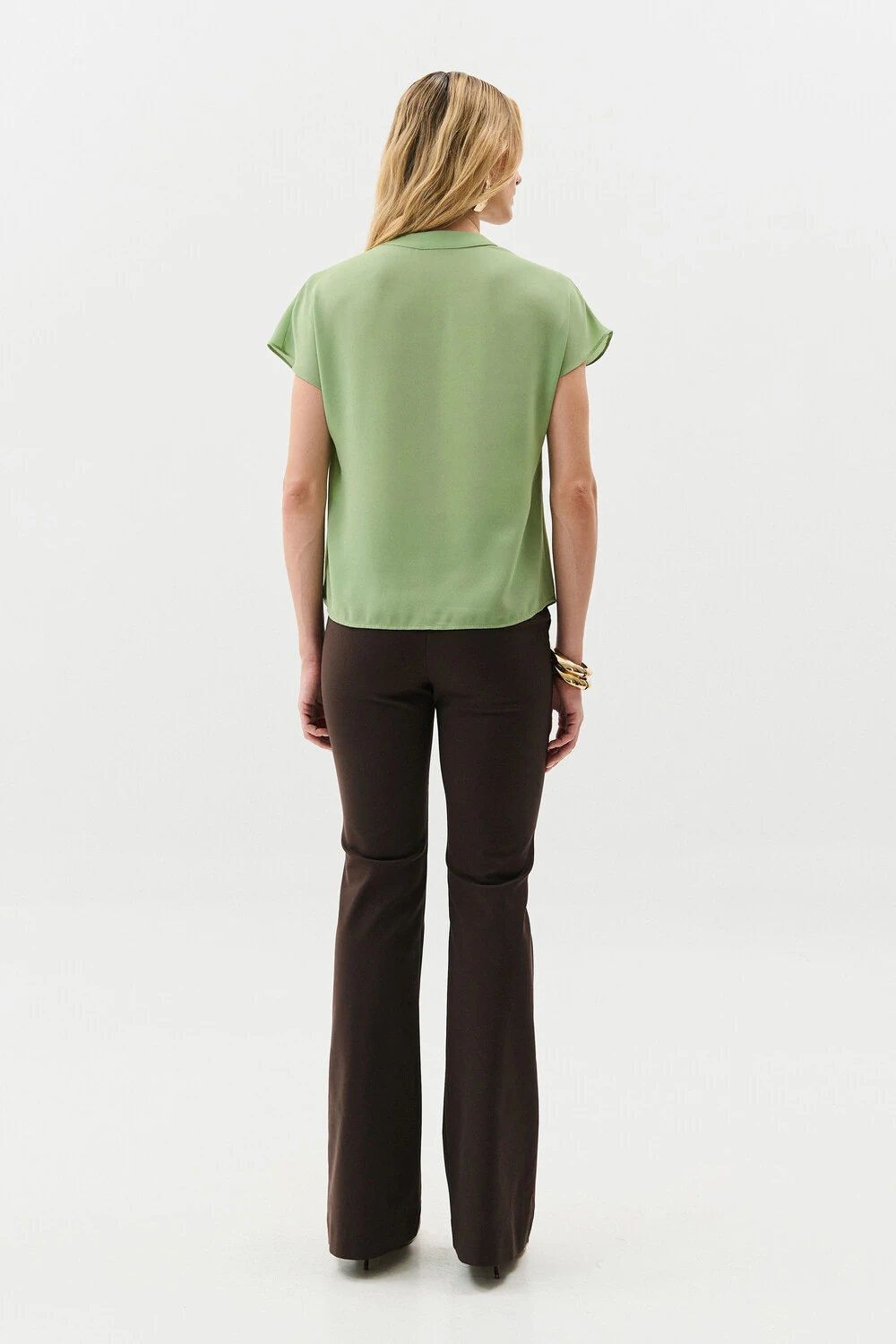 Blusa manga morcego decote redondo vazado com pala e botão dourado.