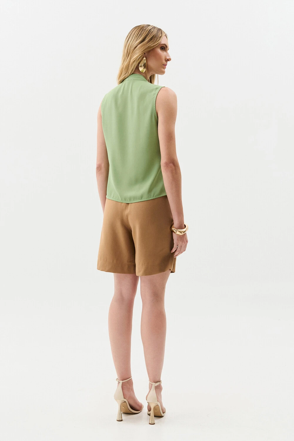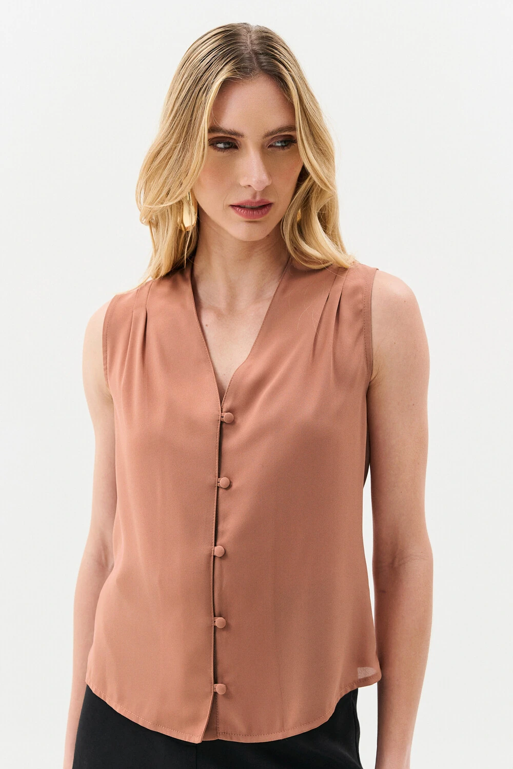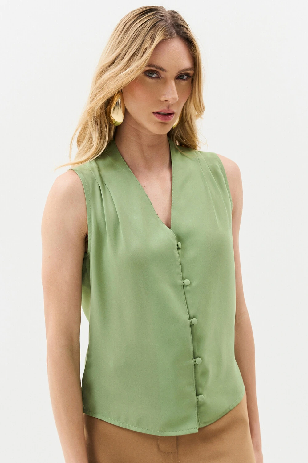 Camisa regata decote v com mini botões forrados e ombro com pregas.