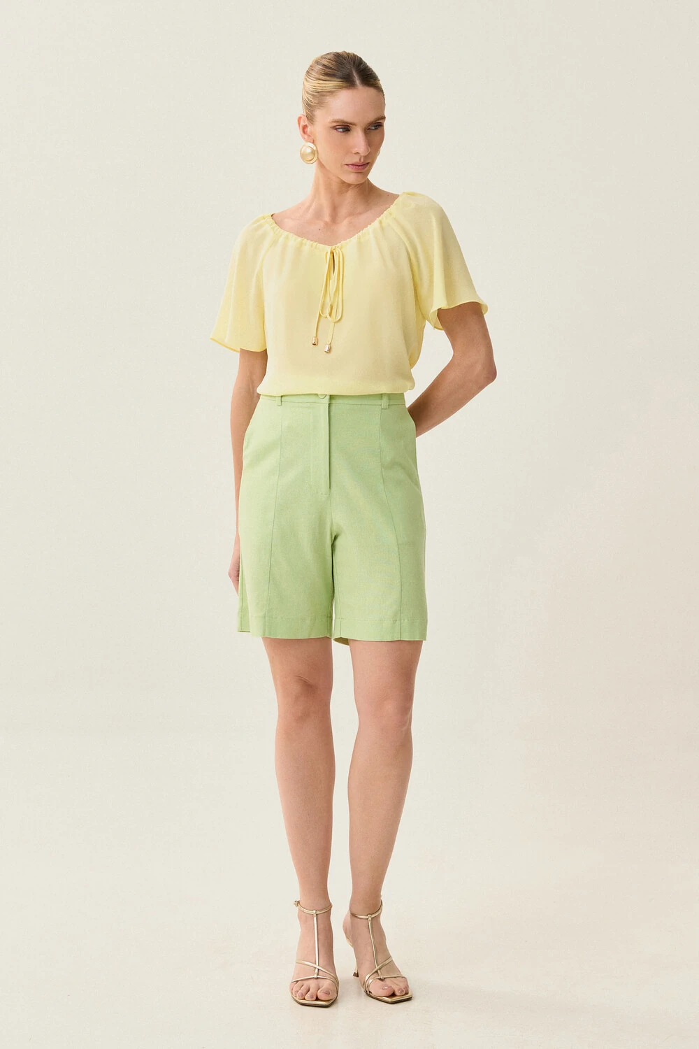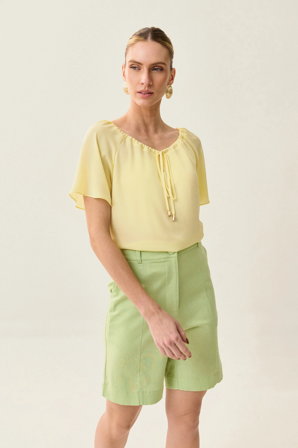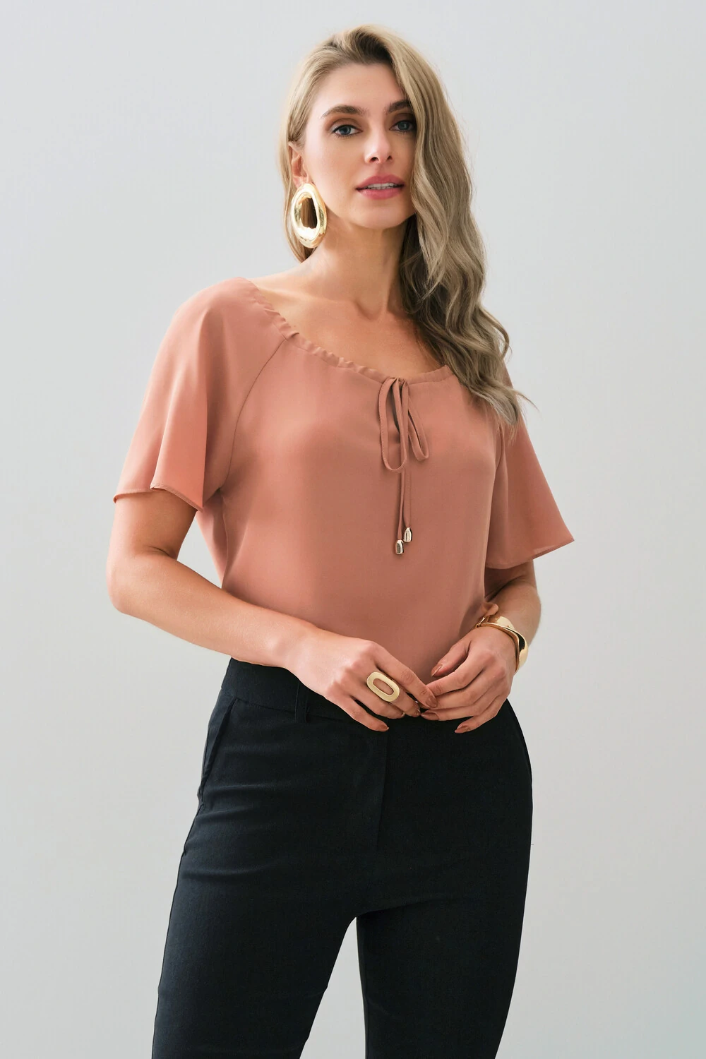 Blusa manga raglan decote canoa com laço puxante com ponteira dourada.