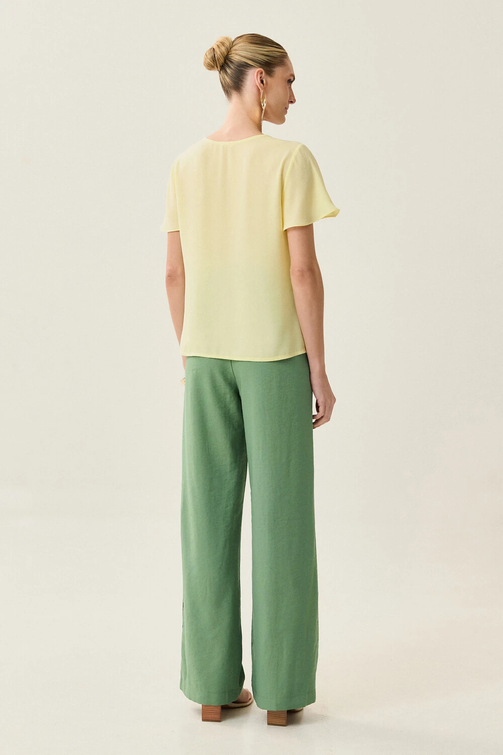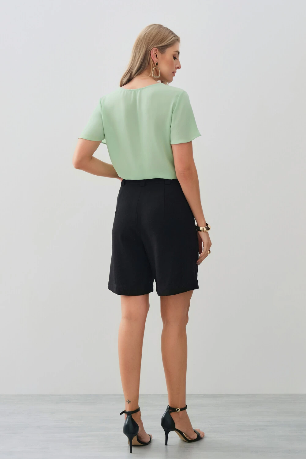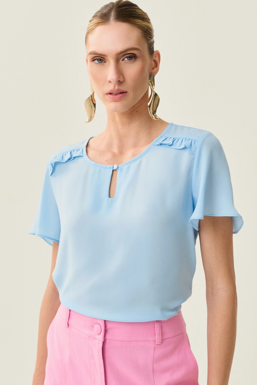 Blusa decote vazado em formato de gota com mini botão e ombro com babadinho.