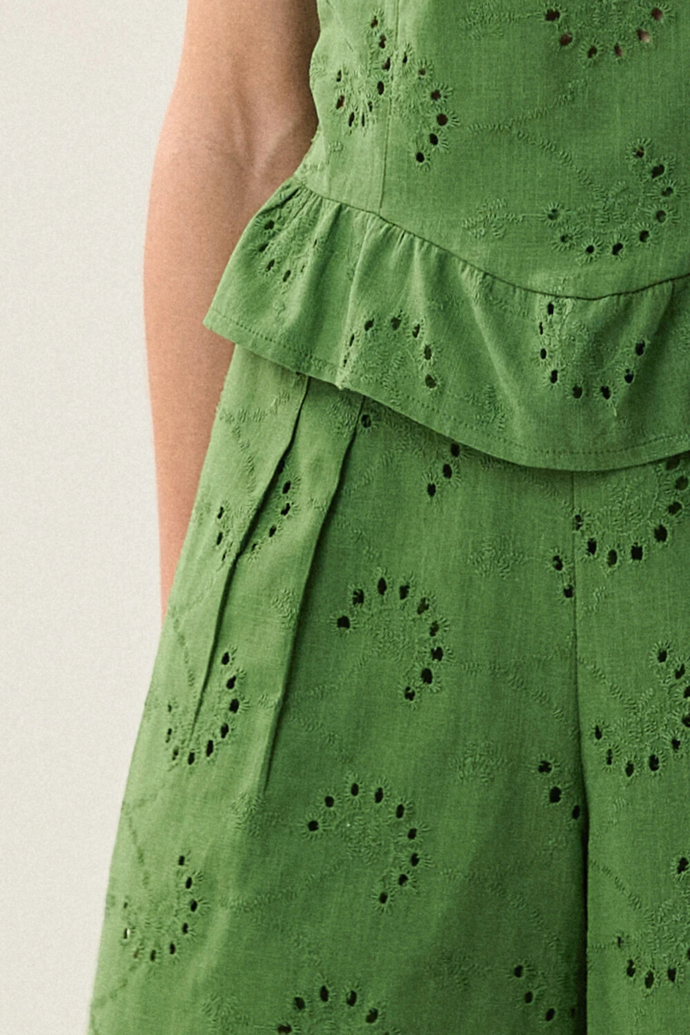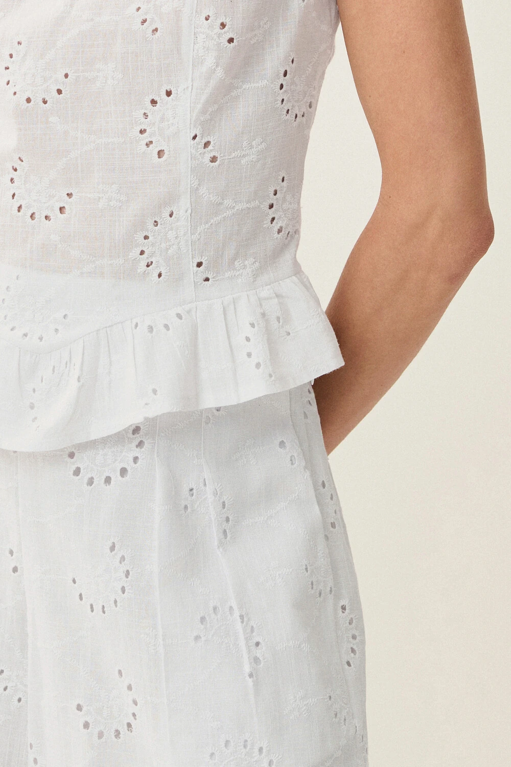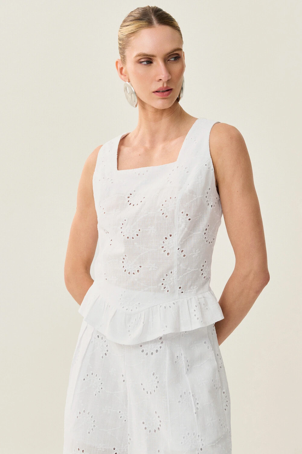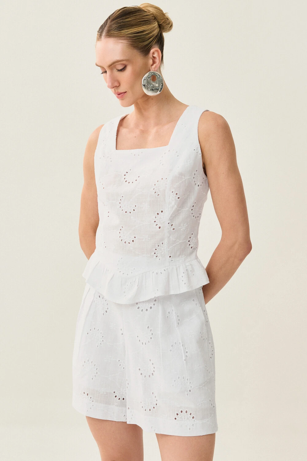 Conjunto de laise de algodão de blusa regata crop decote quadrado barra de babado e shorts com 2 pregas. A blusa e Shorts contêm o ziper invisível na lateral.