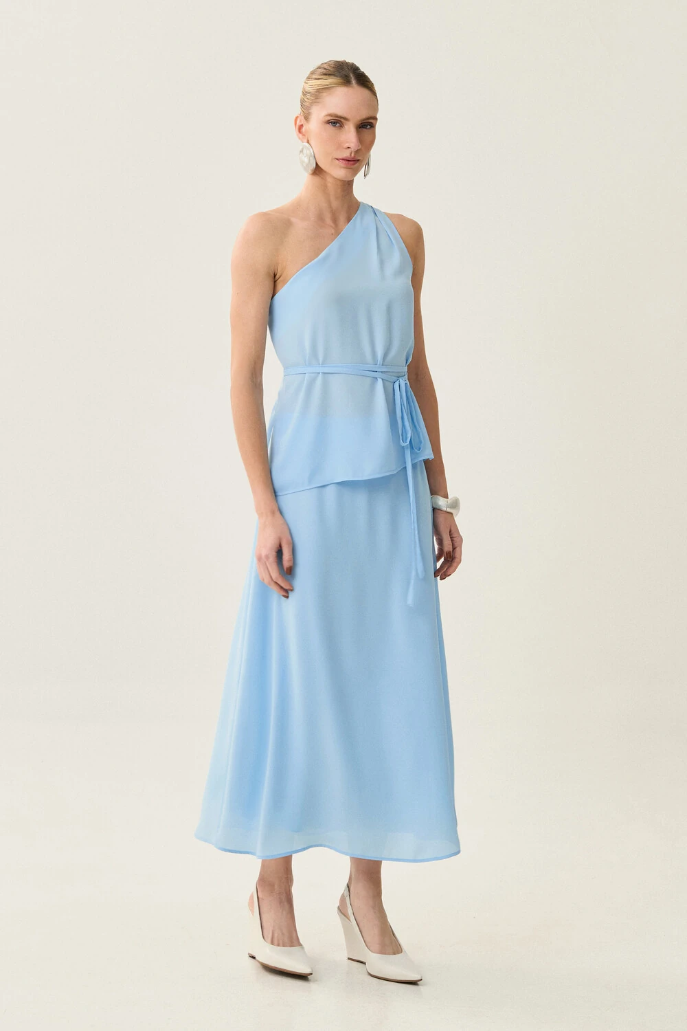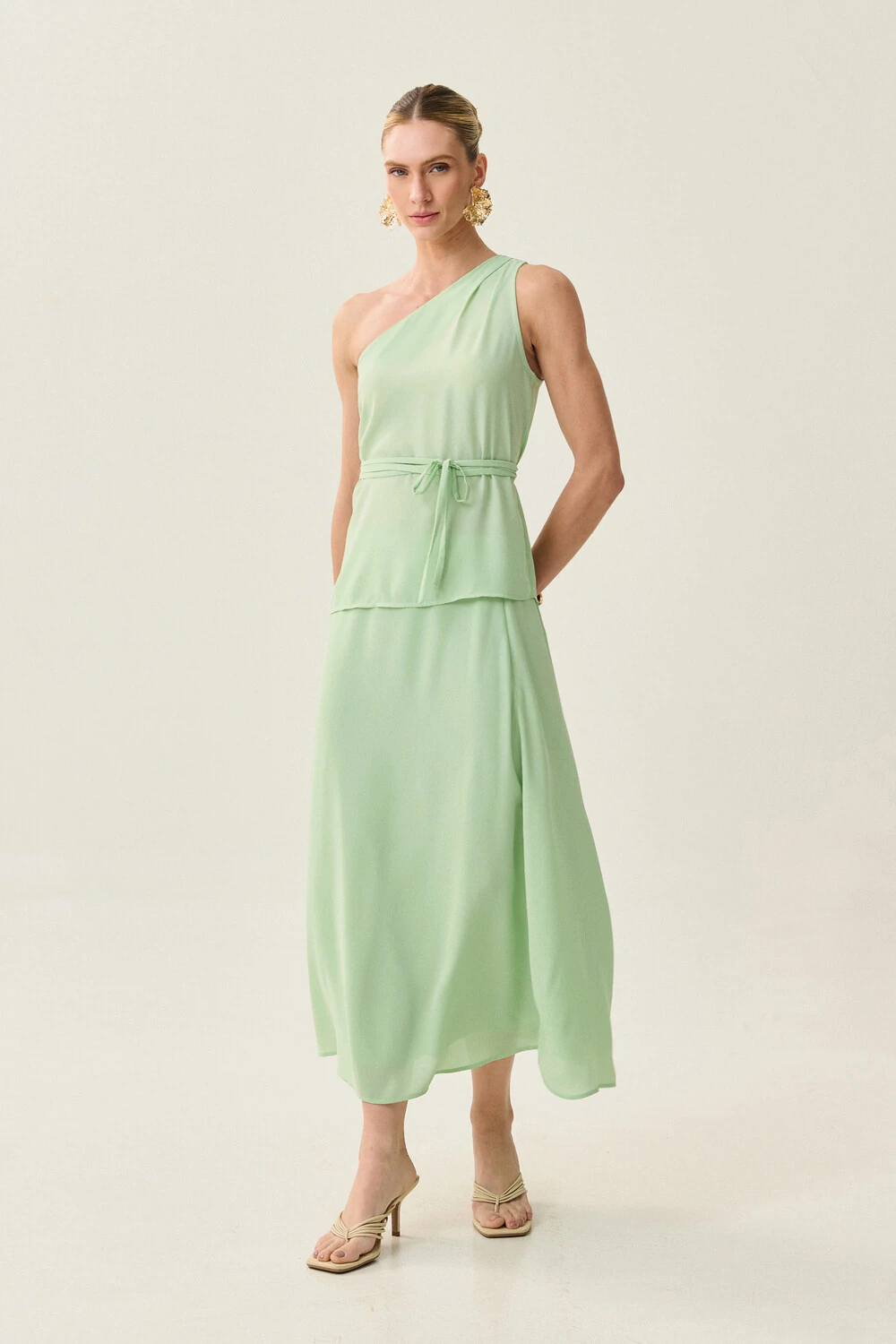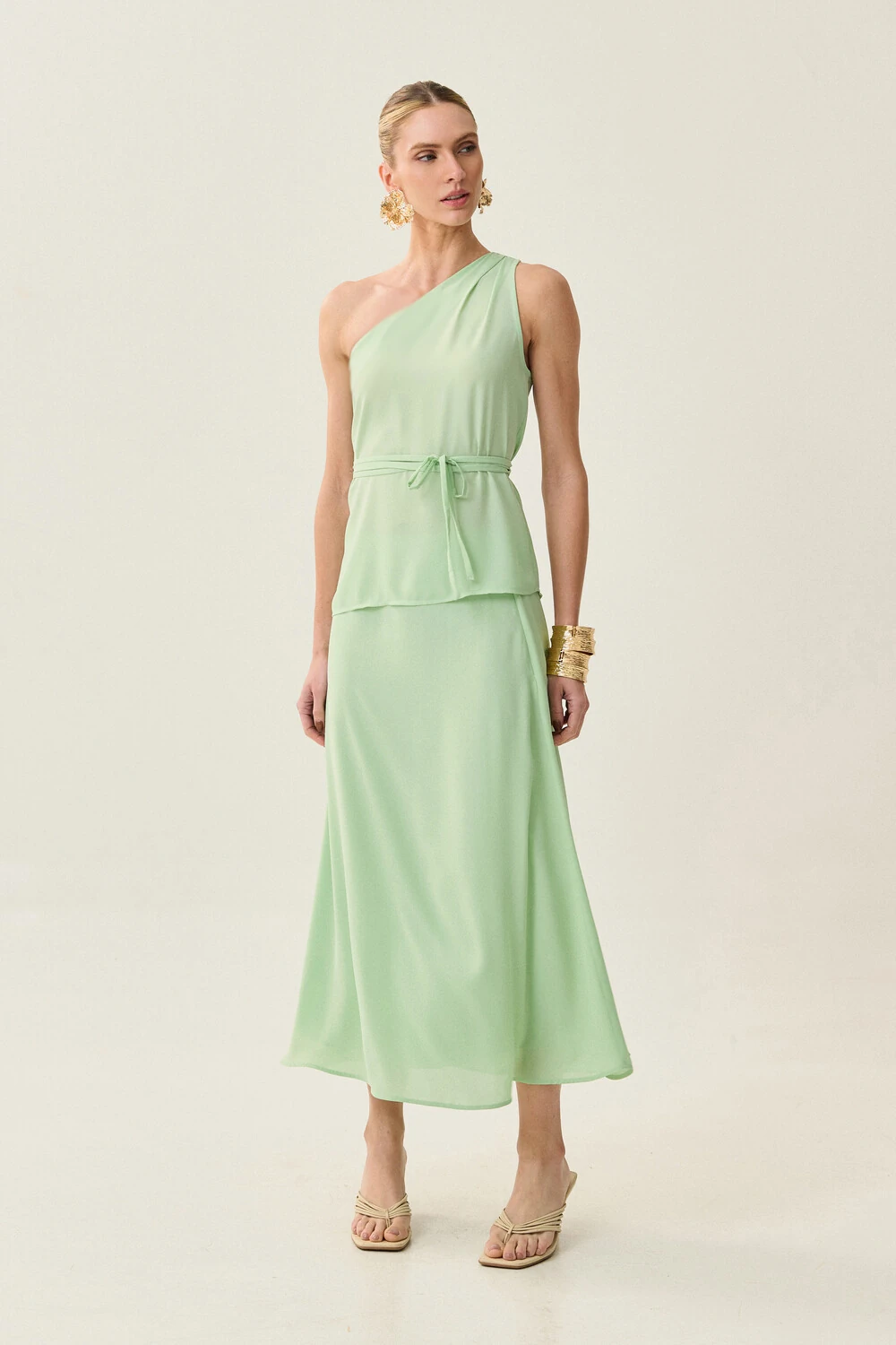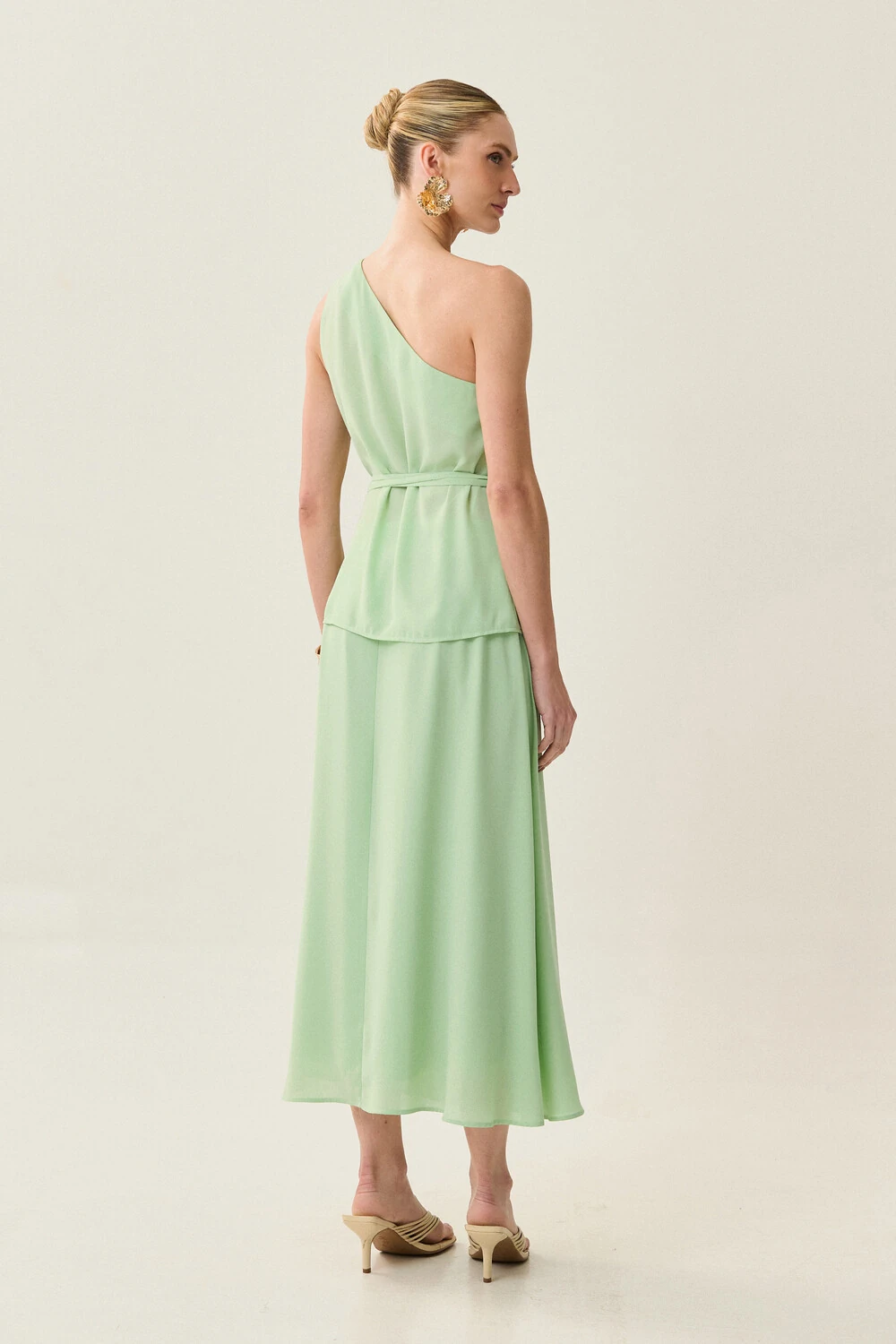 Conjunto de blusa regata assimétrica um ombro só com prega e cinto de laço comprido e saia midi. A saia contém o ziper invisível nas costas.