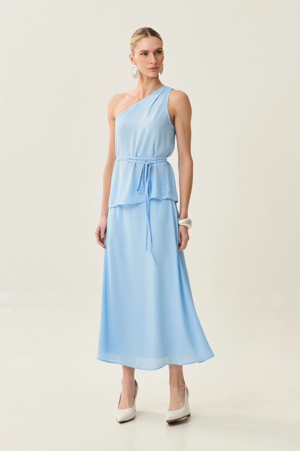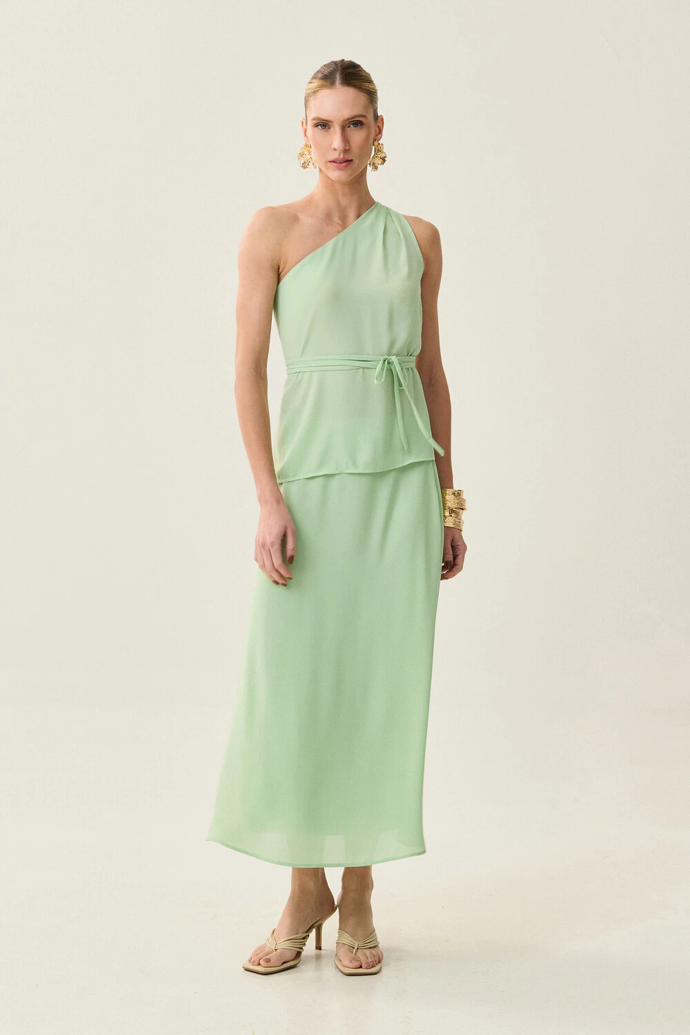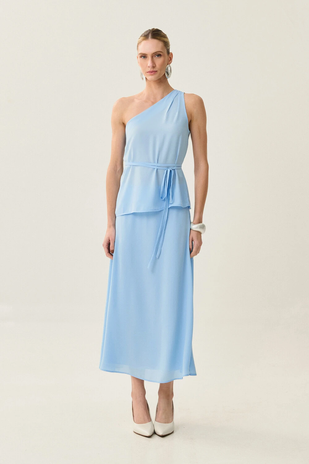 Conjunto de blusa regata assimétrica um ombro só com prega e cinto de laço comprido e saia midi. A saia contém o ziper invisível nas costas.