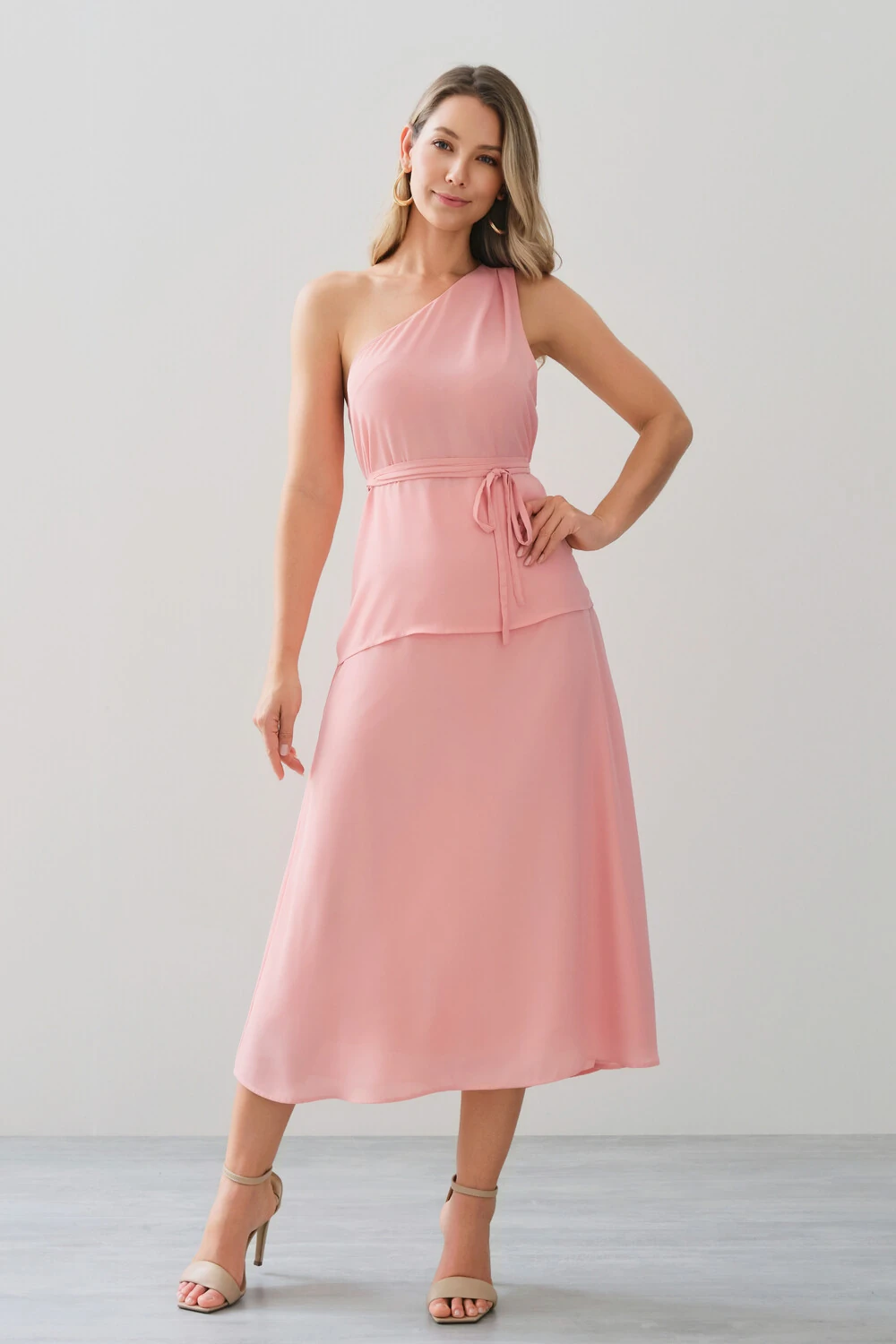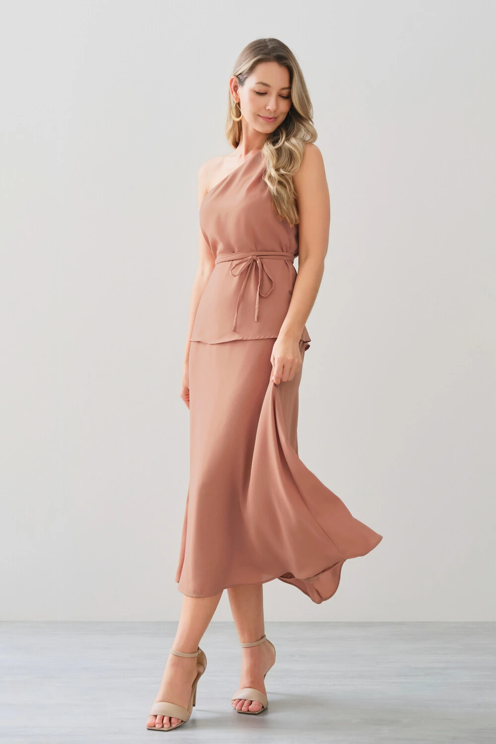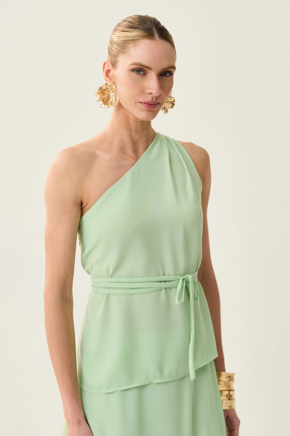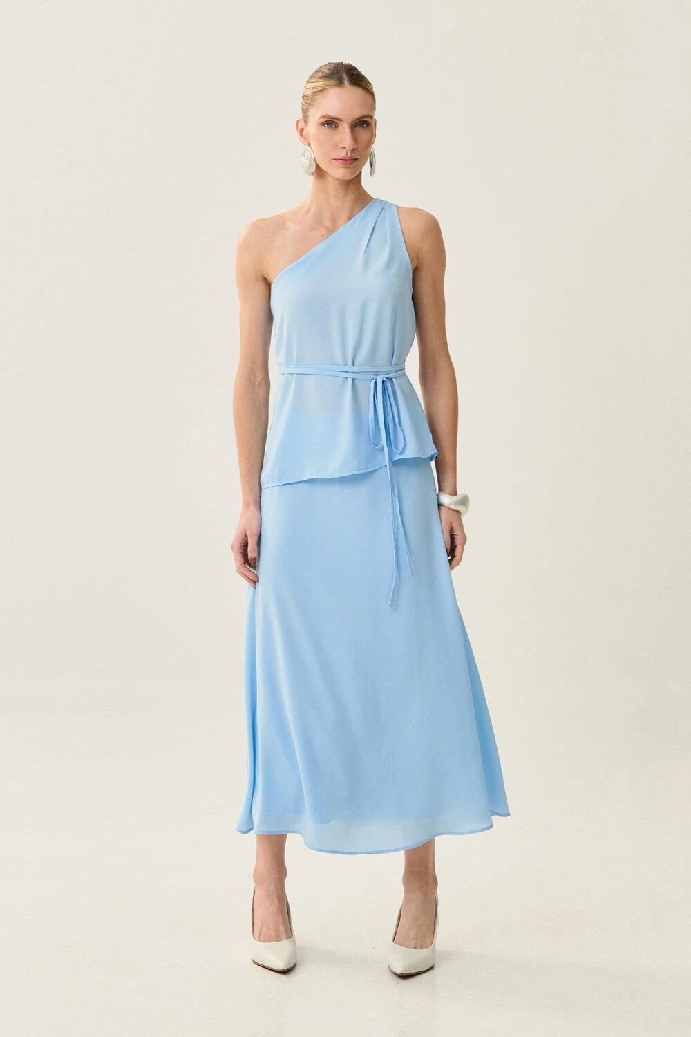 Conjunto de blusa regata assimétrica um ombro só com prega e cinto de laço comprido e saia midi. A saia contém o ziper invisível nas costas.