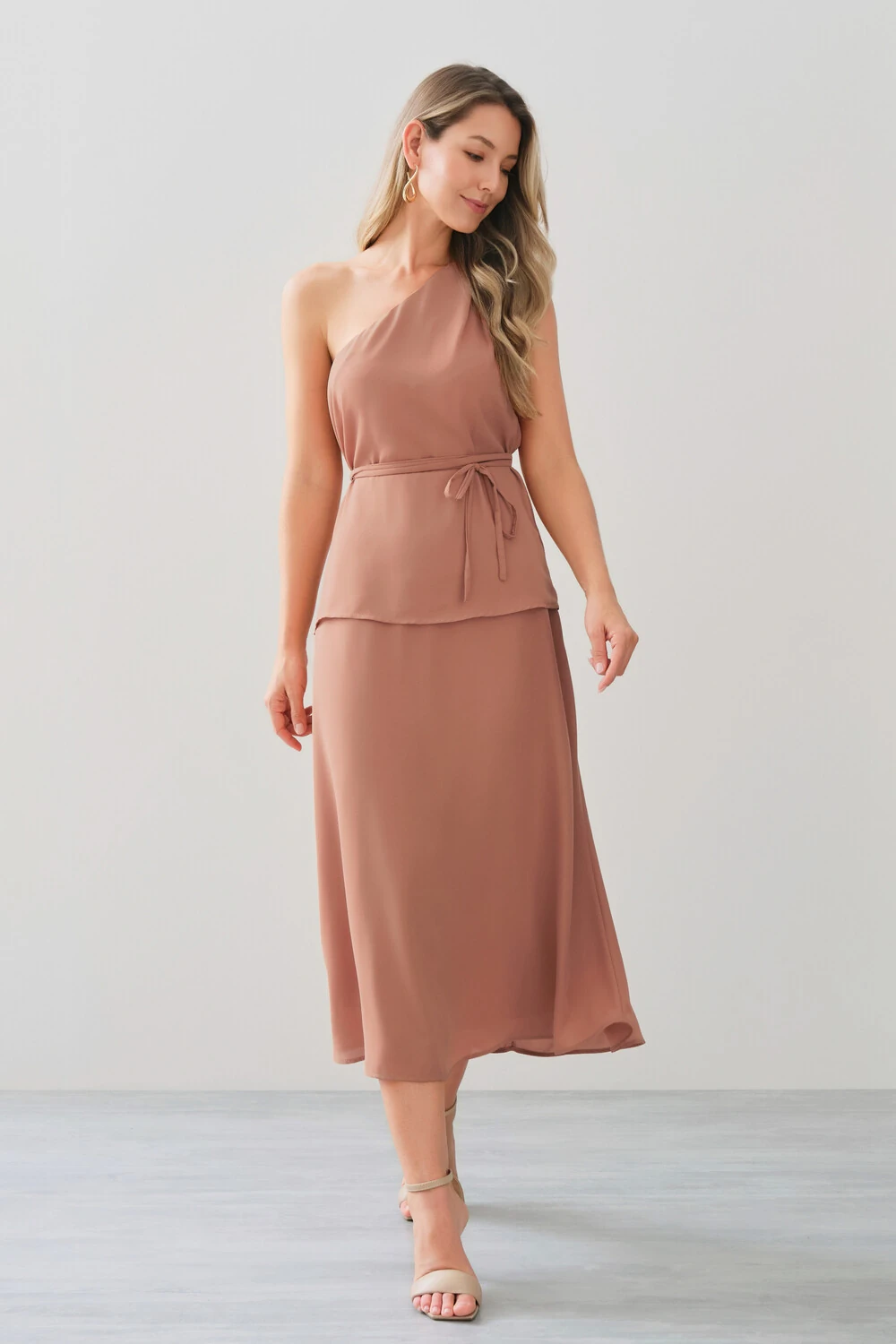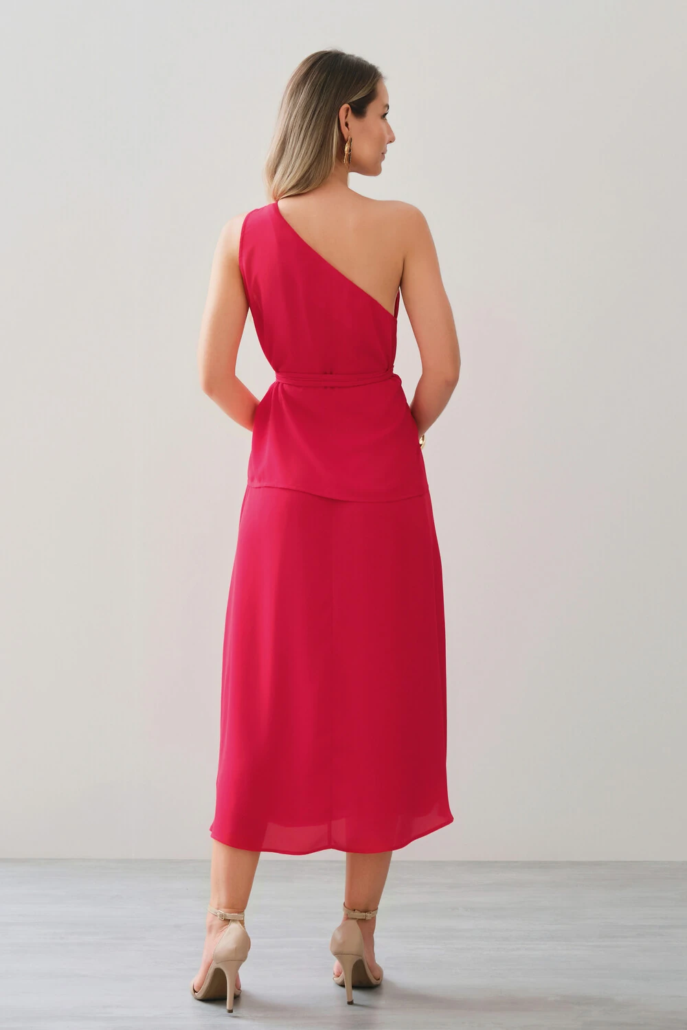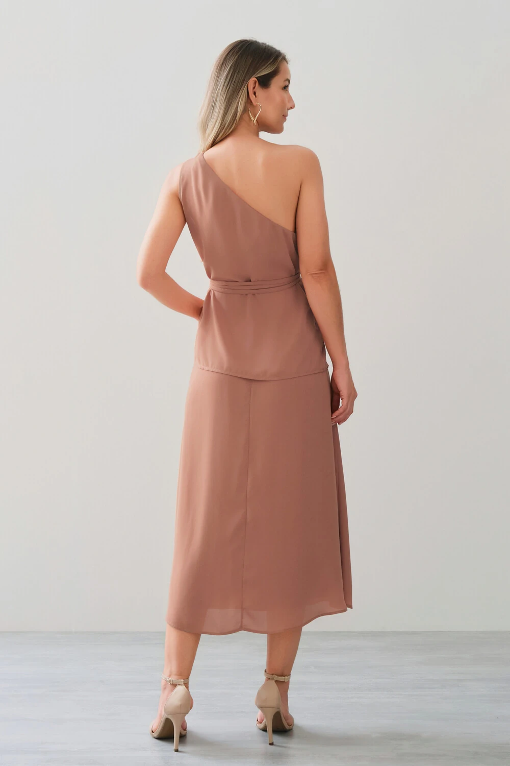 Conjunto de Blusa Regata Assimétrica Um Ombro Só Prega Cinto e Saia Midi