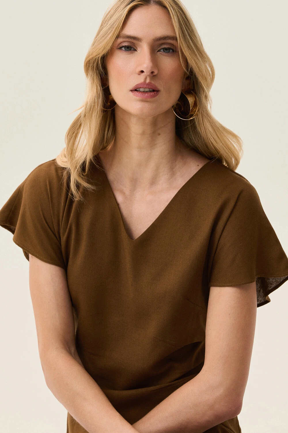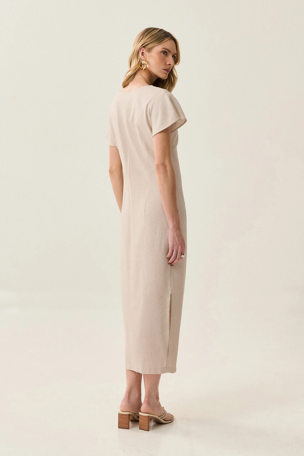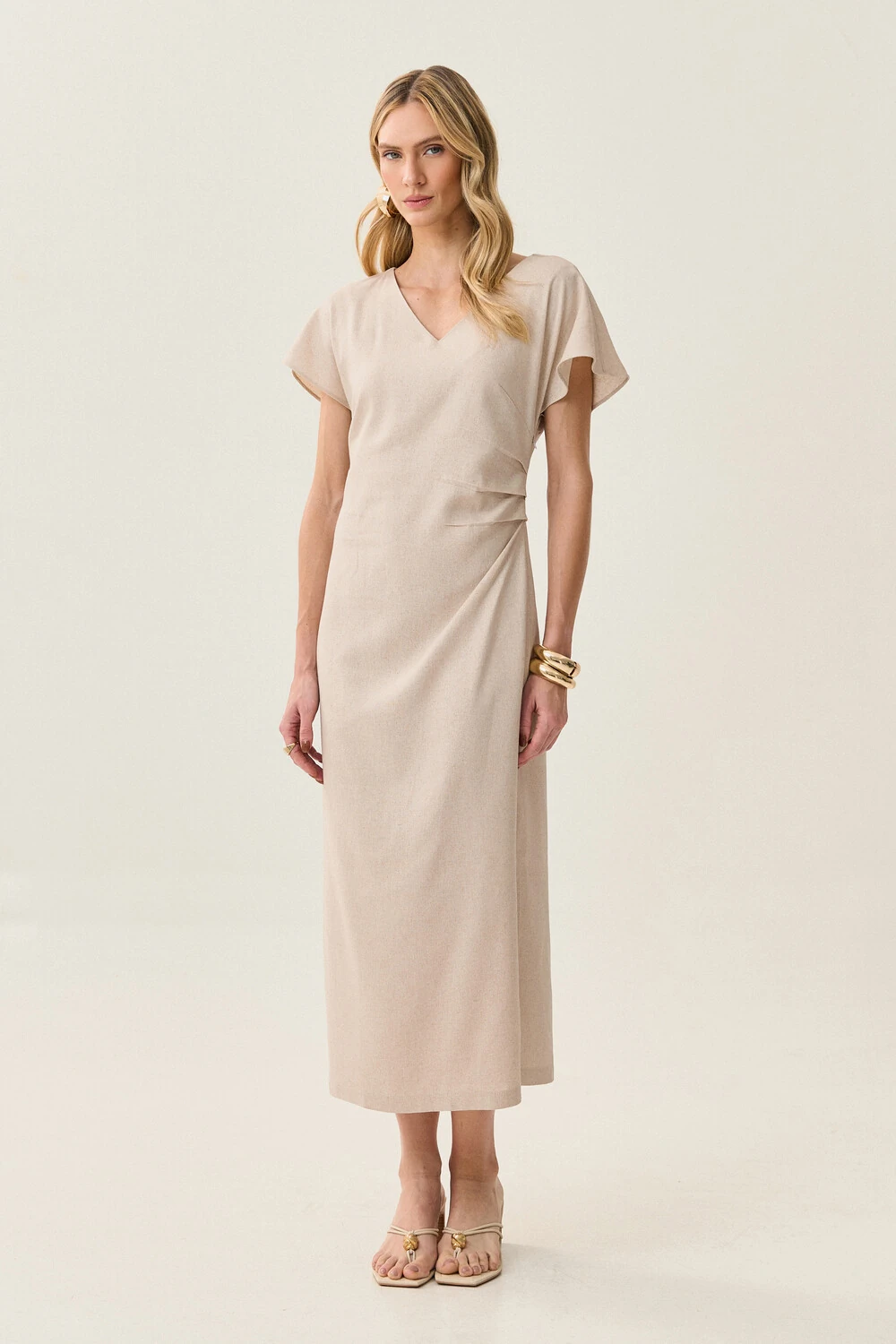 Vestido midi assimétricod e linho decote v lateral com pregas. O vestido contém o ziper invisível na lateral e não contém o forro.