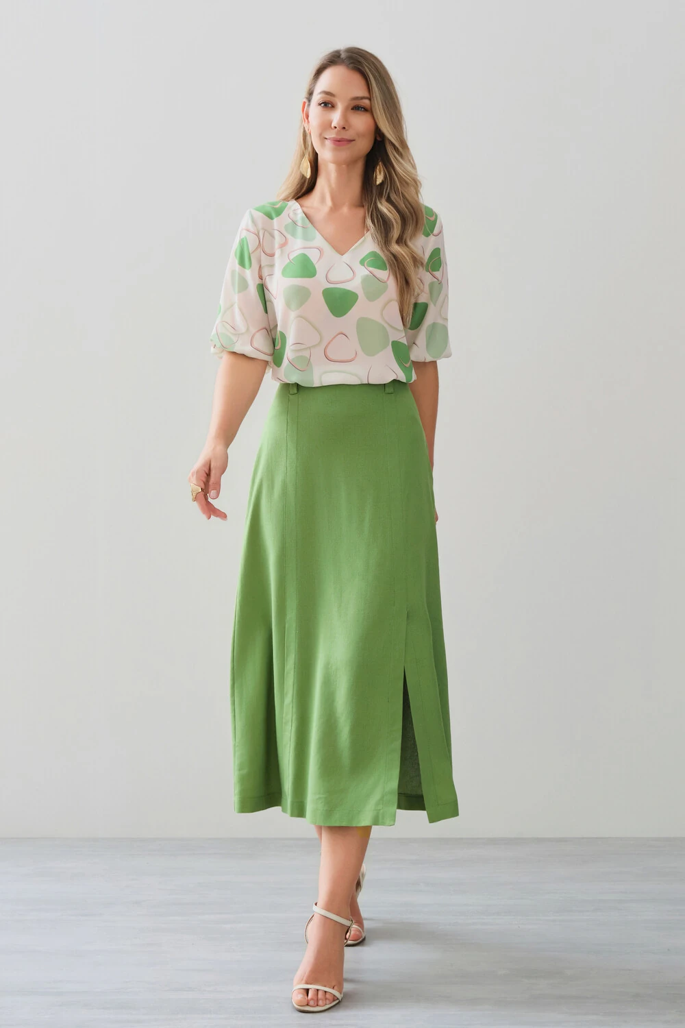 Blusa est abstrata de triângulo manga 3/4 com elástico decote v.