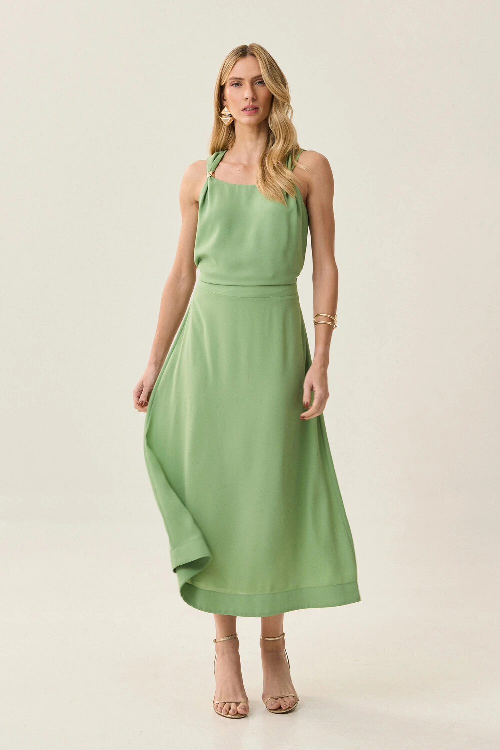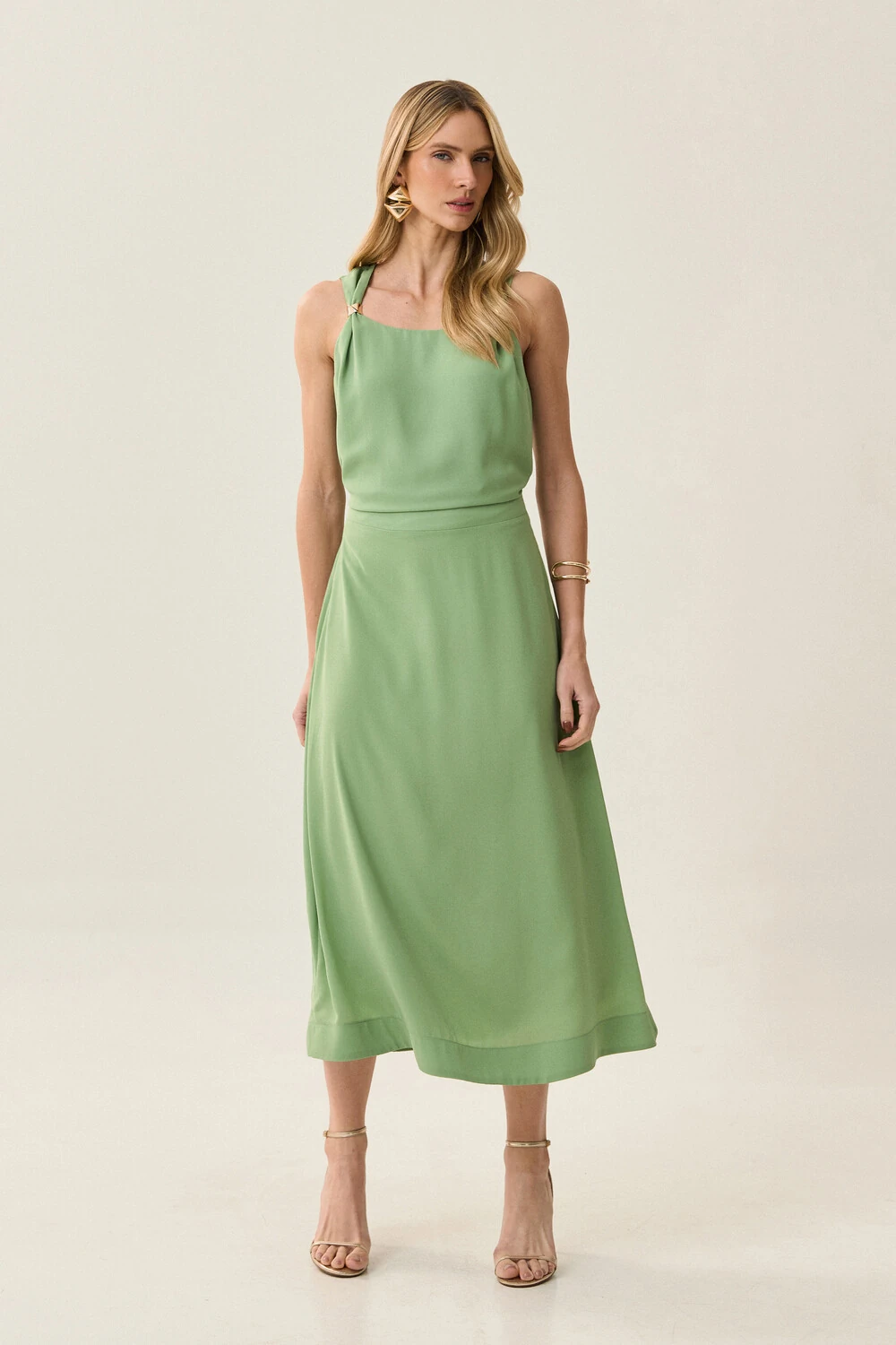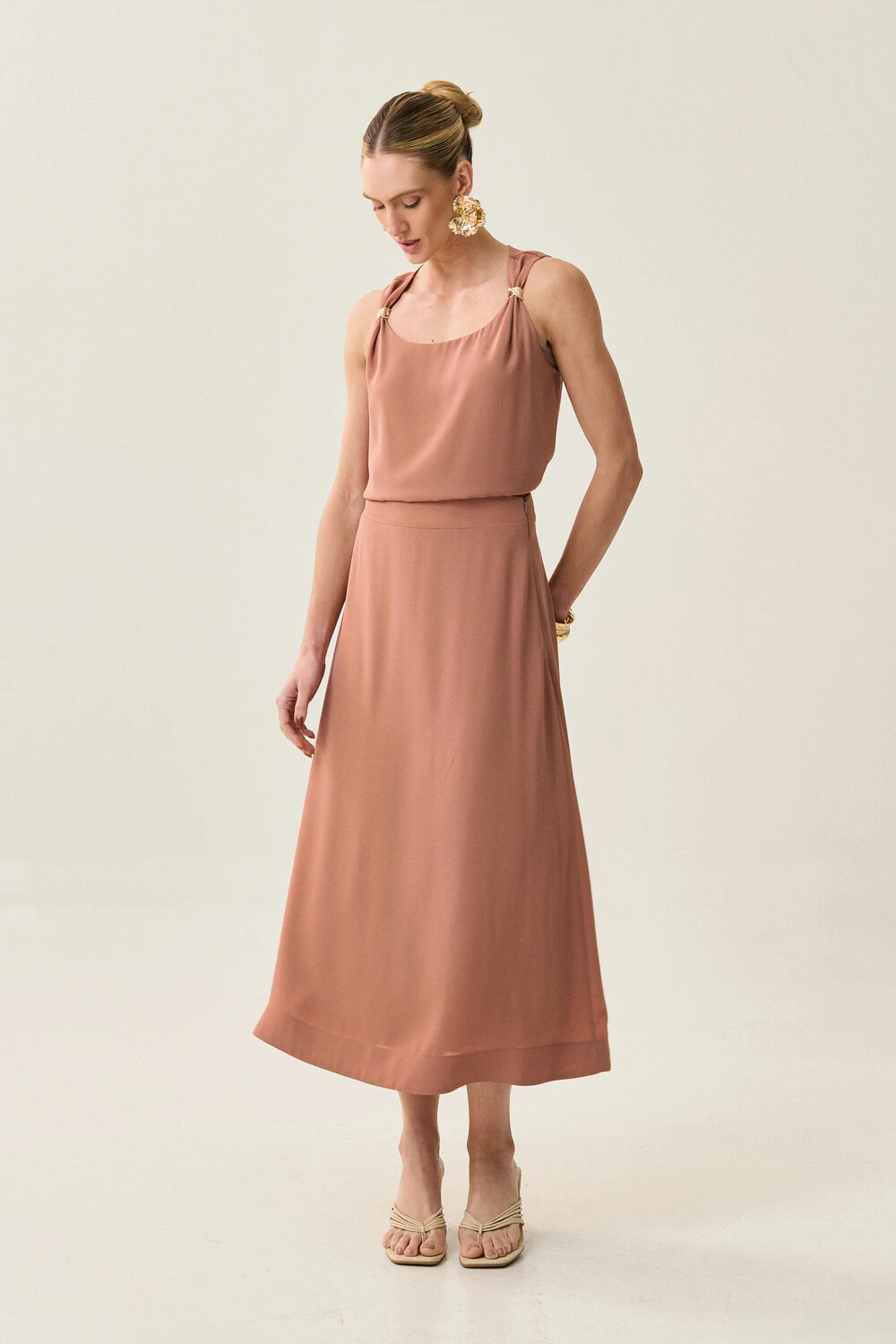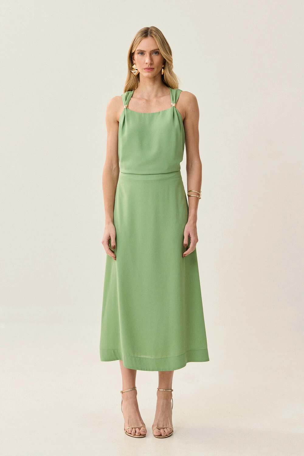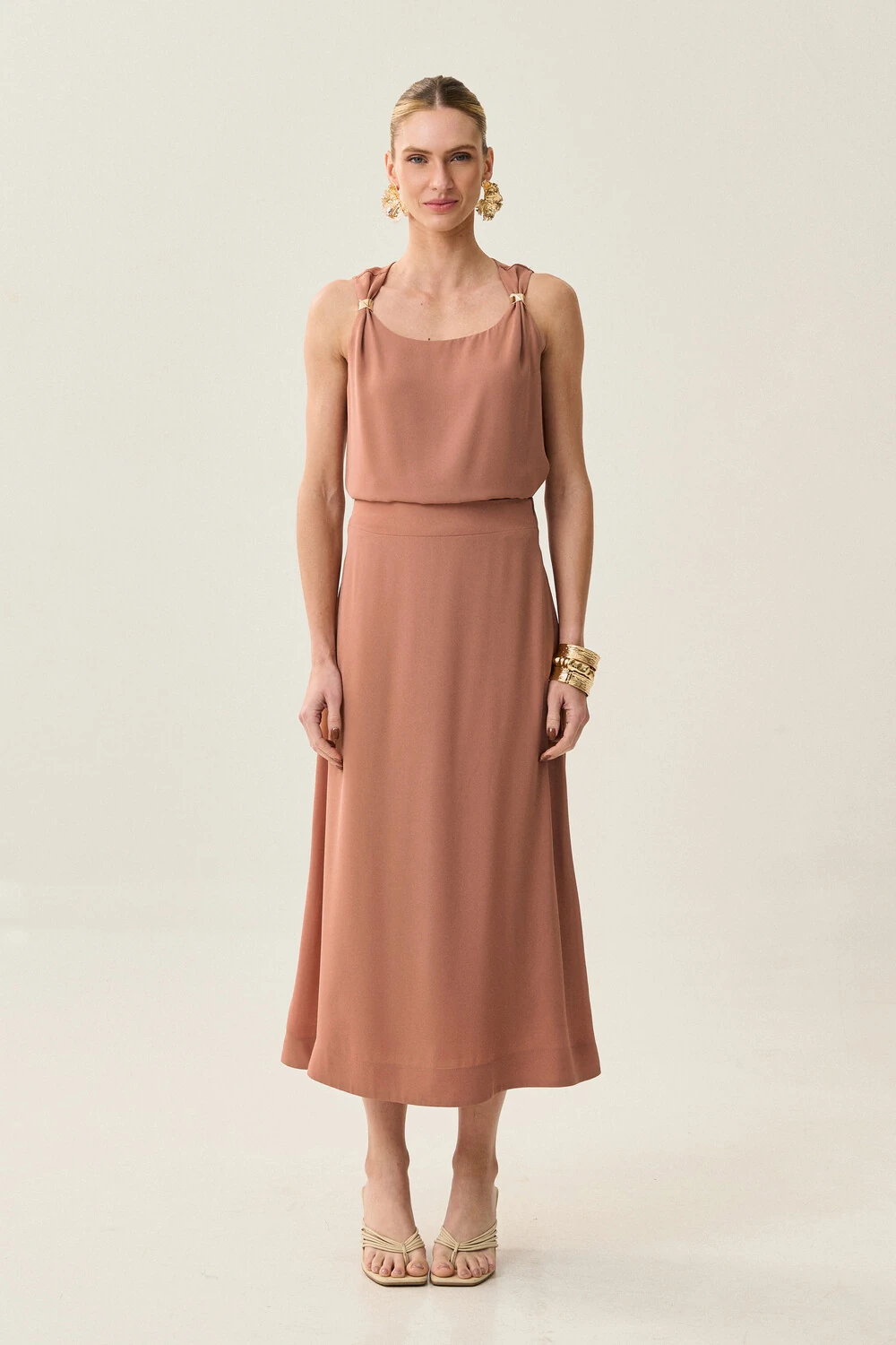 Conjunto de blusa regata com detalhe de fivela dourada nos ombros e saia midi evasê. A saia contém o ziper invisível na lateral.