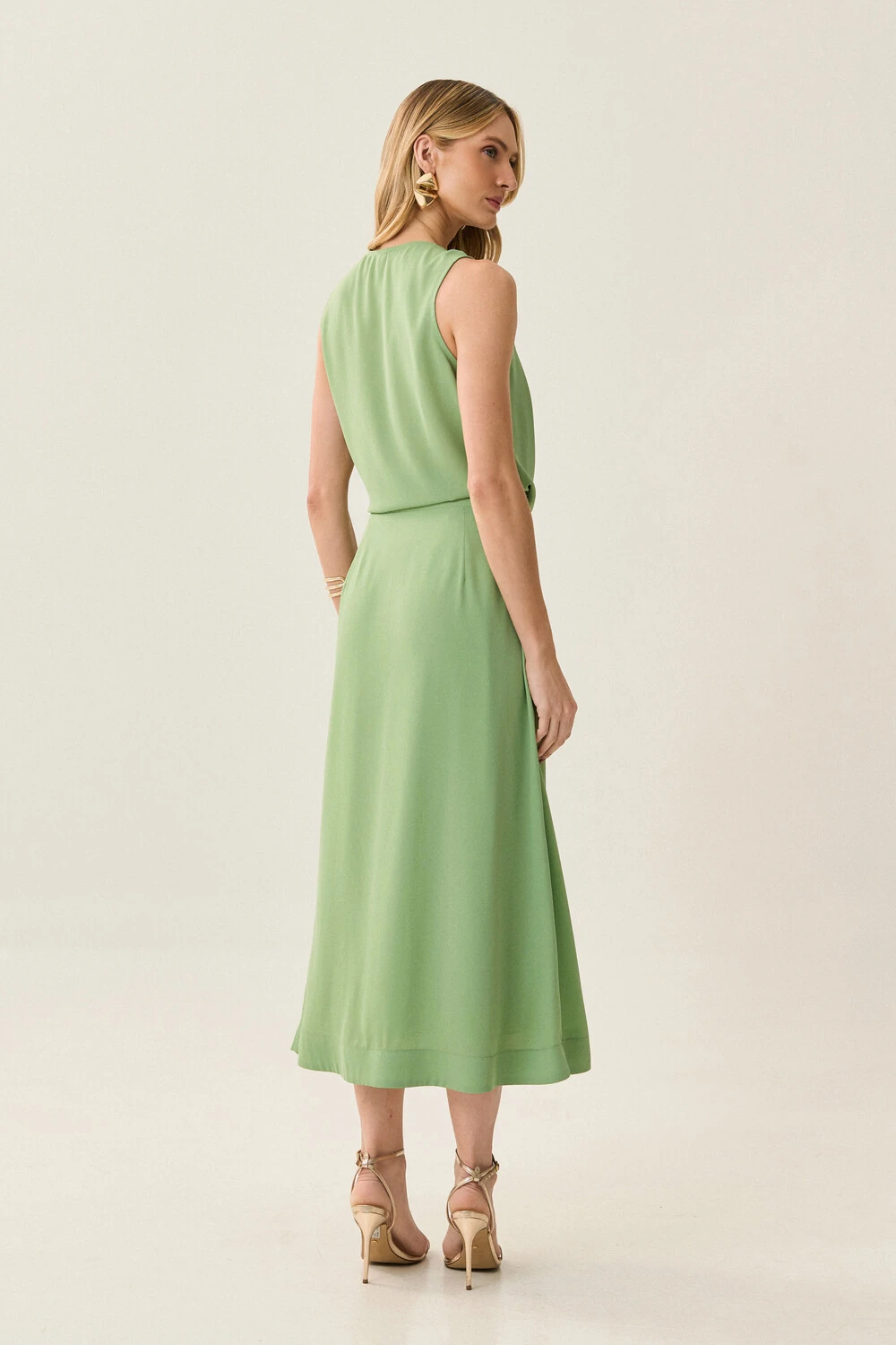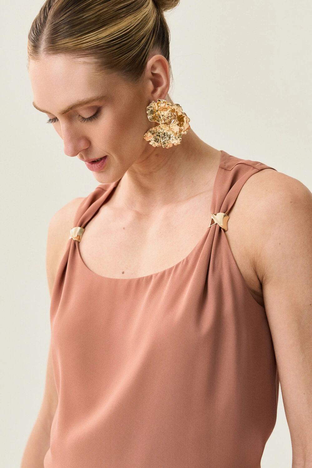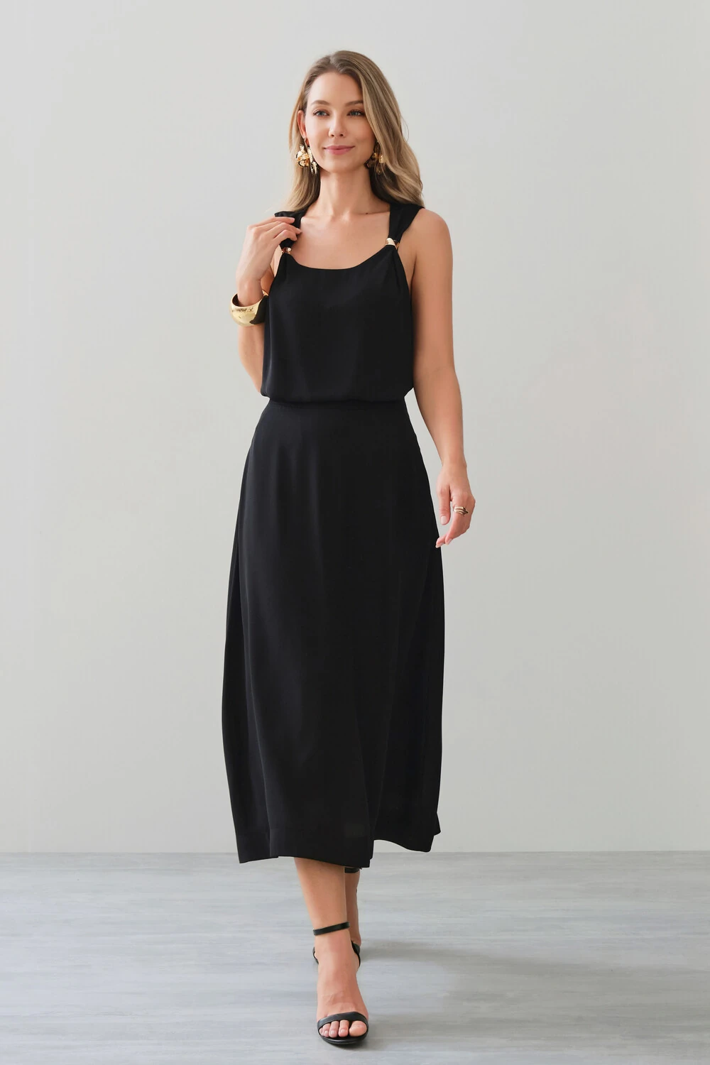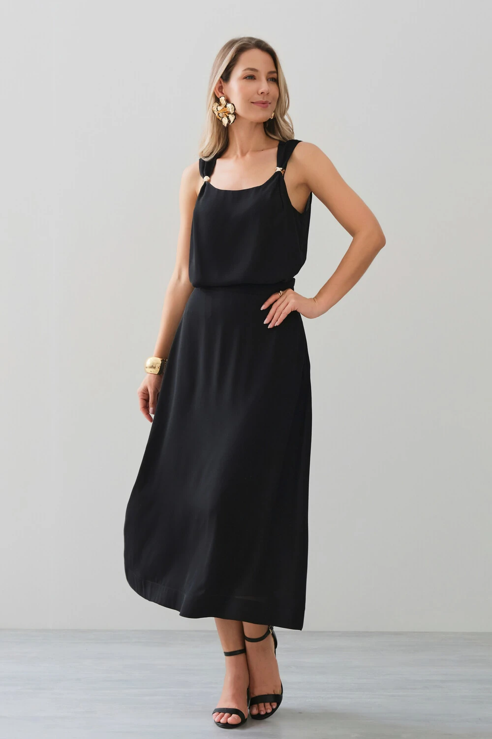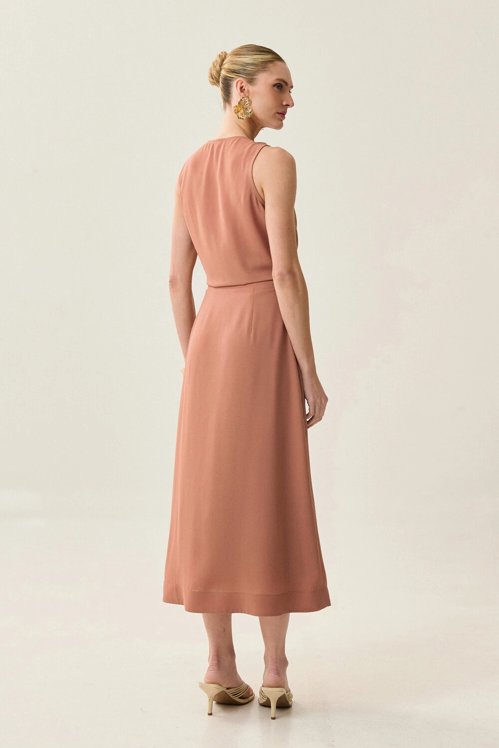Conjunto de blusa regata com detalhe de fivela dourada nos ombros e saia midi evasê. A saia contém o ziper invisível na lateral.