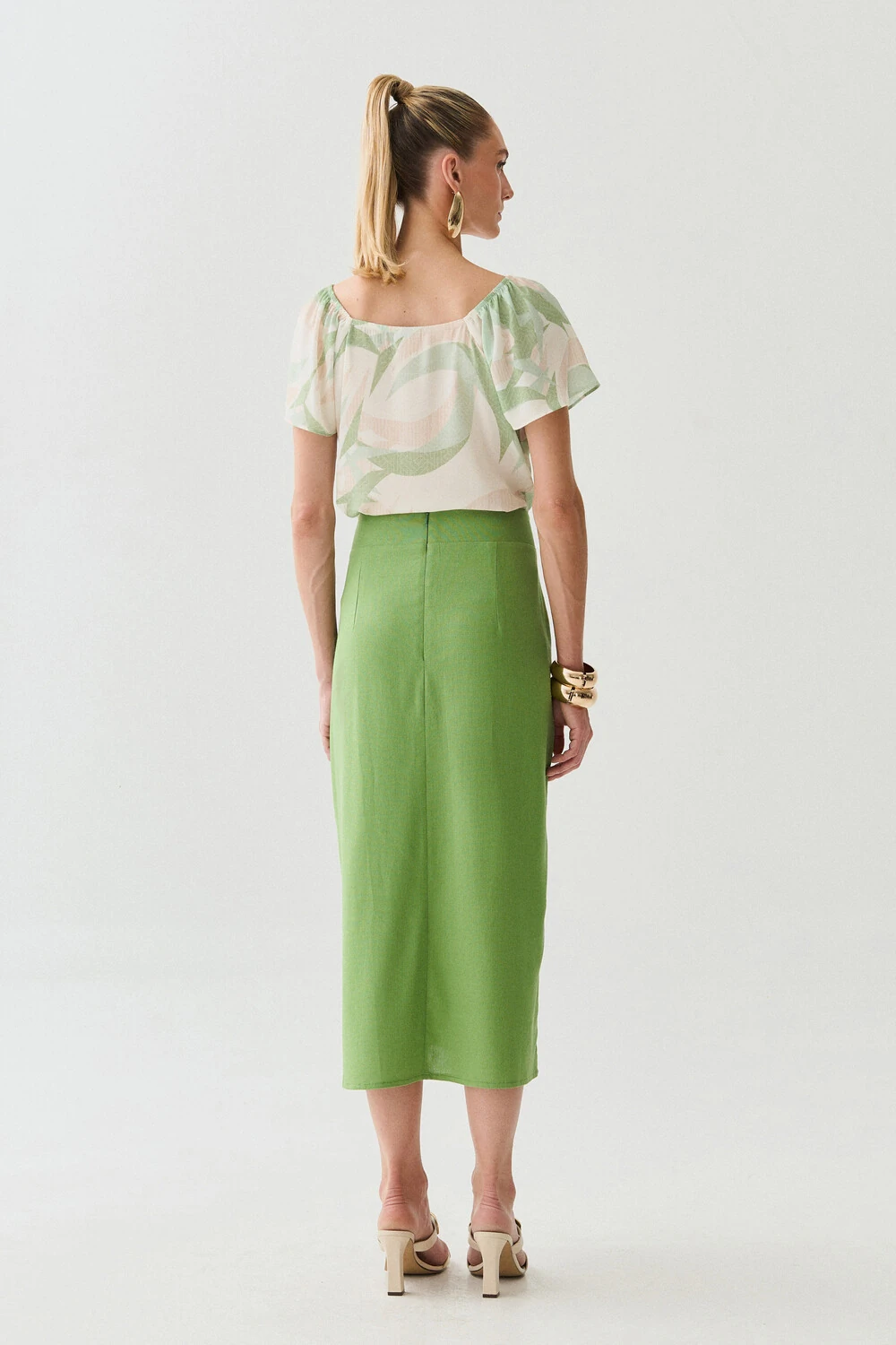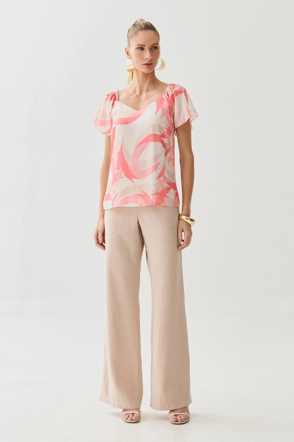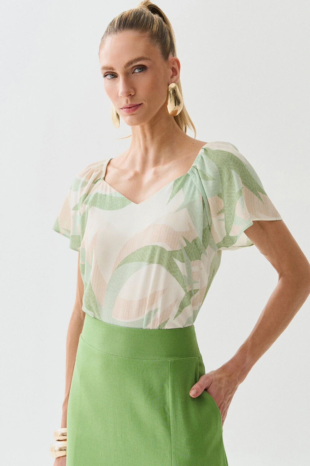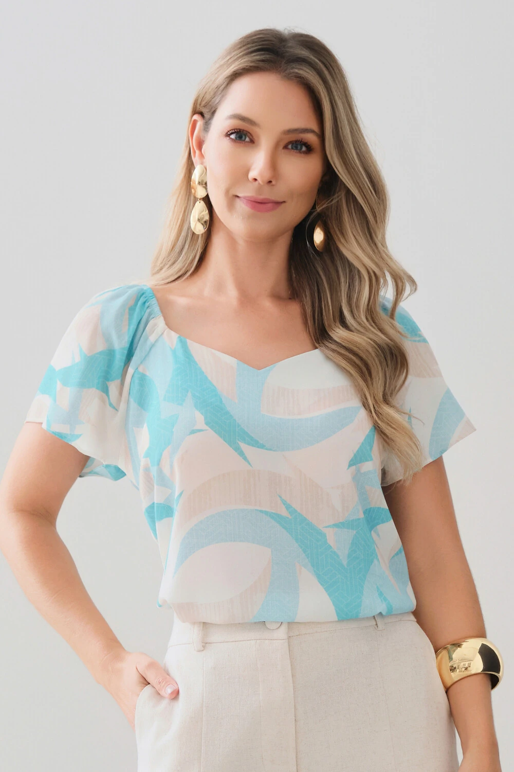 Blusa est abstrata manga raglan decote coração ombro com elástico.