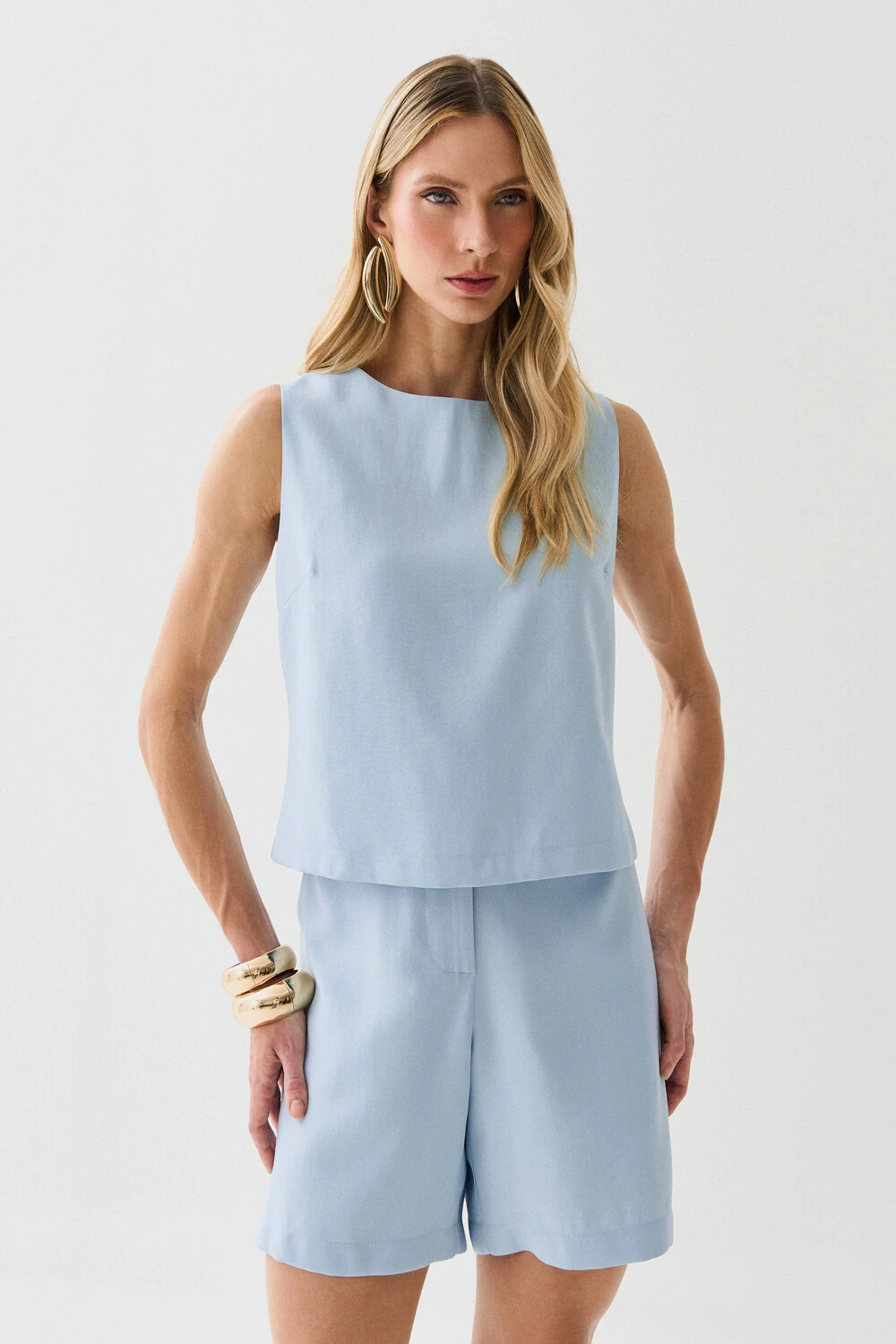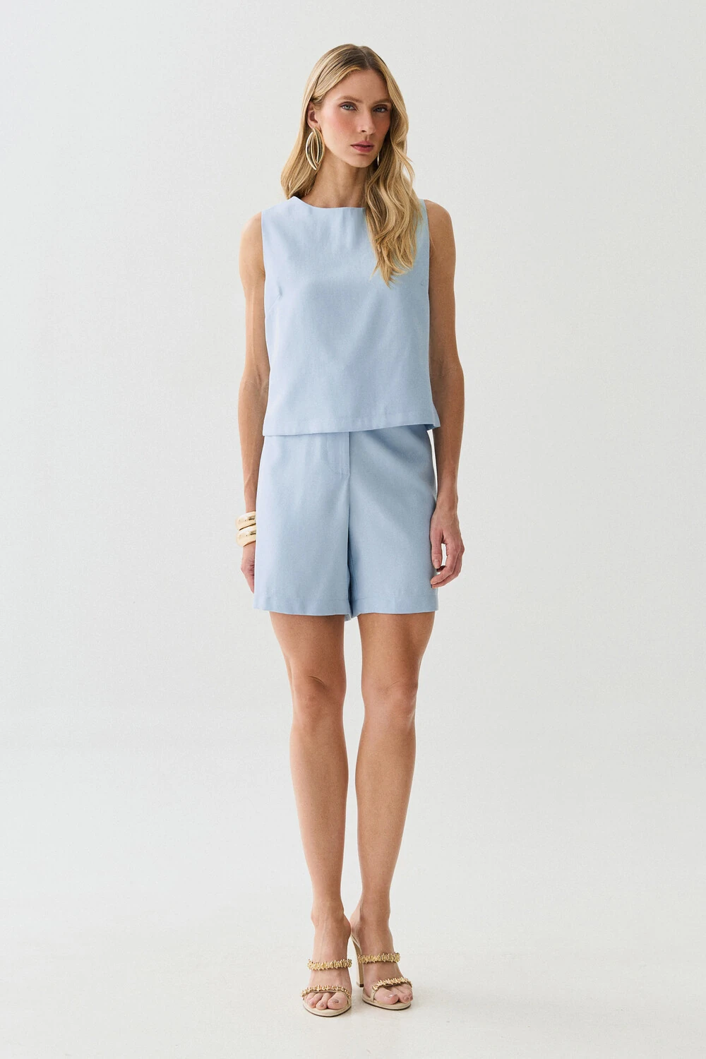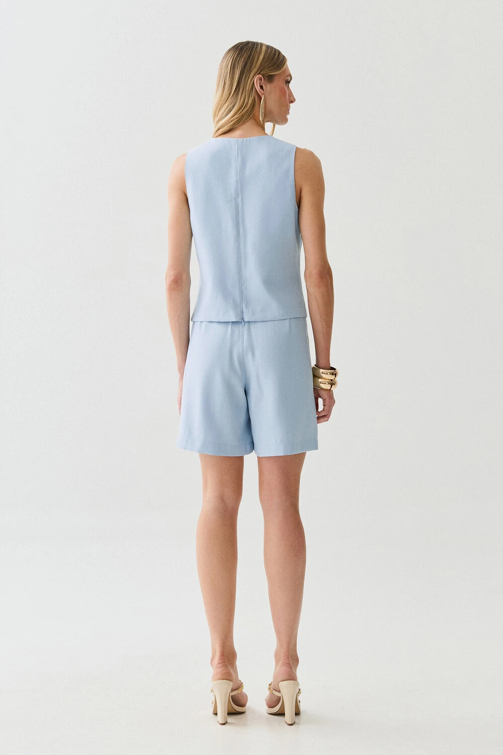 Conjunto de blusa regata com pence e shorts com botão forrado e botão forrado. A blusa contém o ziper invisível nas costas.