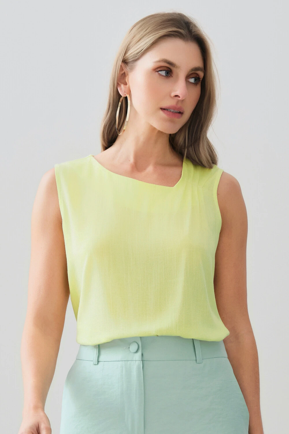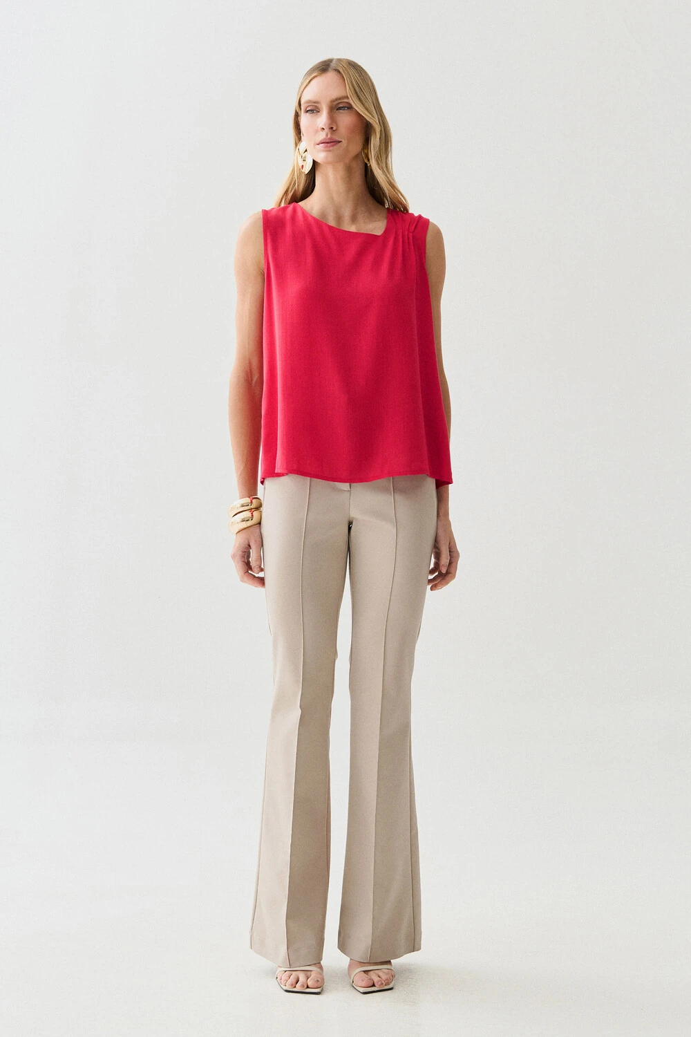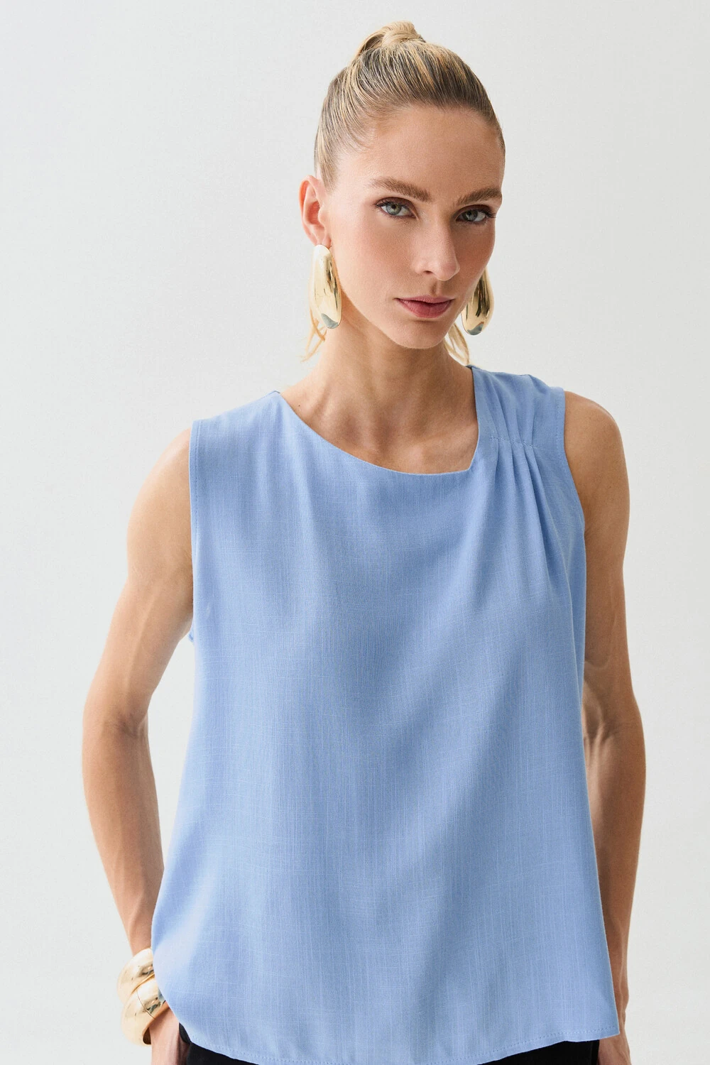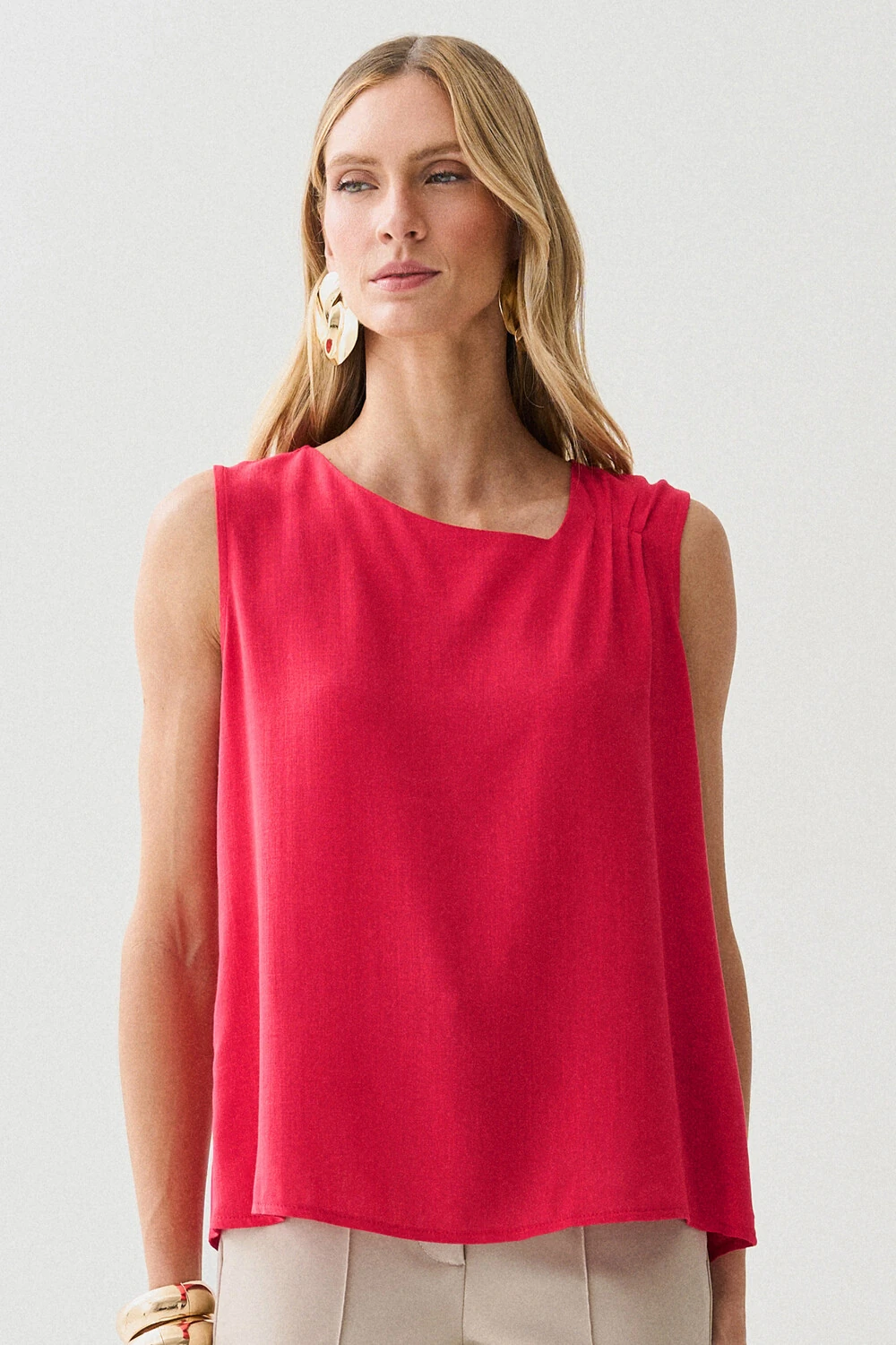 Blusa regata assimétrica decote v assimétrico com pregas no ombro esquerdo.