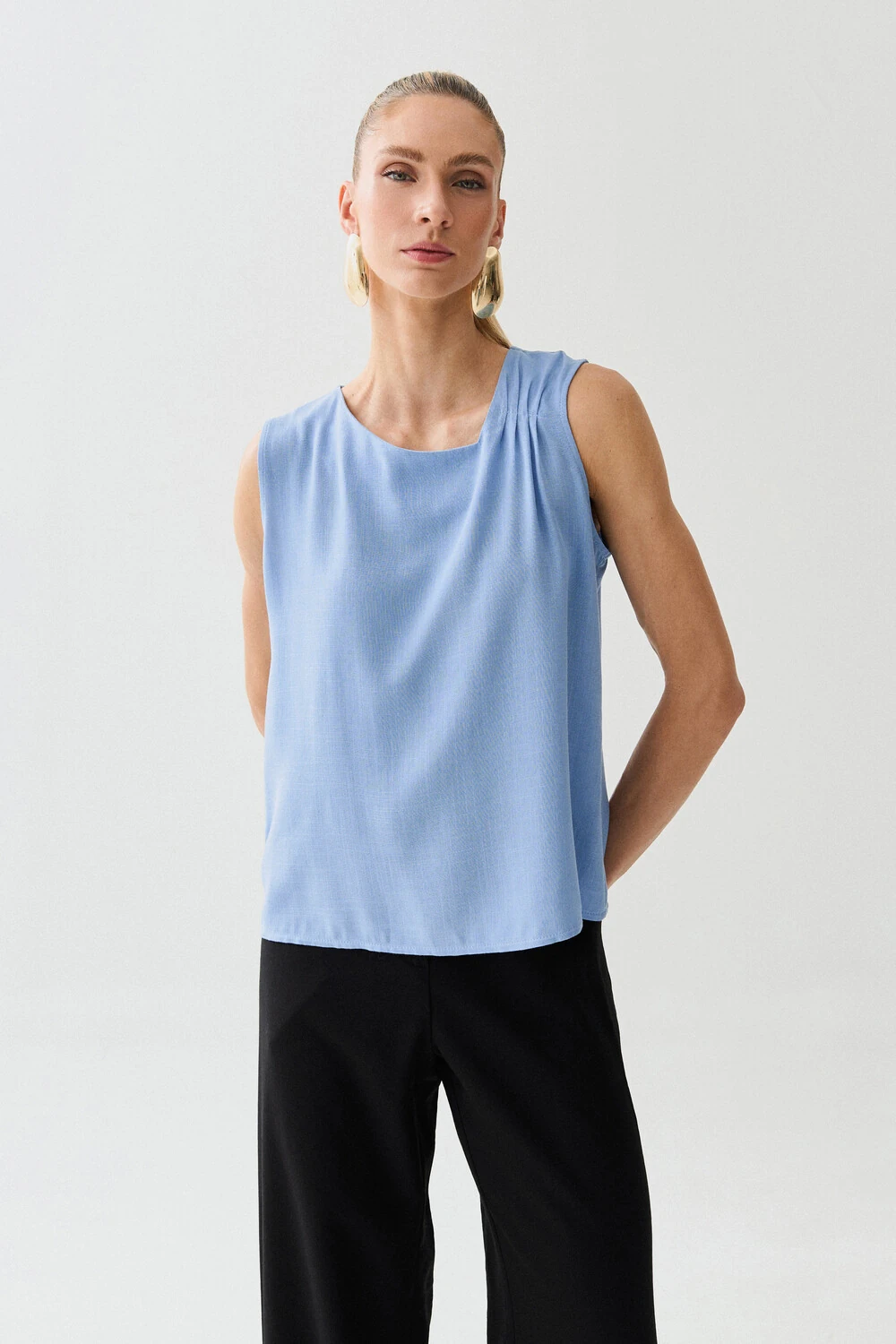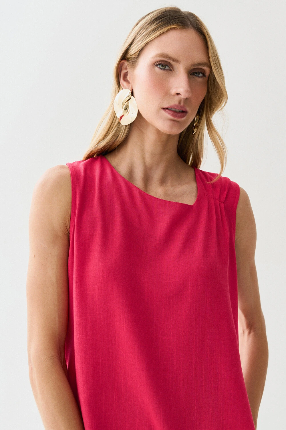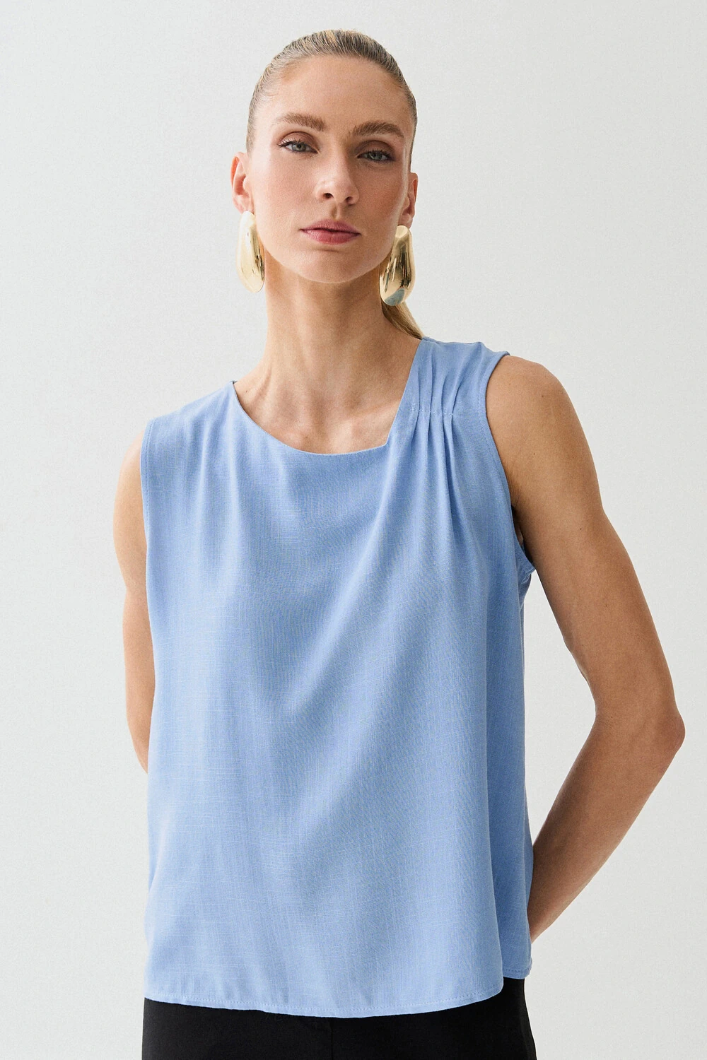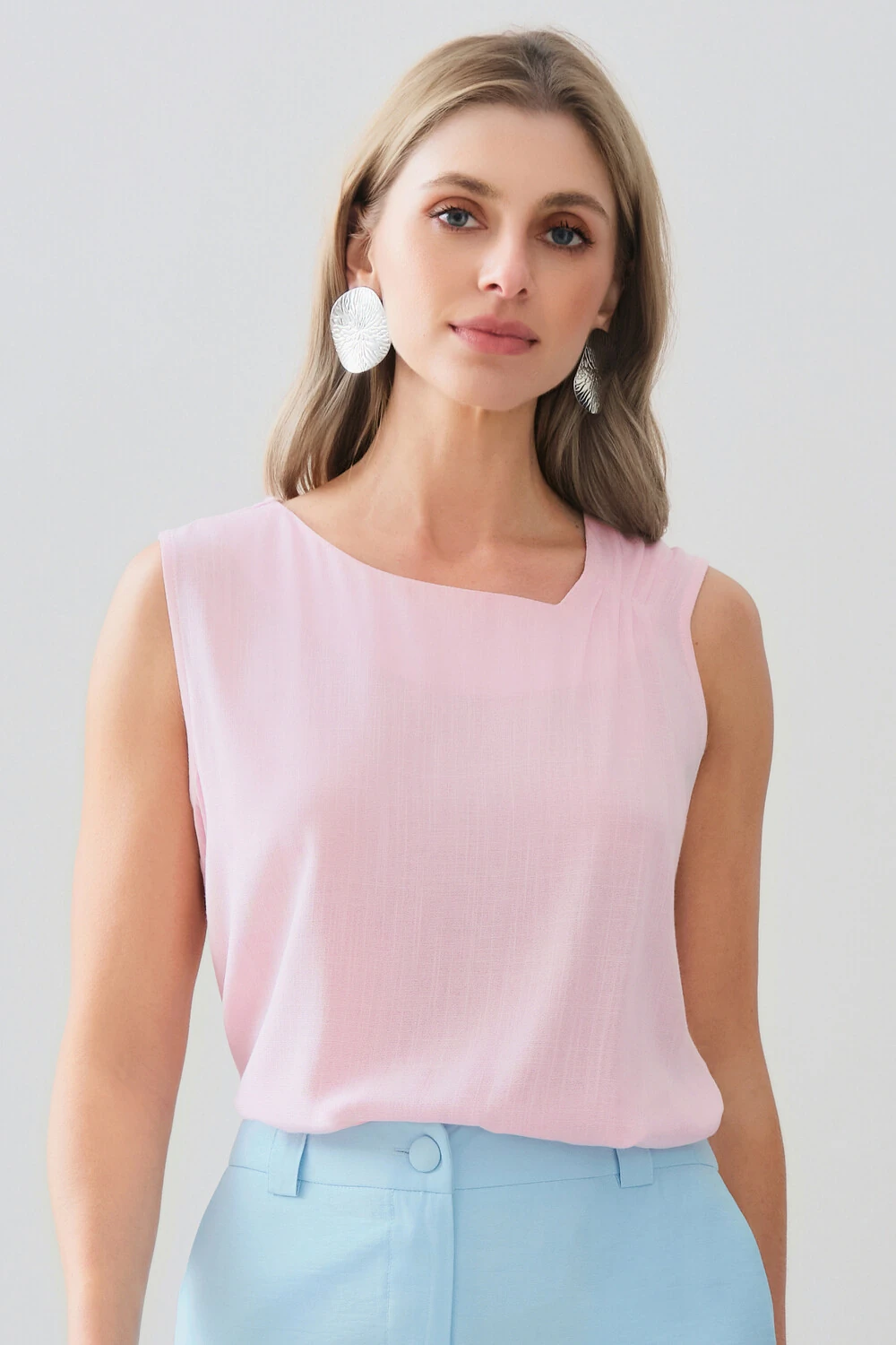 Blusa regata assimétrica decote v assimétrico com pregas no ombro esquerdo.