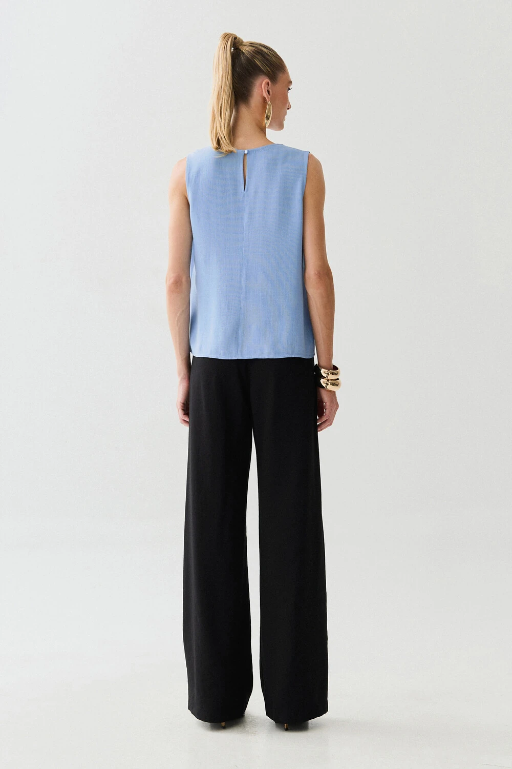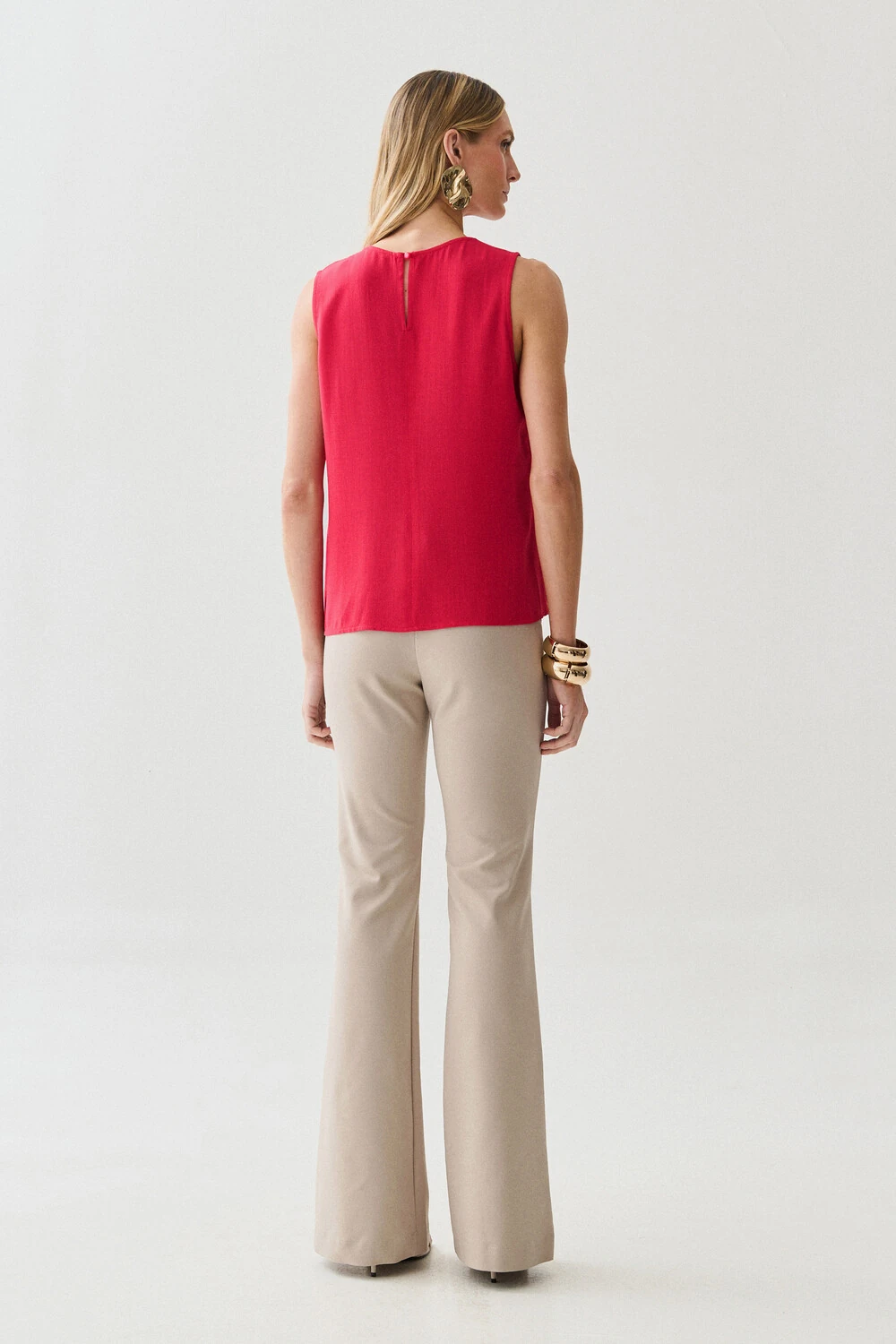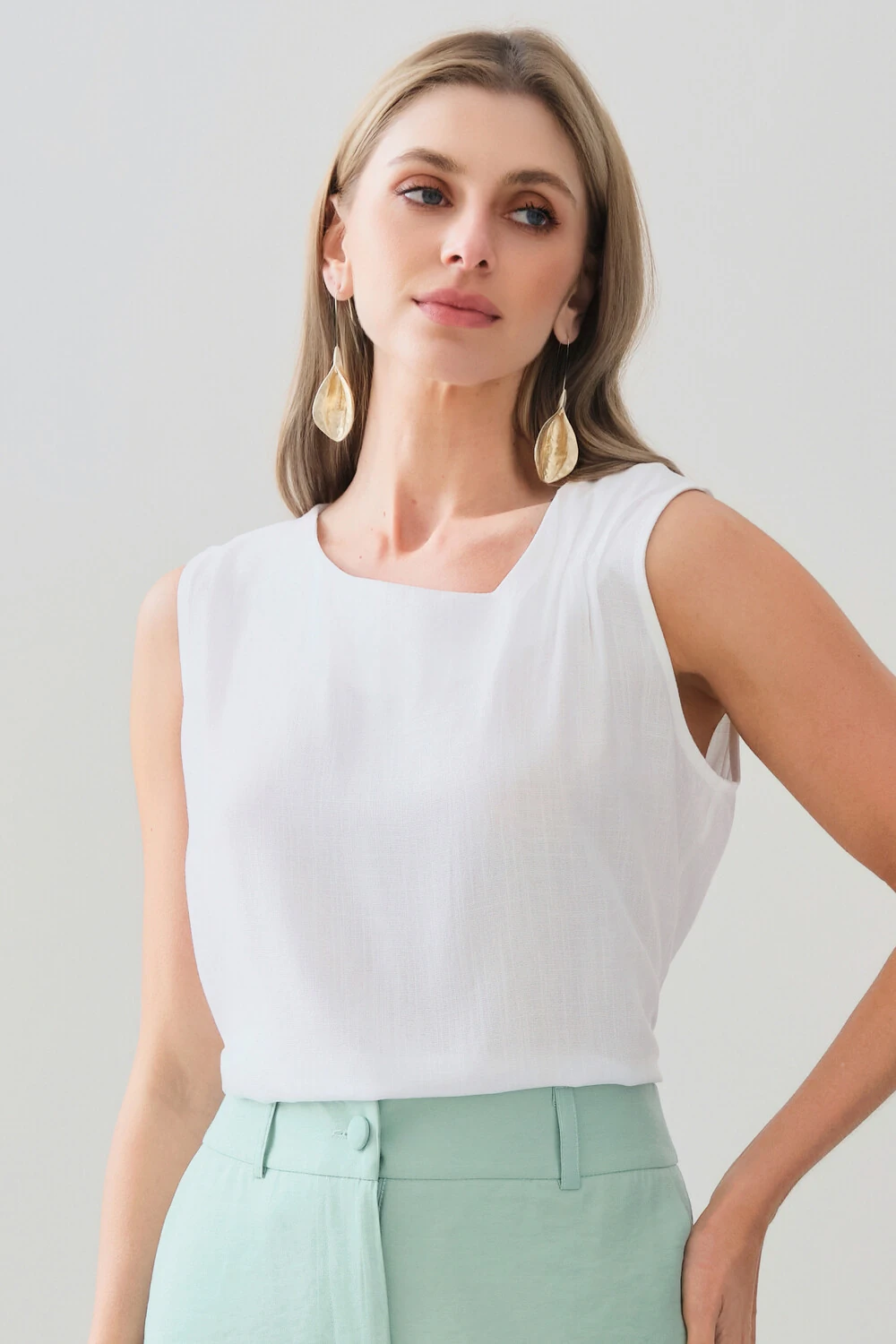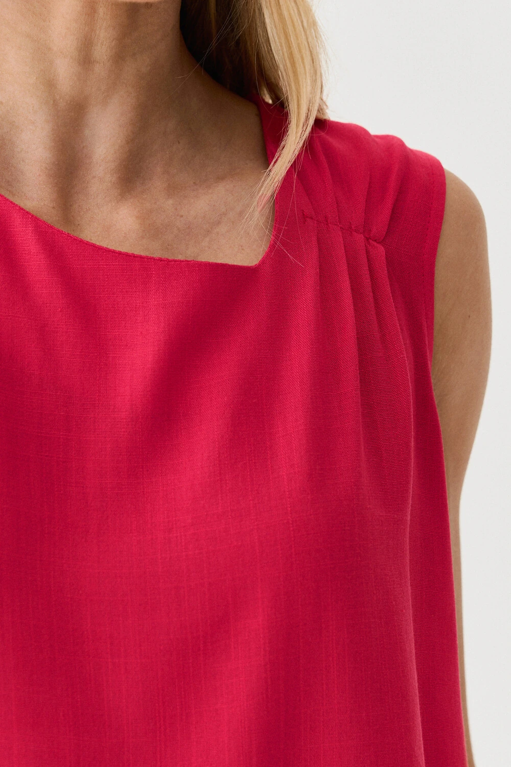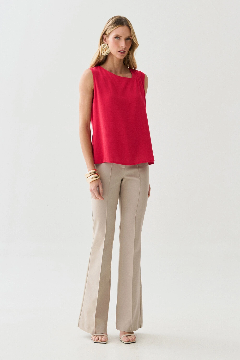 Blusa regata assimétrica decote v assimétrico com pregas no ombro esquerdo.