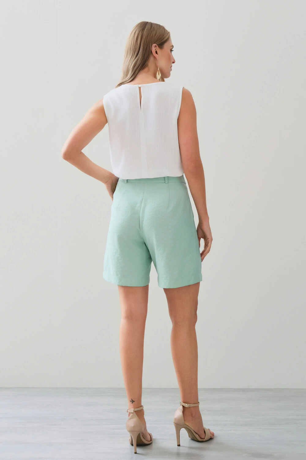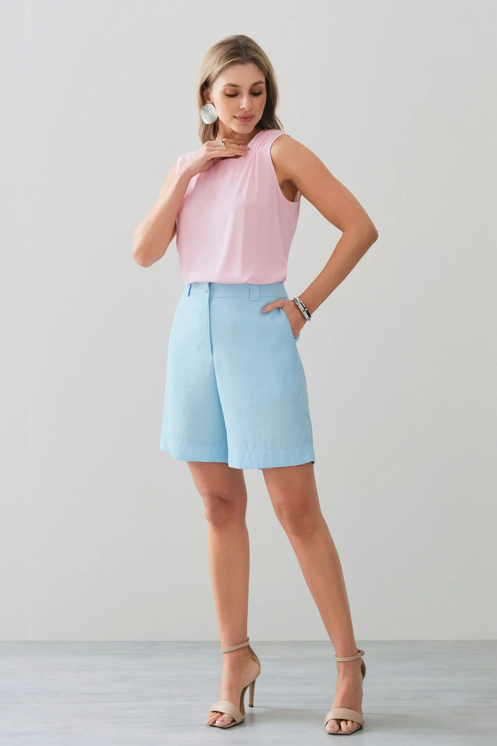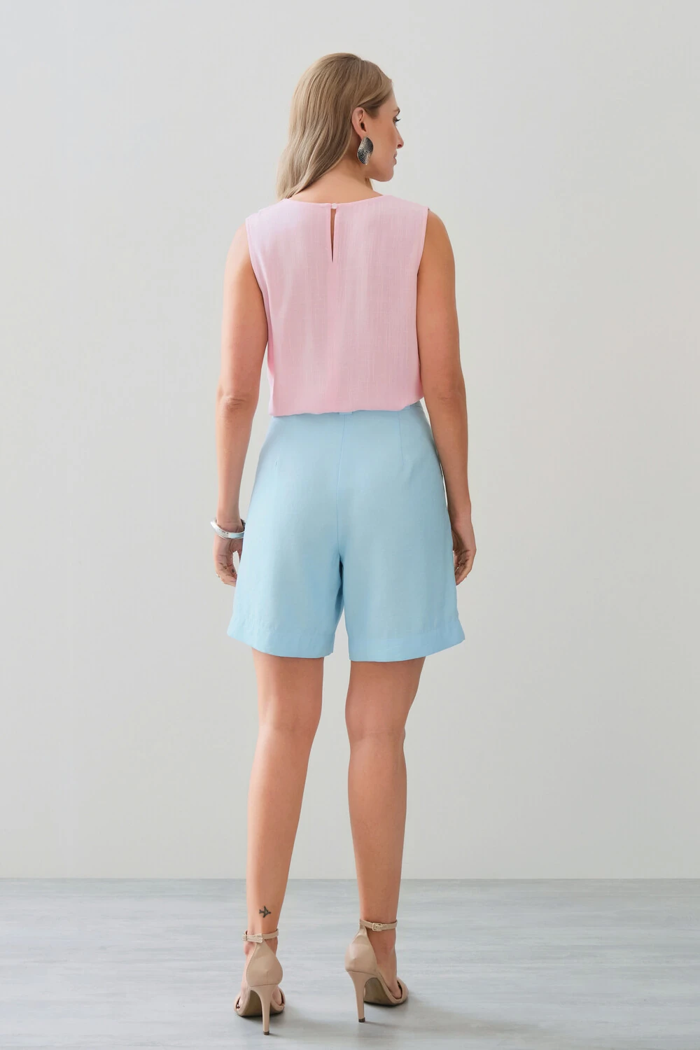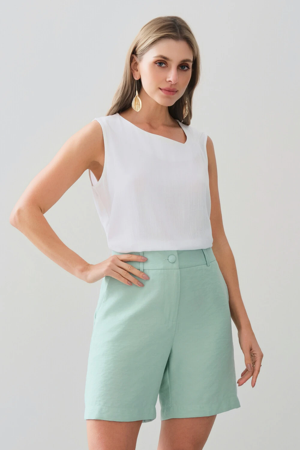 Blusa regata assimétrica decote v assimétrico com pregas no ombro esquerdo.