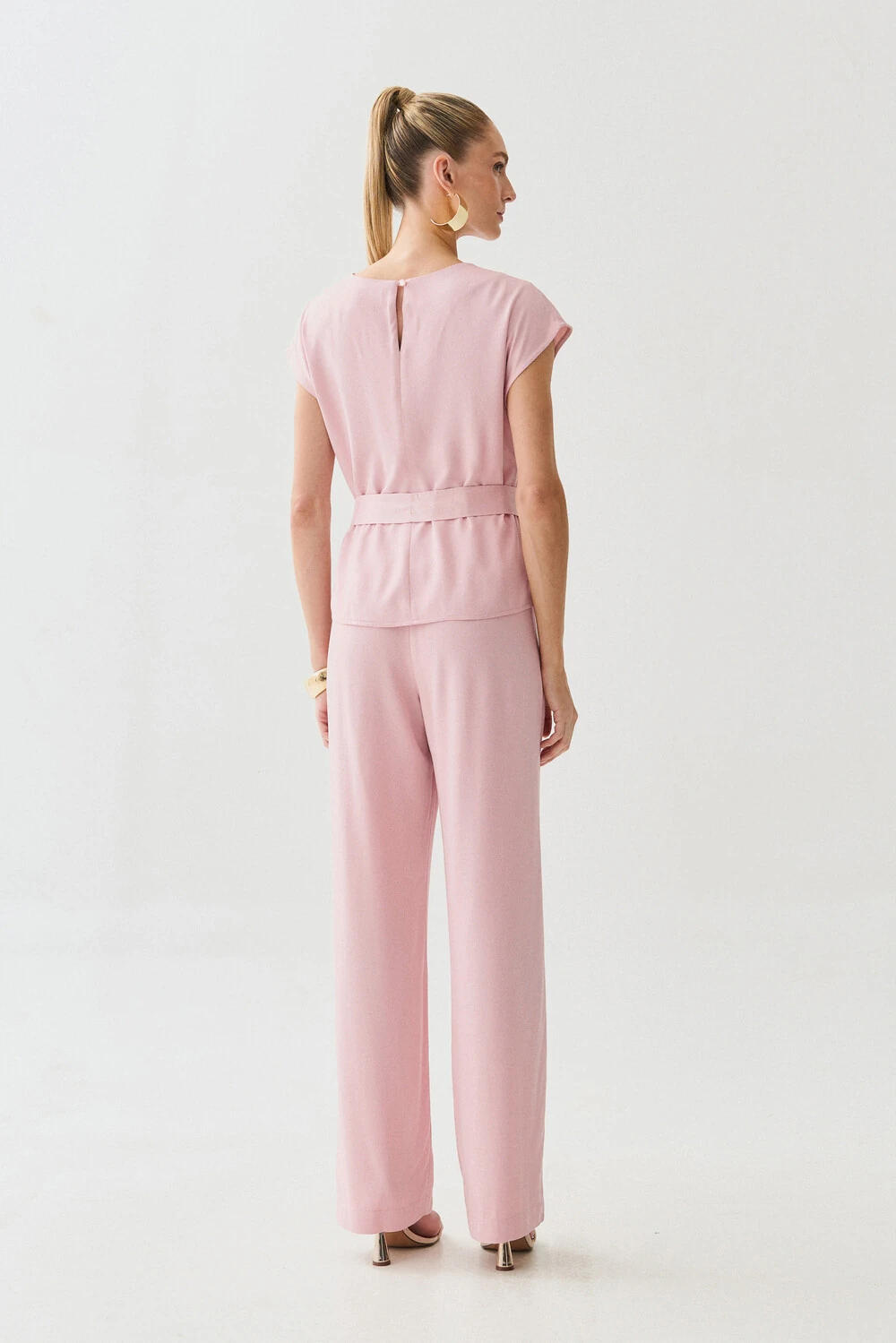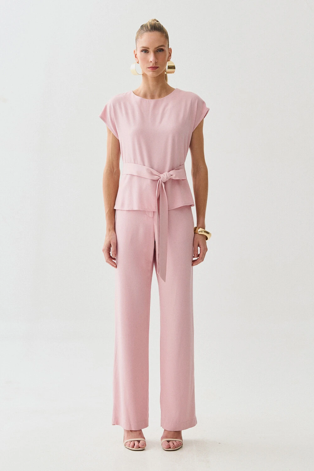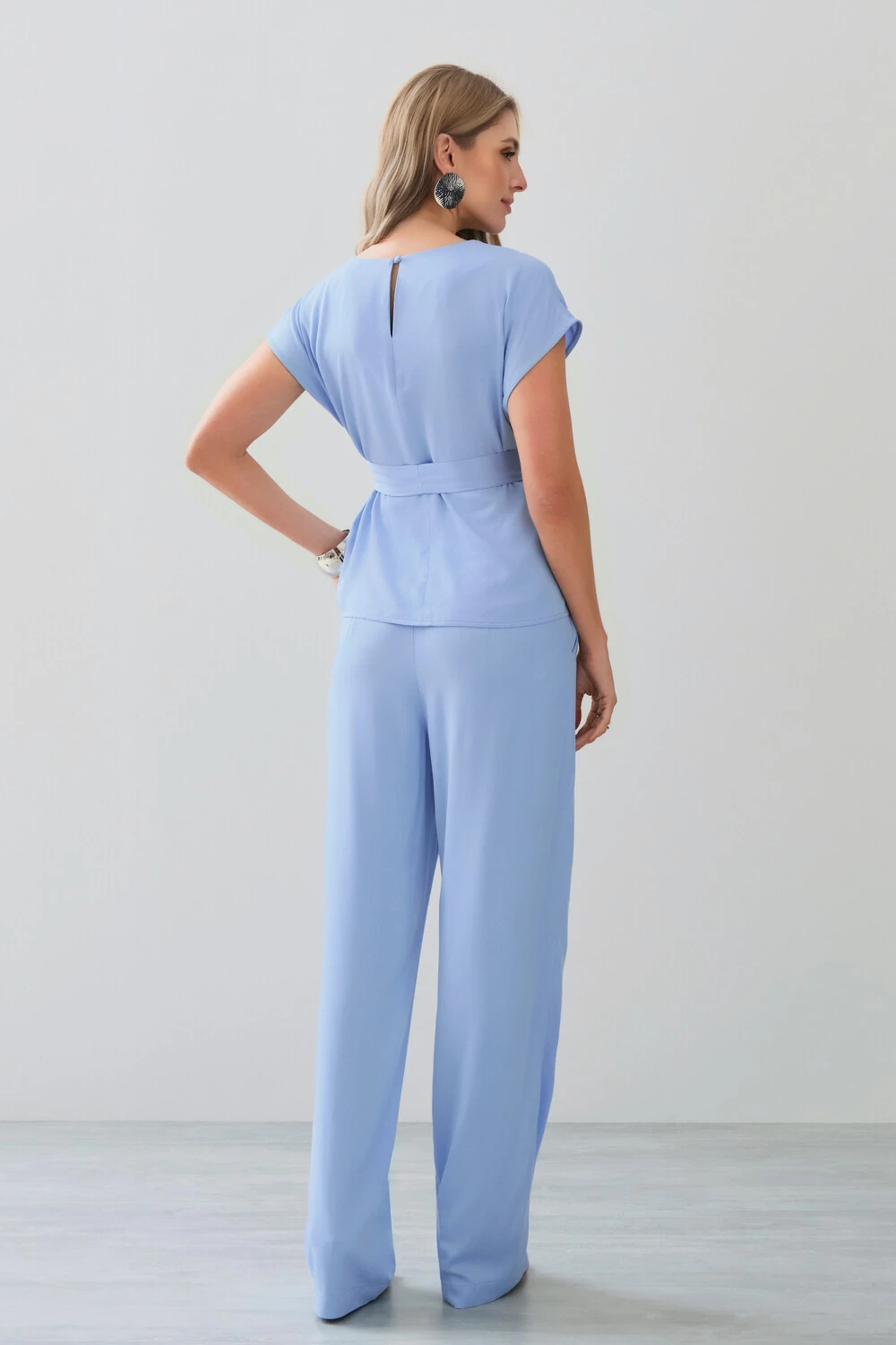Conjunto de blusa manga morcego com cinto e calça reta com bolso faca.