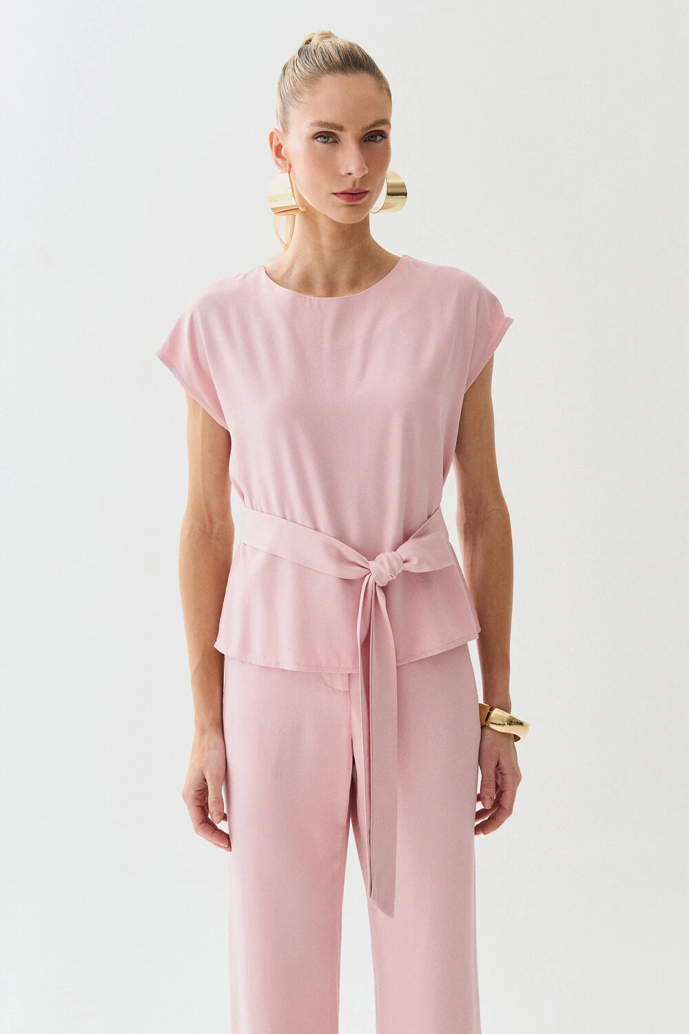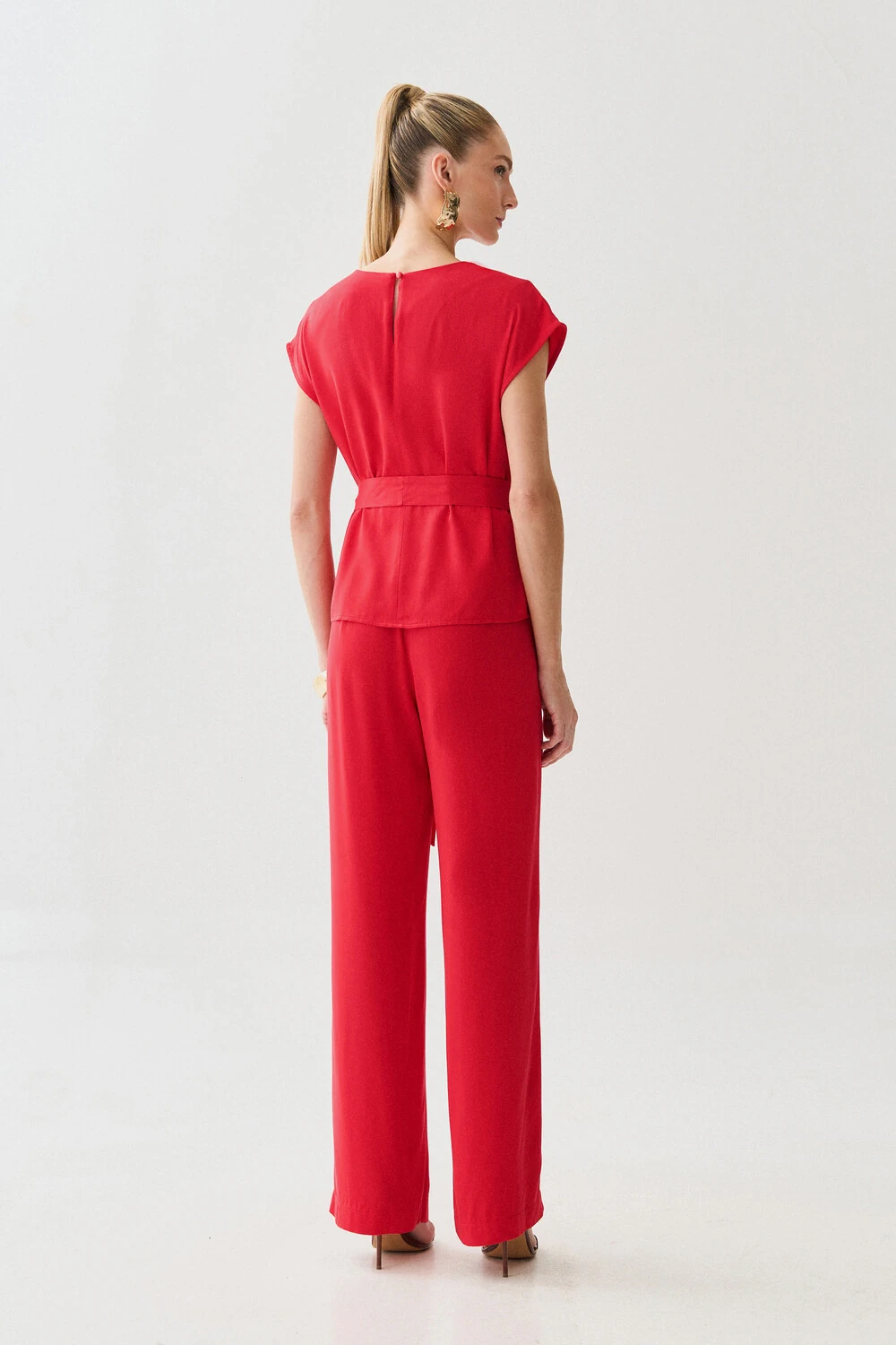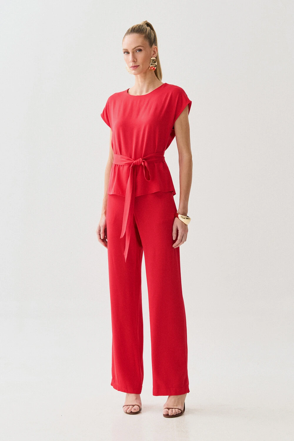 Conjunto de blusa manga morcego com cinto e calça reta com bolso faca.