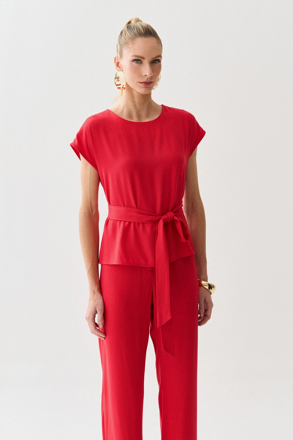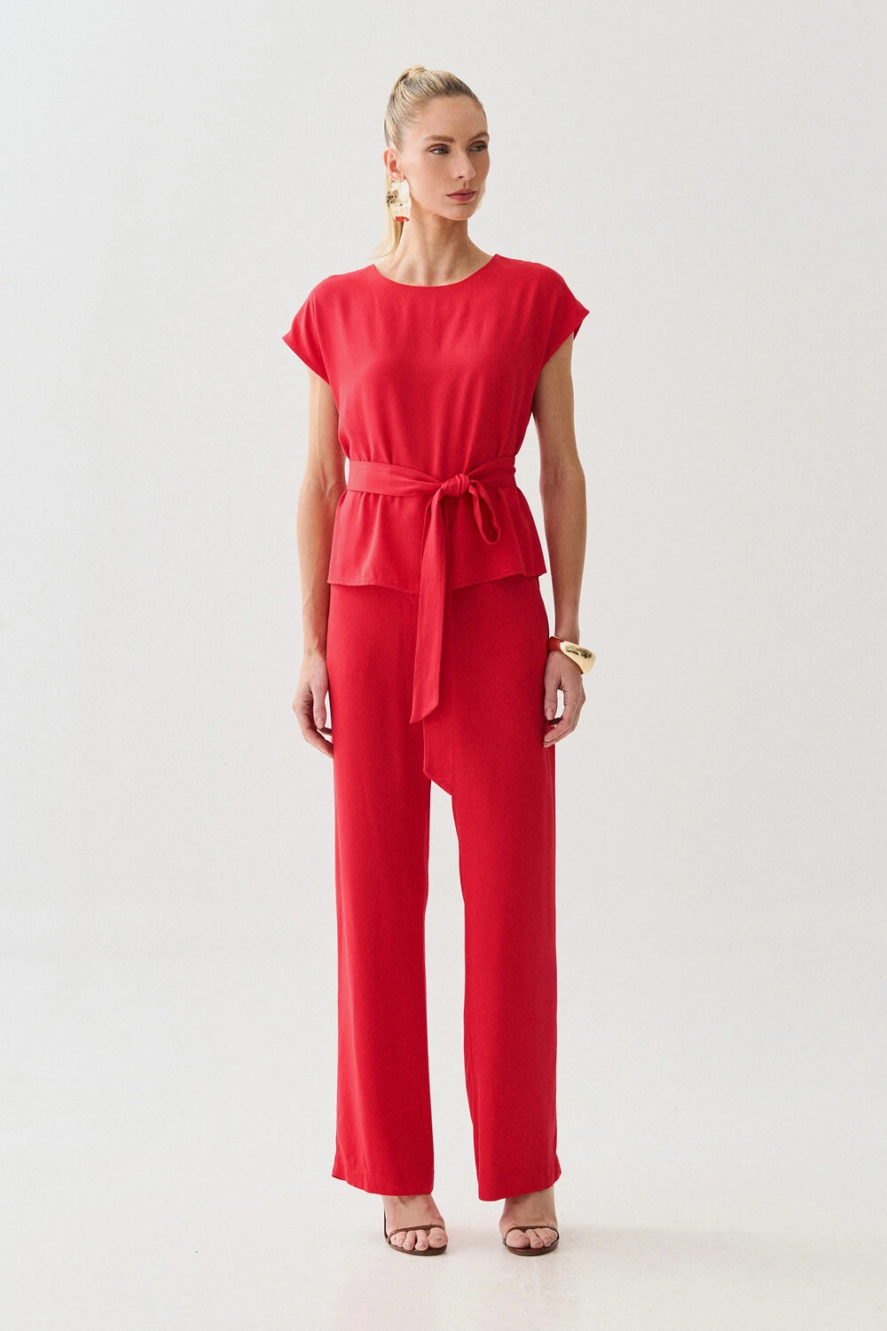 Conjunto de Blusa Manga Morcego Cinto e Calça Reta