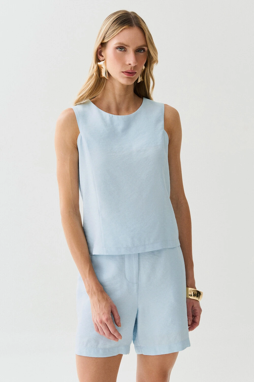 Conjunto de blusa regata com recorte e shorts com bolso faca.