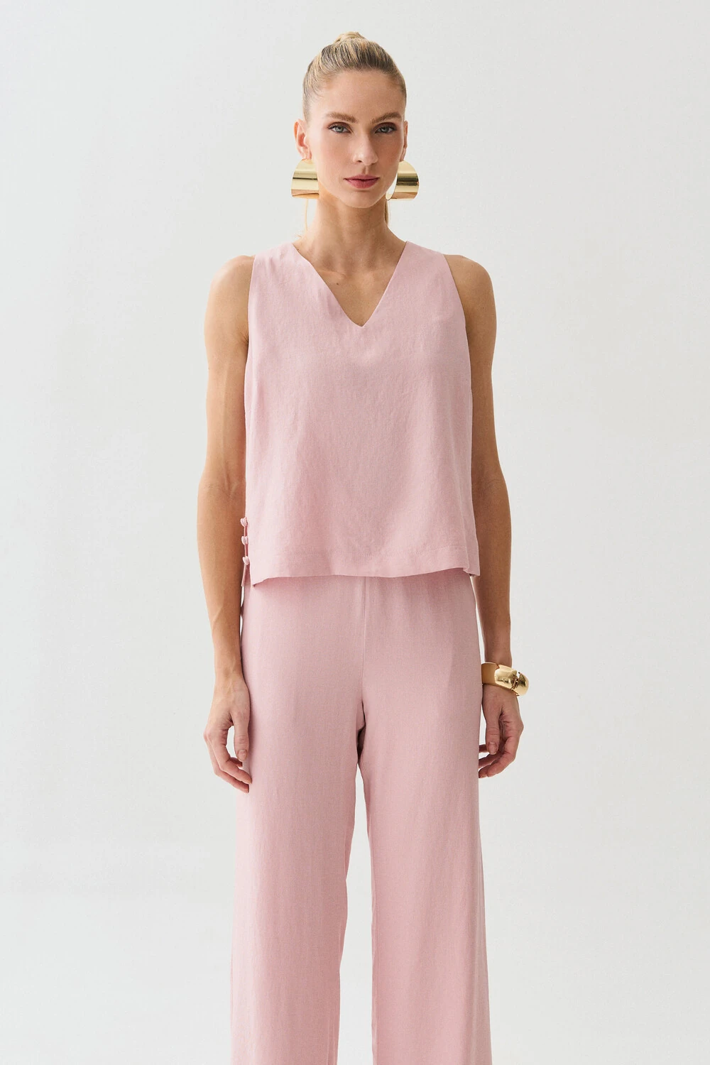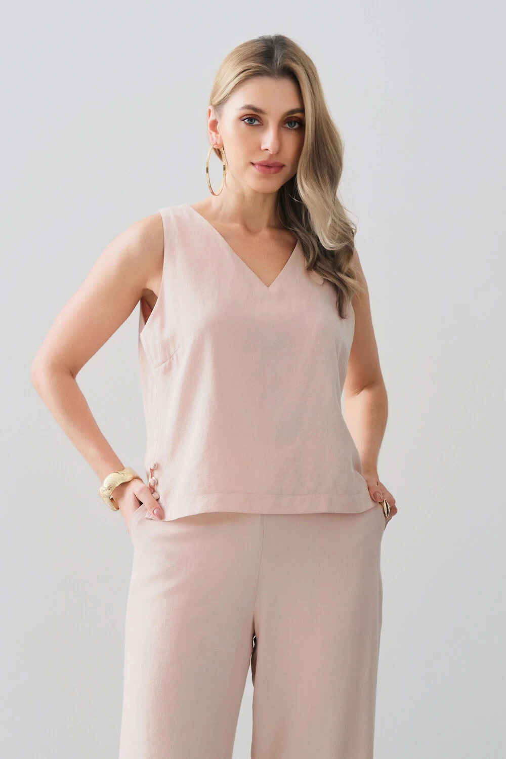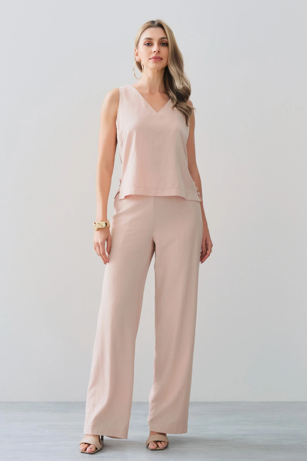 Conjunto de blusa regata decote v com 3 mini botões forraods nas laterais e calça reta com bolso faca. A calça contém o ziper invisível na lateral.