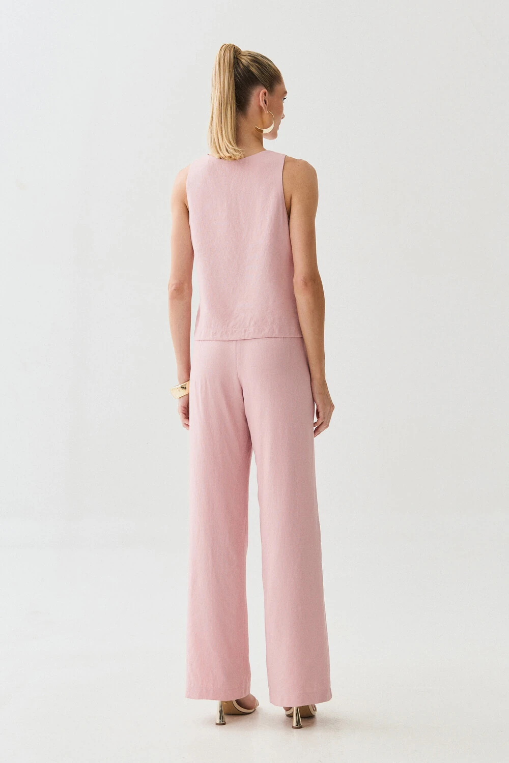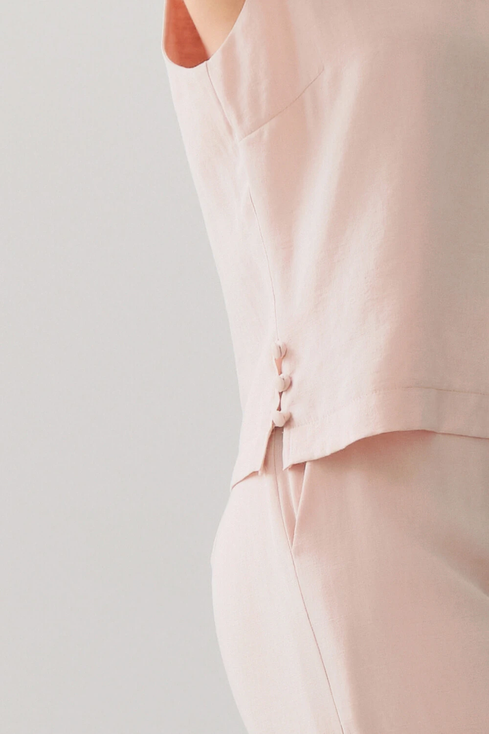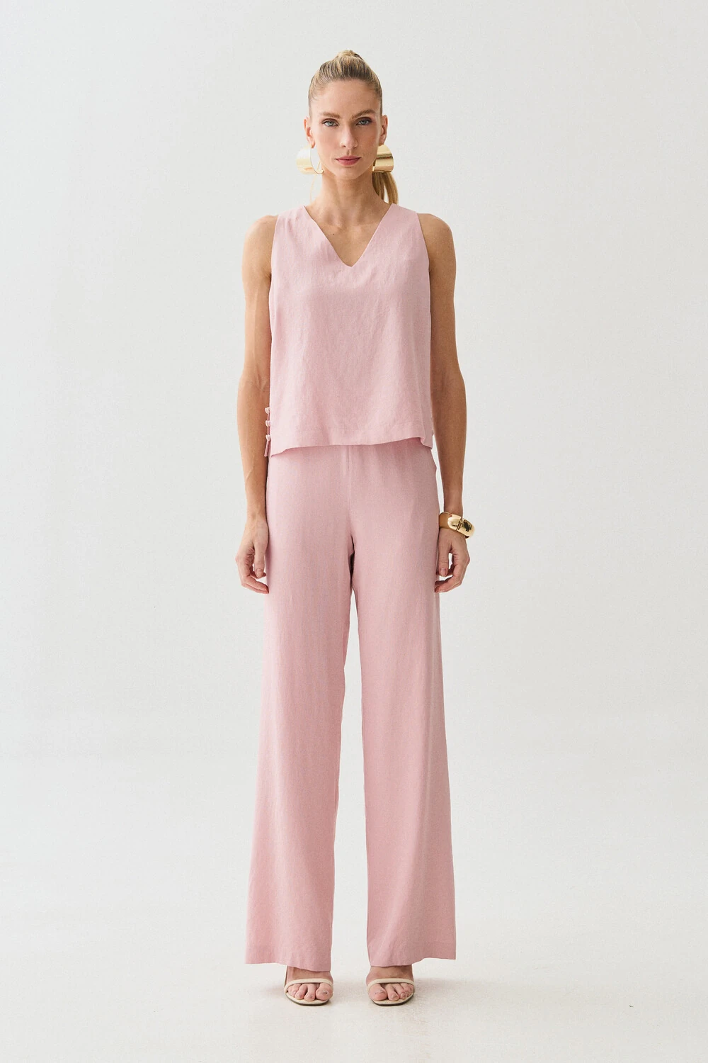 Conjunto de blusa regata decote v com 3 mini botões forraods nas laterais e calça reta com bolso faca. A calça contém o ziper invisível na lateral.