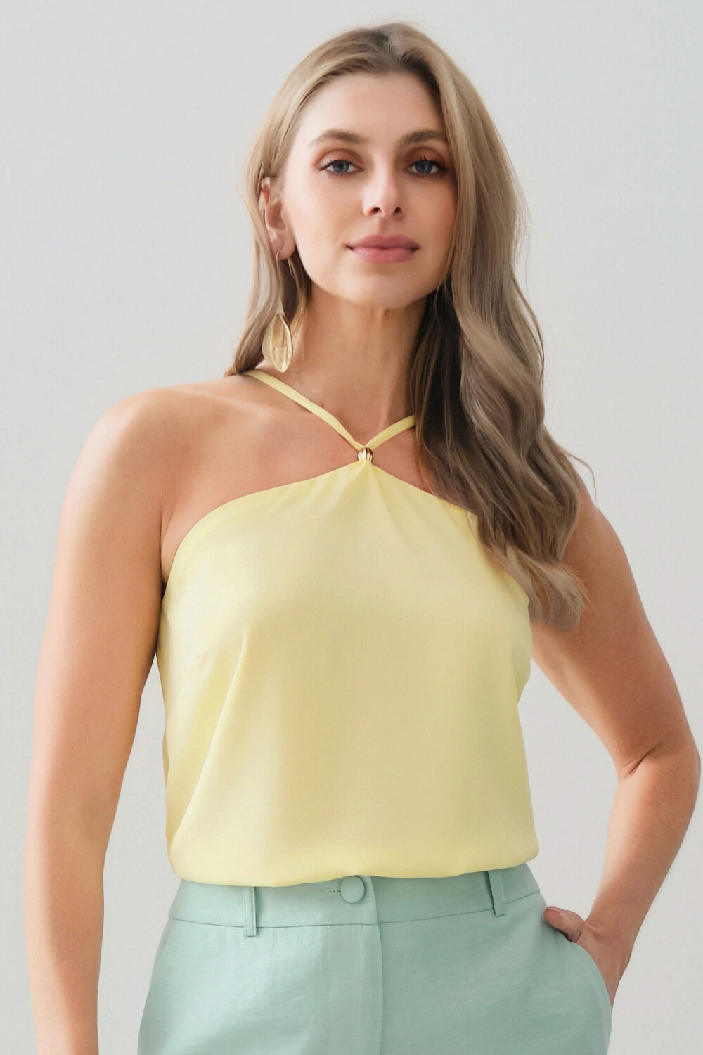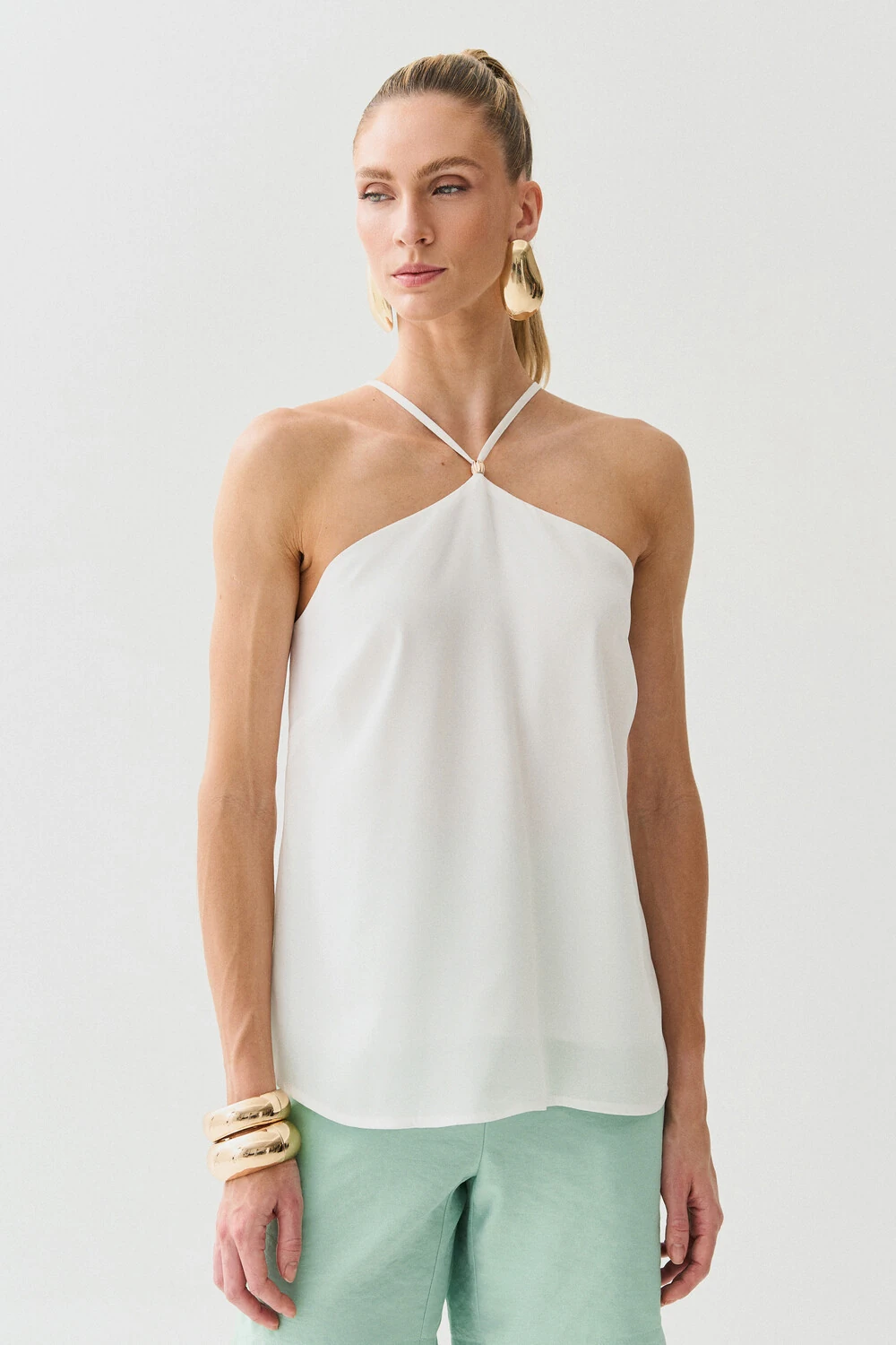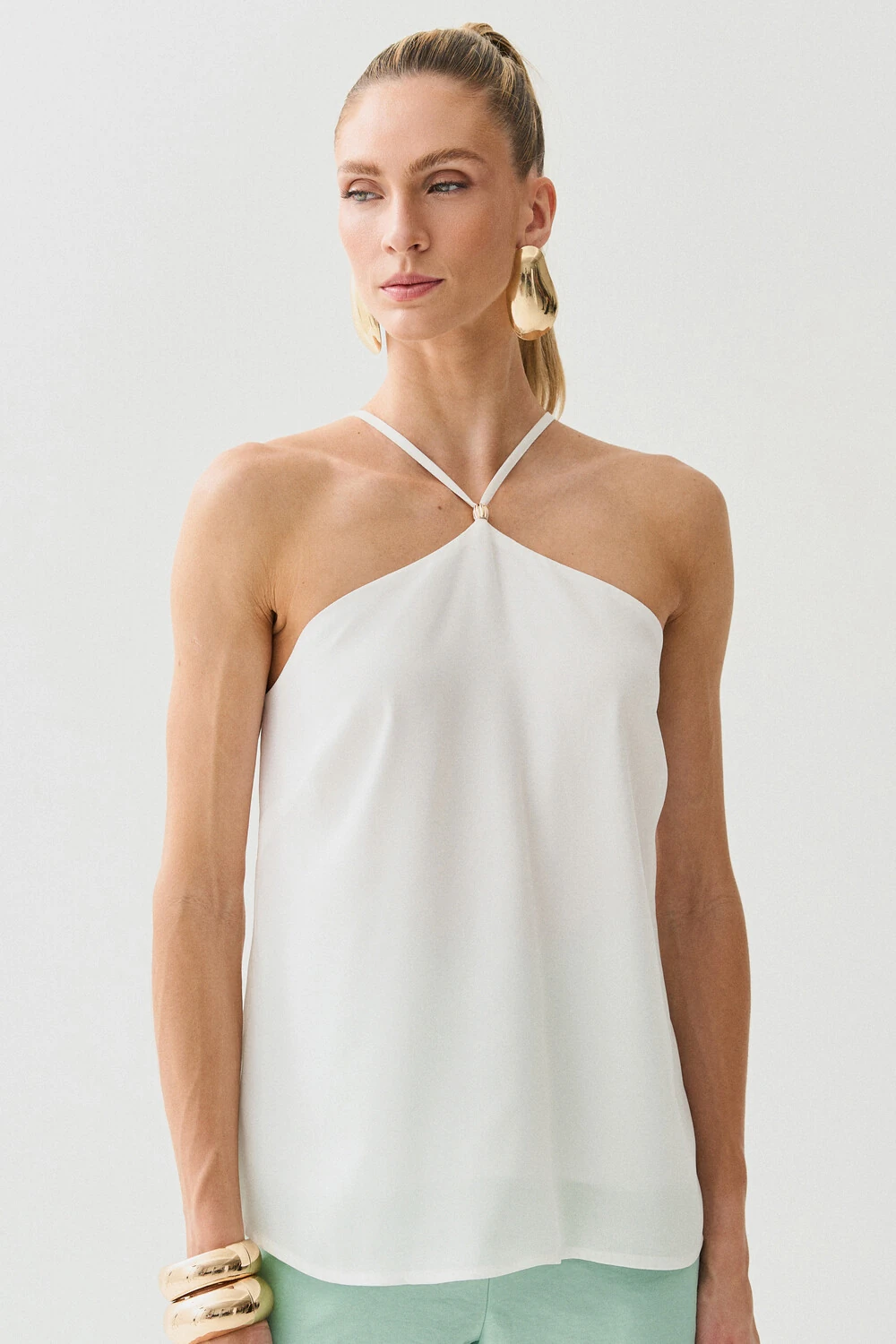 Blusa dupla de alcinha frente única com fivela dourada. A alcinha contém o regulador.