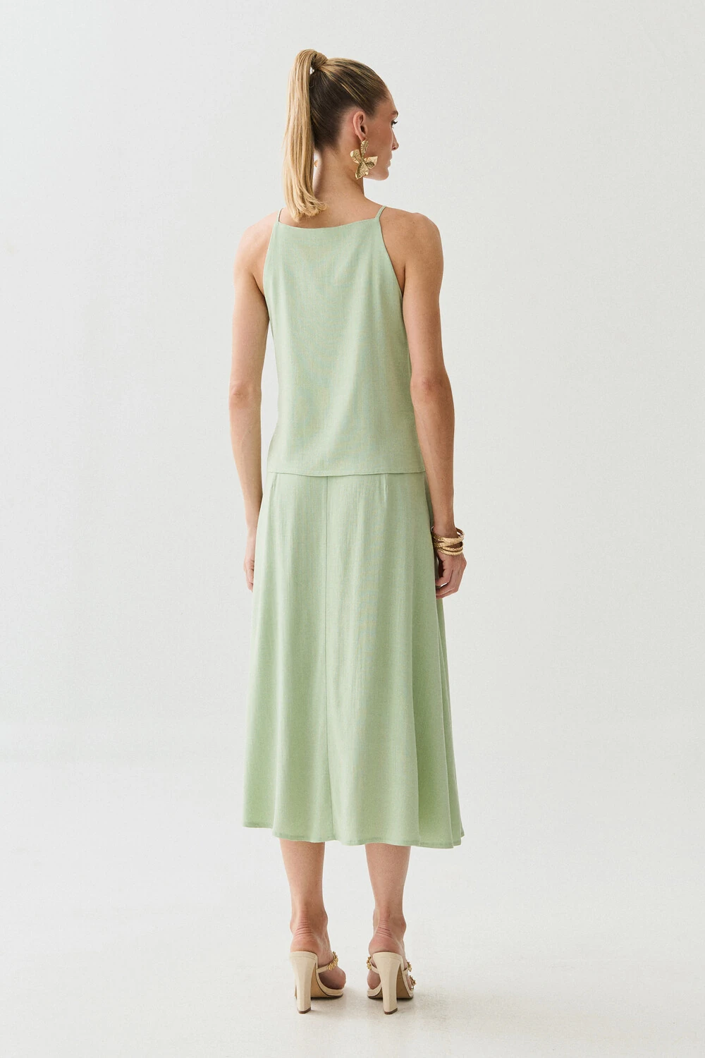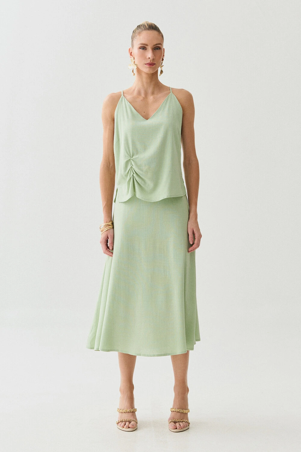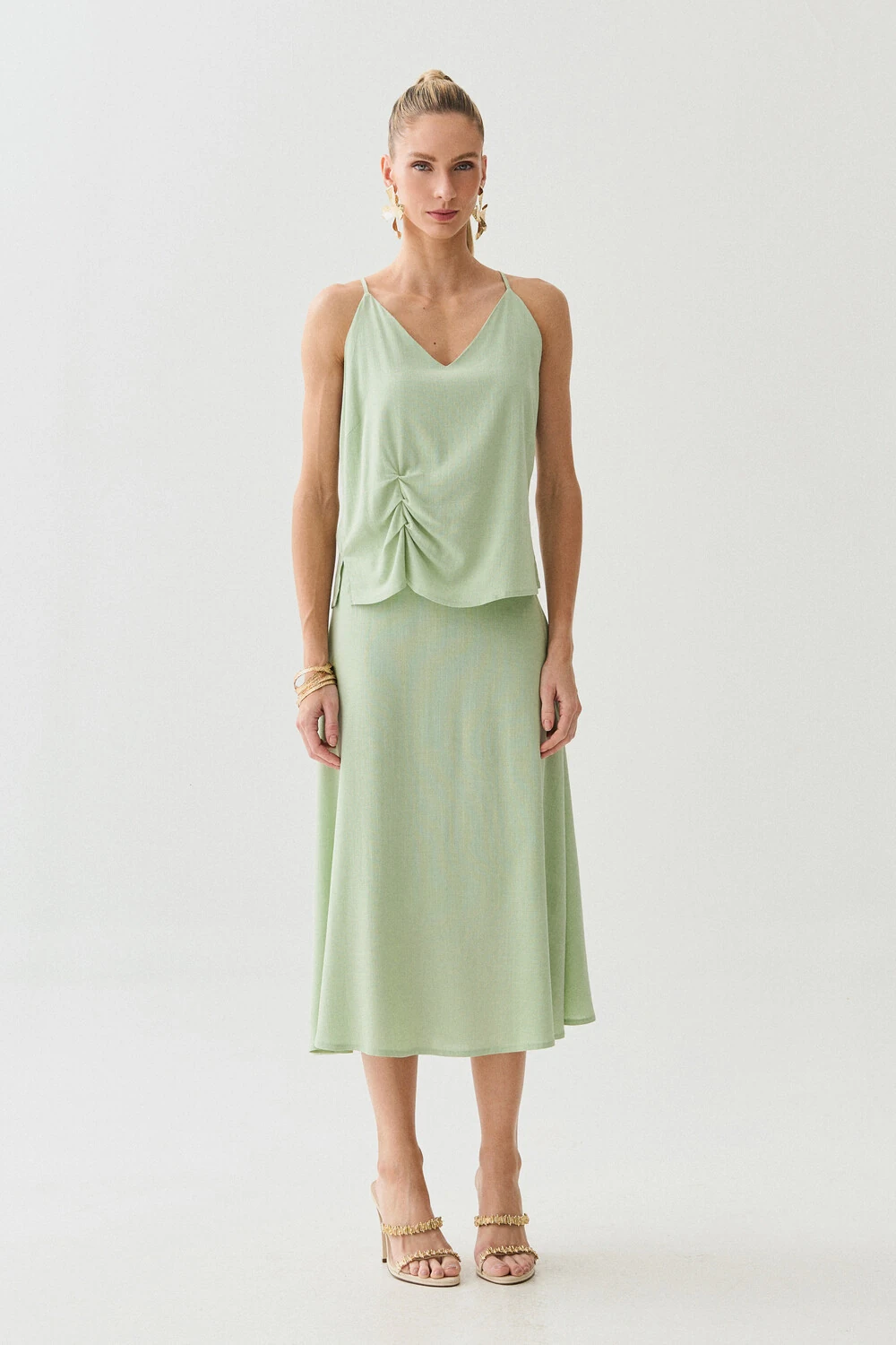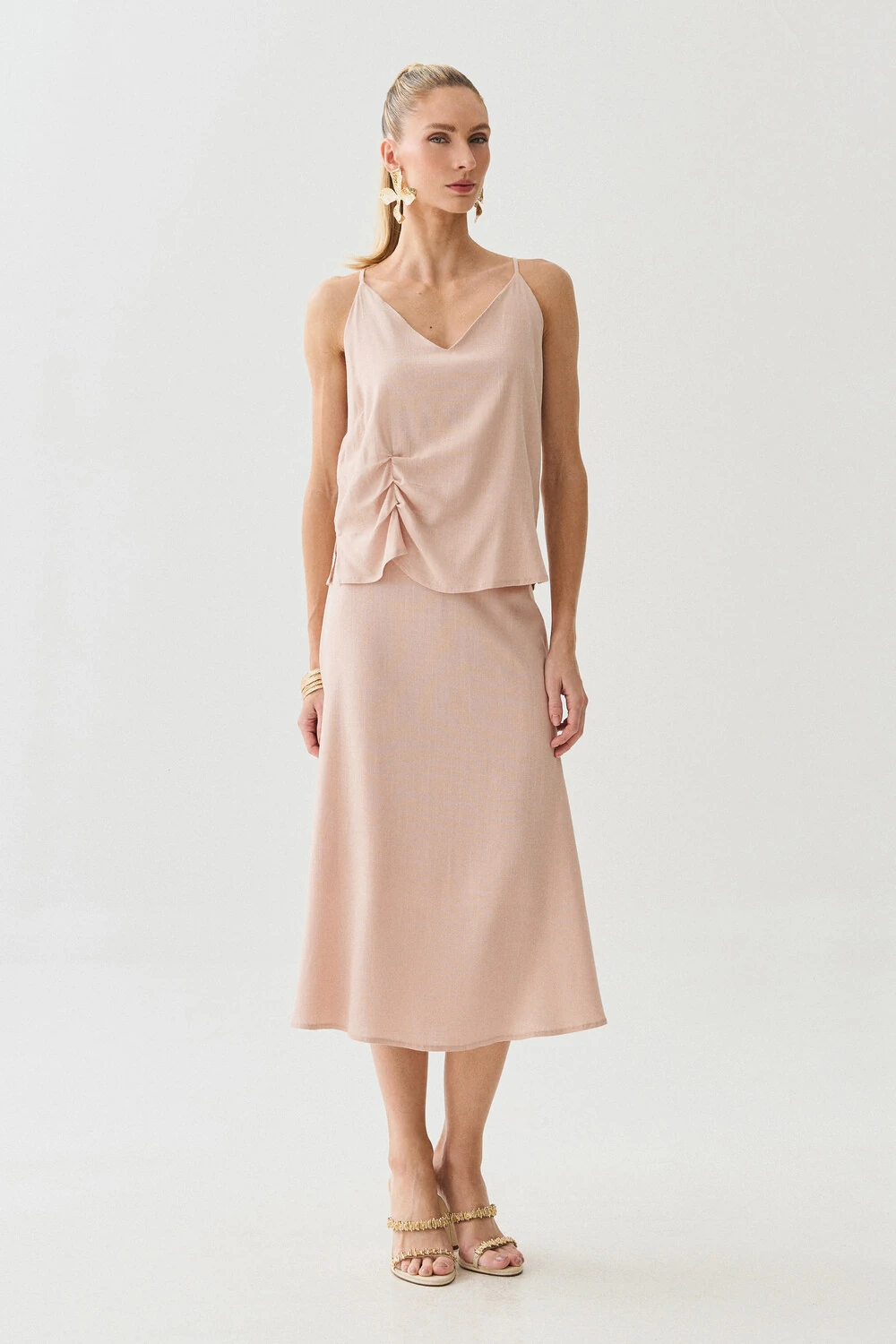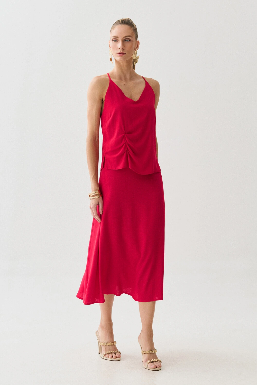 Conjunto de blusa de alcinha assimétrica decote v com pregas na lateral direita e saia midi godê. A saia contém o ziper invisível na lateral.