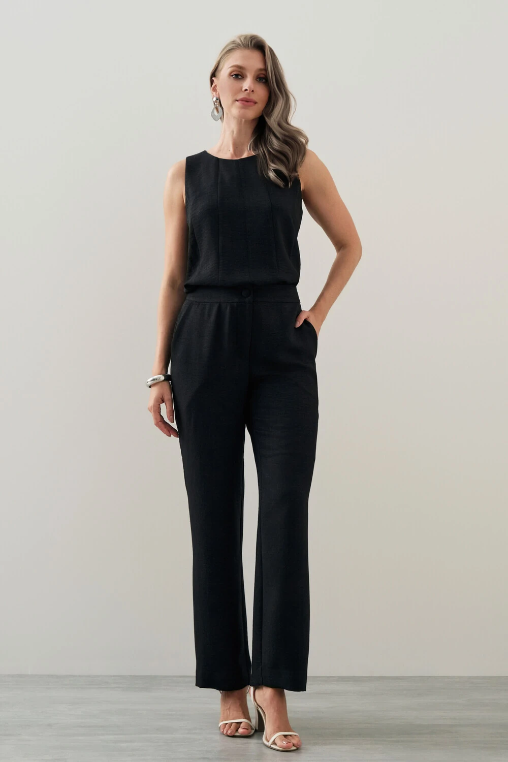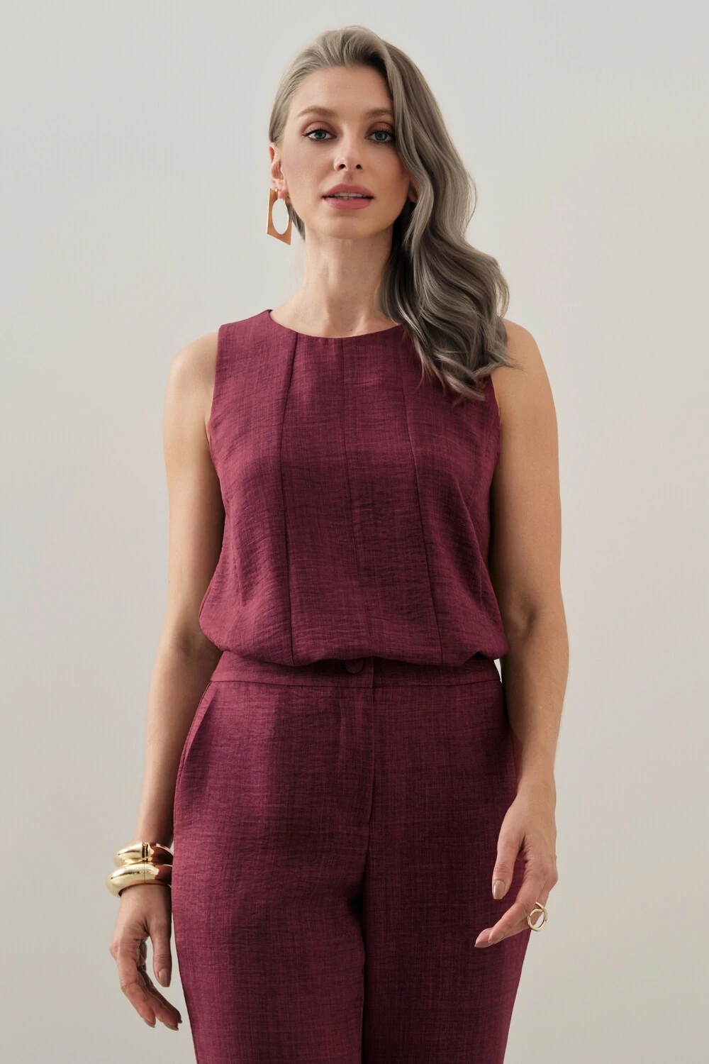 A blusa regata possui modelagem fluida com recortes frontais que alongam visualmente a silhueta, mantendo estrutura e elegância. O acabamento limpo reforça a proposta atemporal da peça.