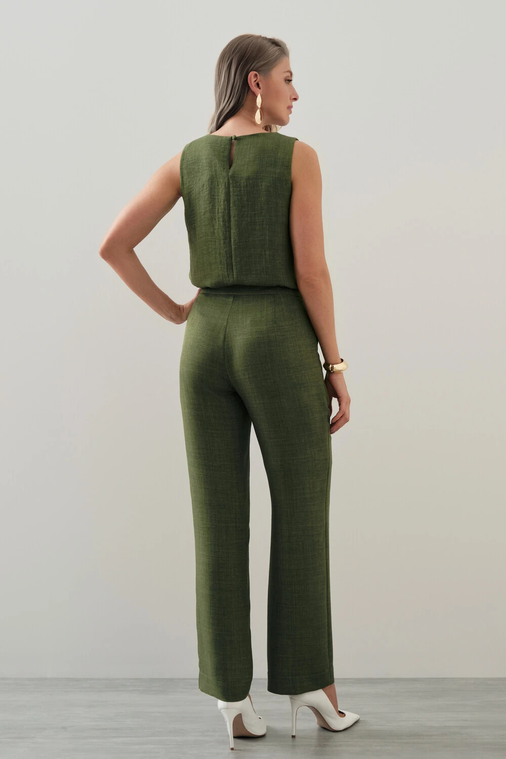Tecido com aparência natural e textura levemente mesclada, proporcionando visual semelhante ao linho, porém com toque mais suave e fluidez no caimento. Estrutura leve, confortável e elegante.