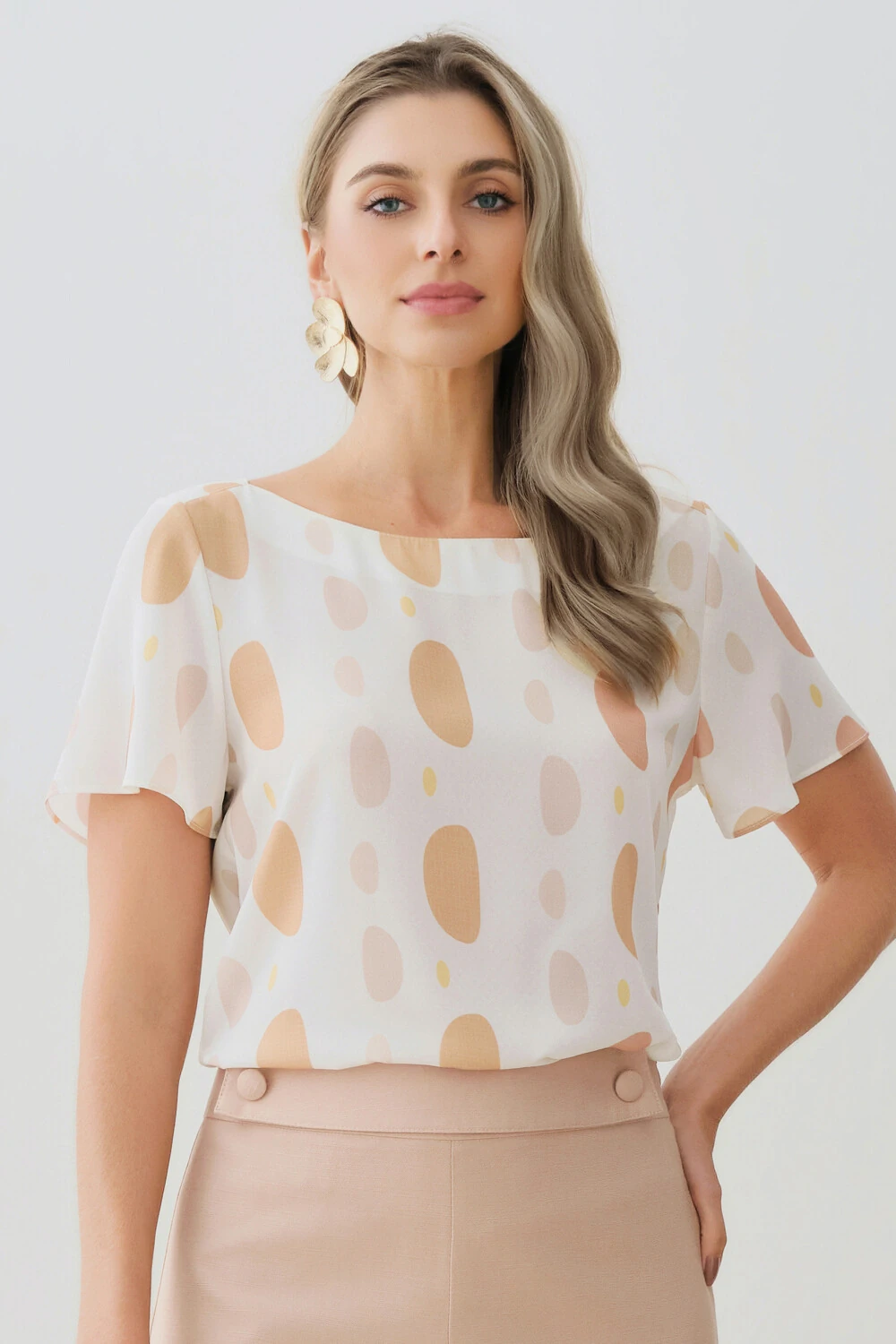 Blusa estampada abstrata com design leve e feminino, perfeita para composições elegantes com suavidade.