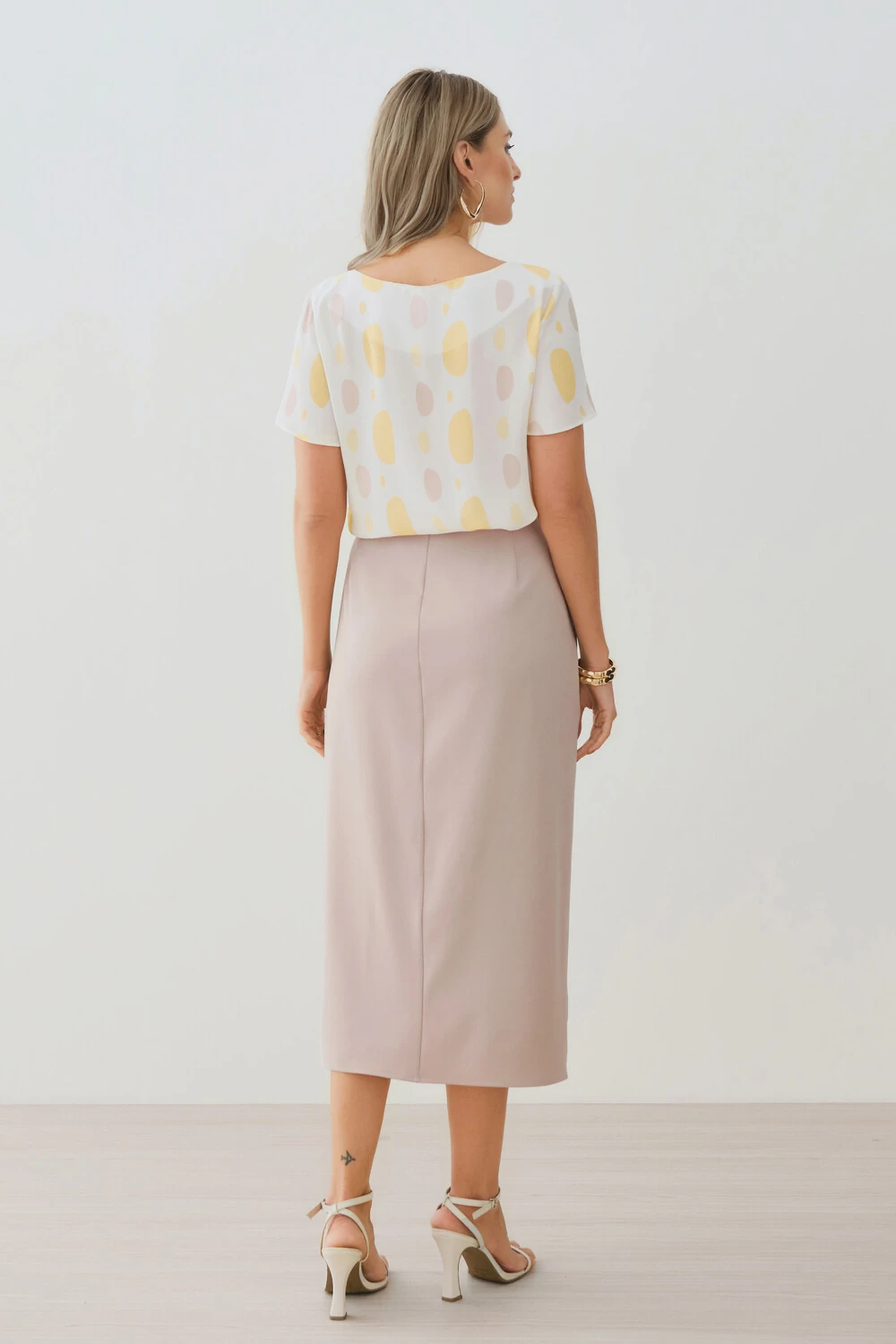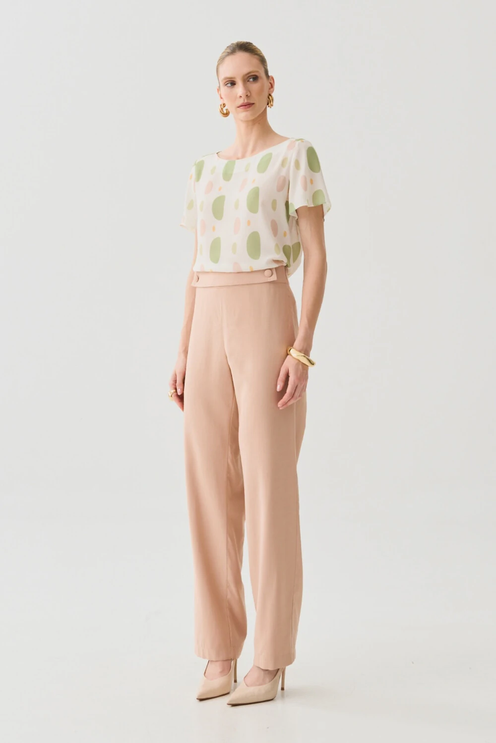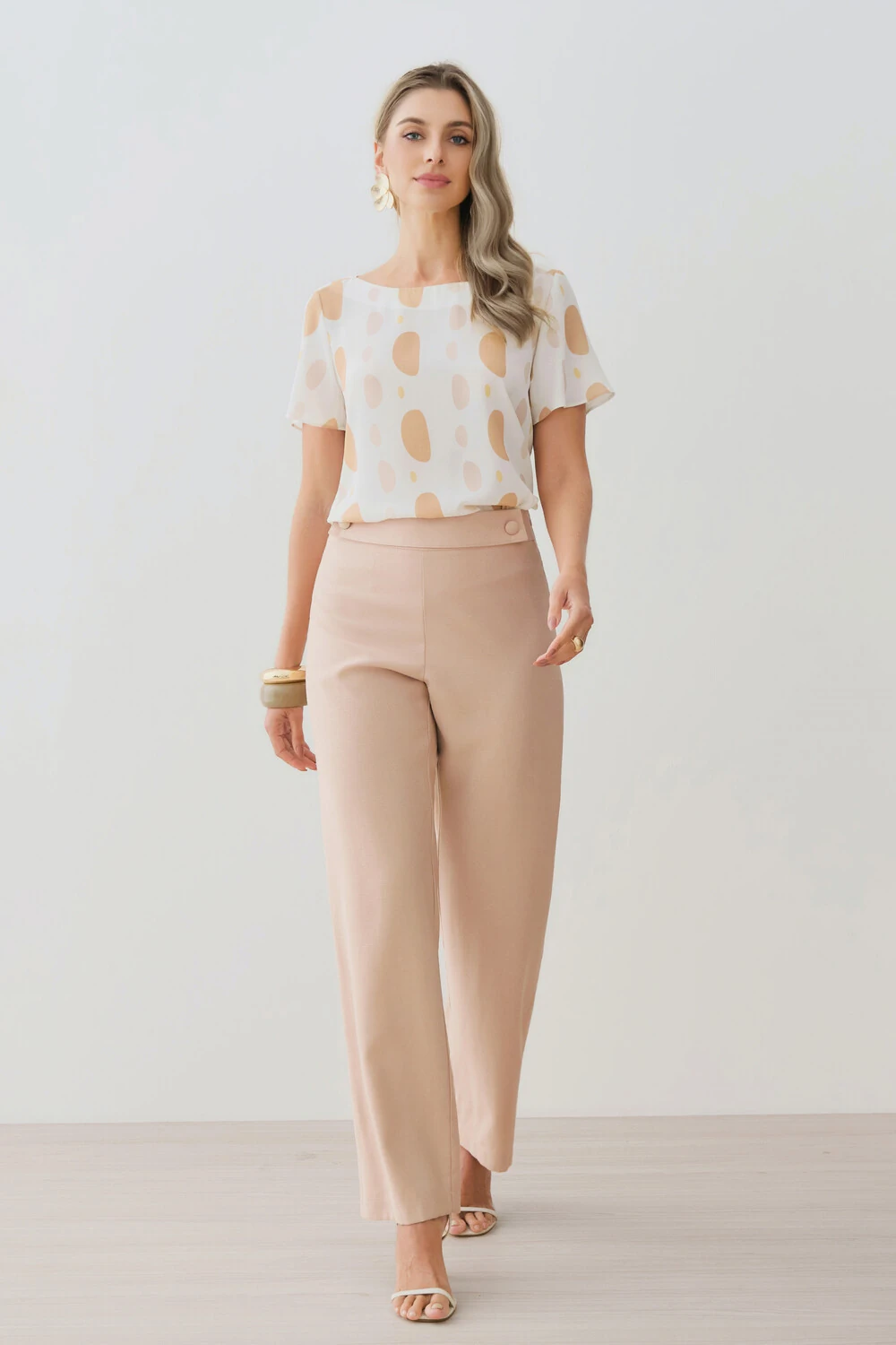 A estampa abstrata em tons suaves adiciona personalidade com sofisticação, ideal para combinar com peças de alfaiataria ou produções mais leves no dia a dia.