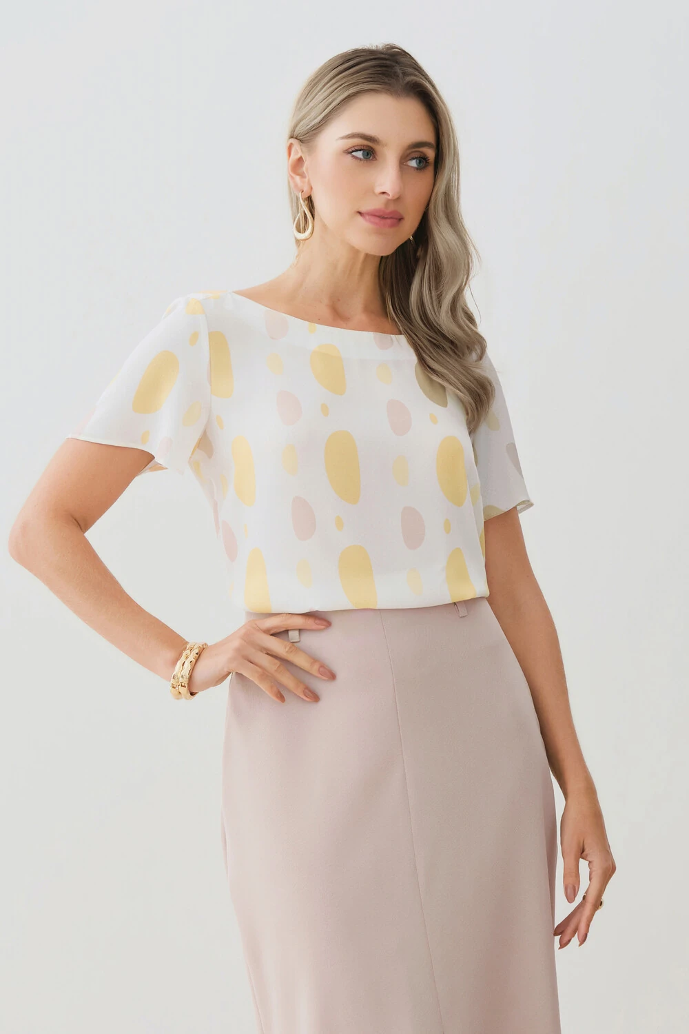 A modelagem solta proporciona fluidez e conforto, enquanto o decote canoa valoriza o colo de forma discreta. As mangas amplas trazem movimento e delicadeza ao visual.