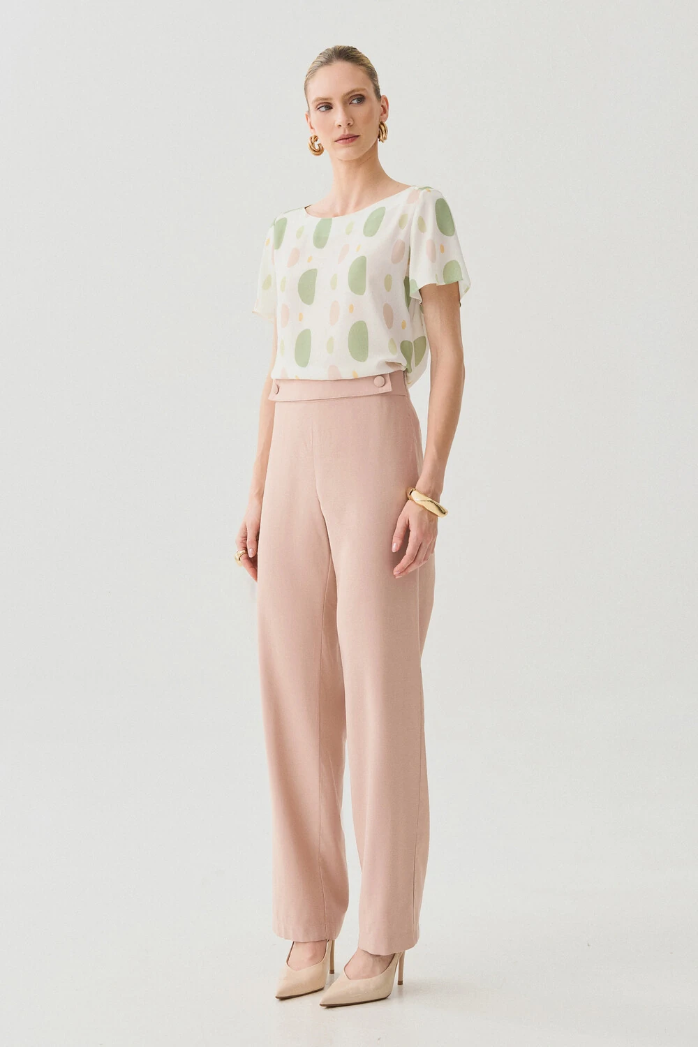A estampa abstrata em tons suaves adiciona personalidade com sofisticação, ideal para combinar com peças de alfaiataria ou produções mais leves no dia a dia.