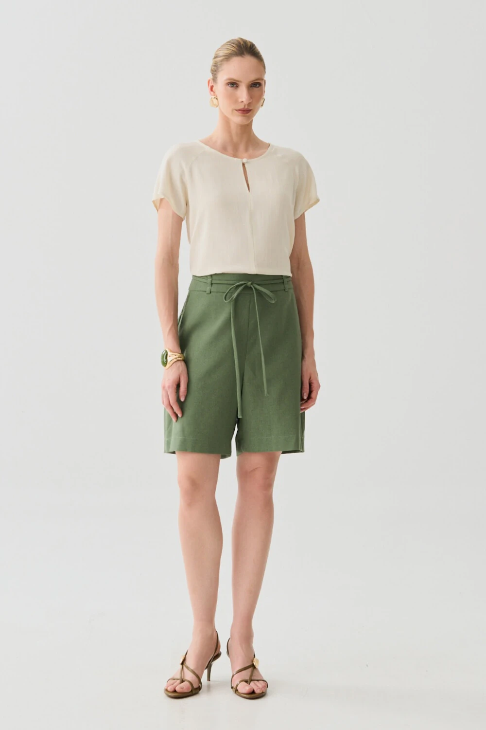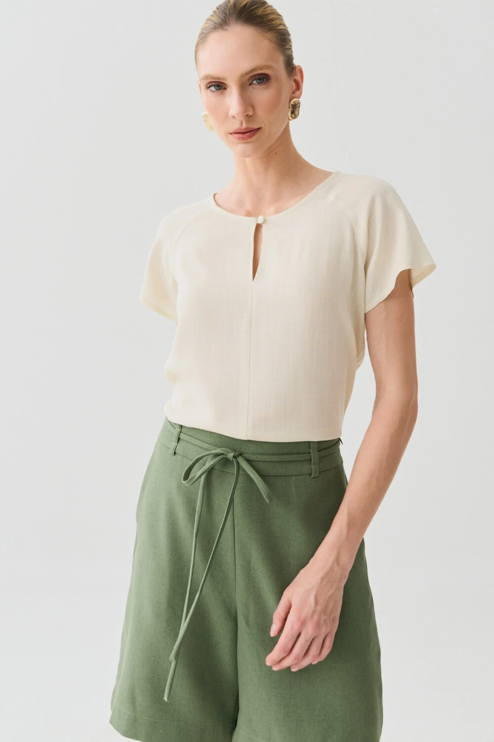 Possui decote redondo com abertura frontal em gota e botão forrado, agregando sofisticação sutil à peça.
