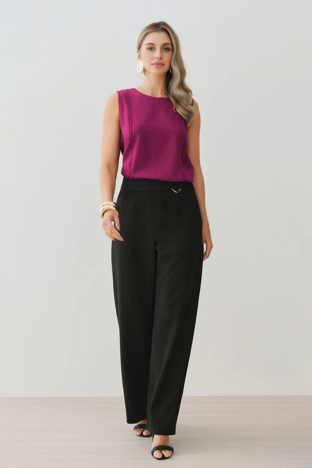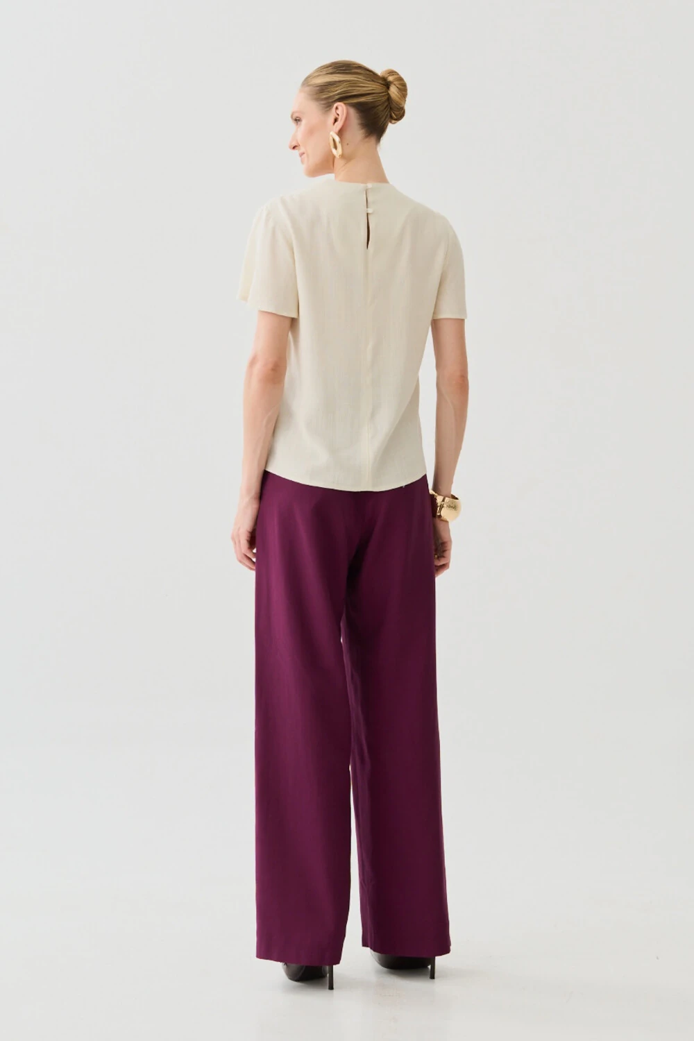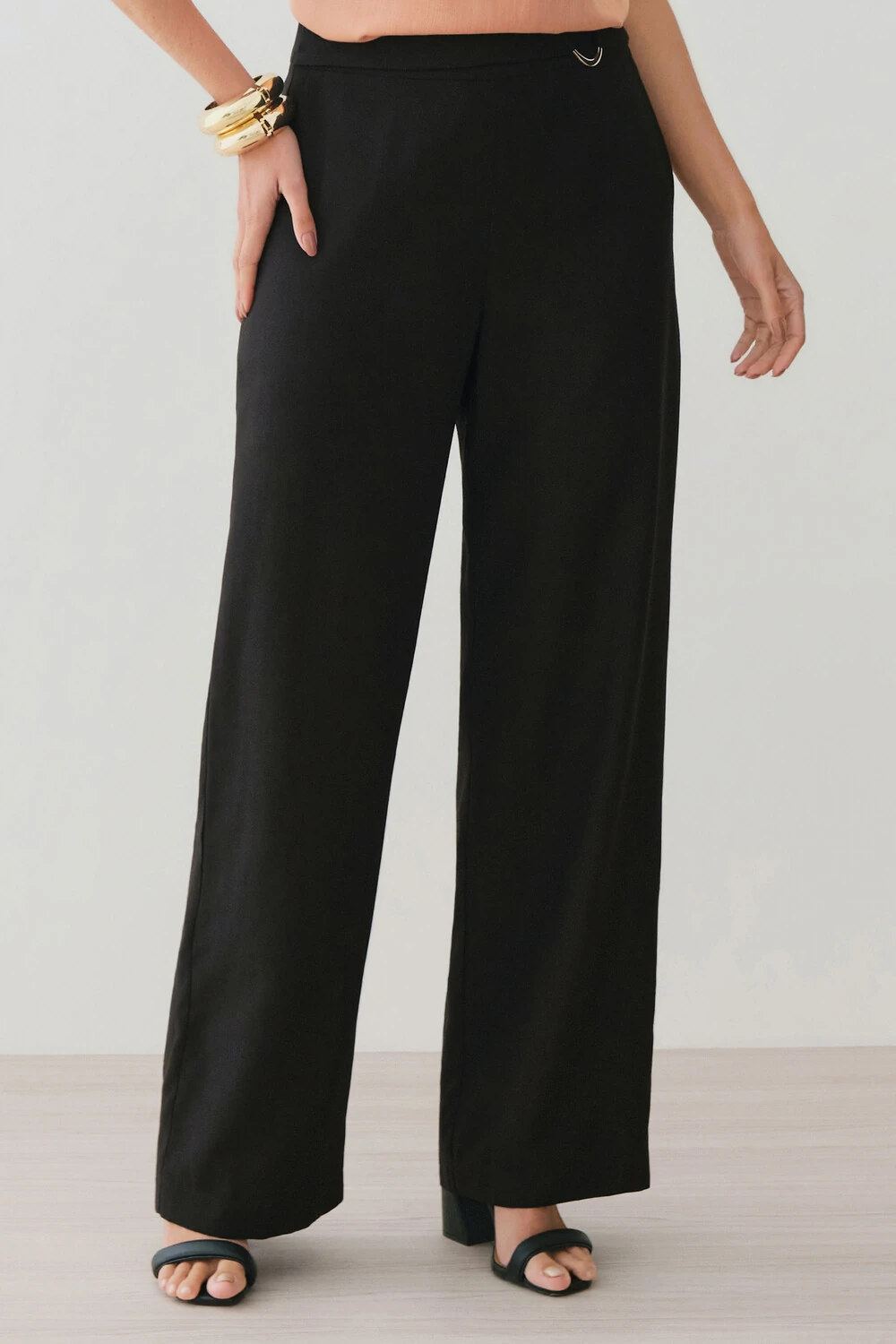 Modelo reta, com pernas amplas que alongam a silhueta e proporcionam movimento elegante ao caminhar.