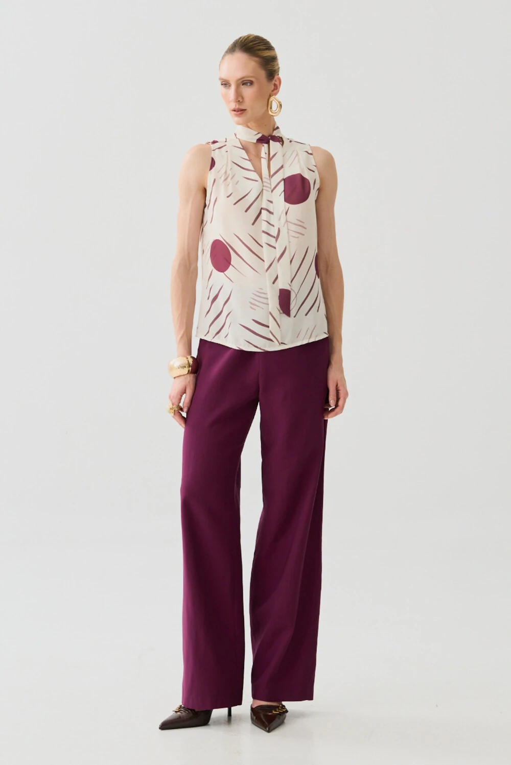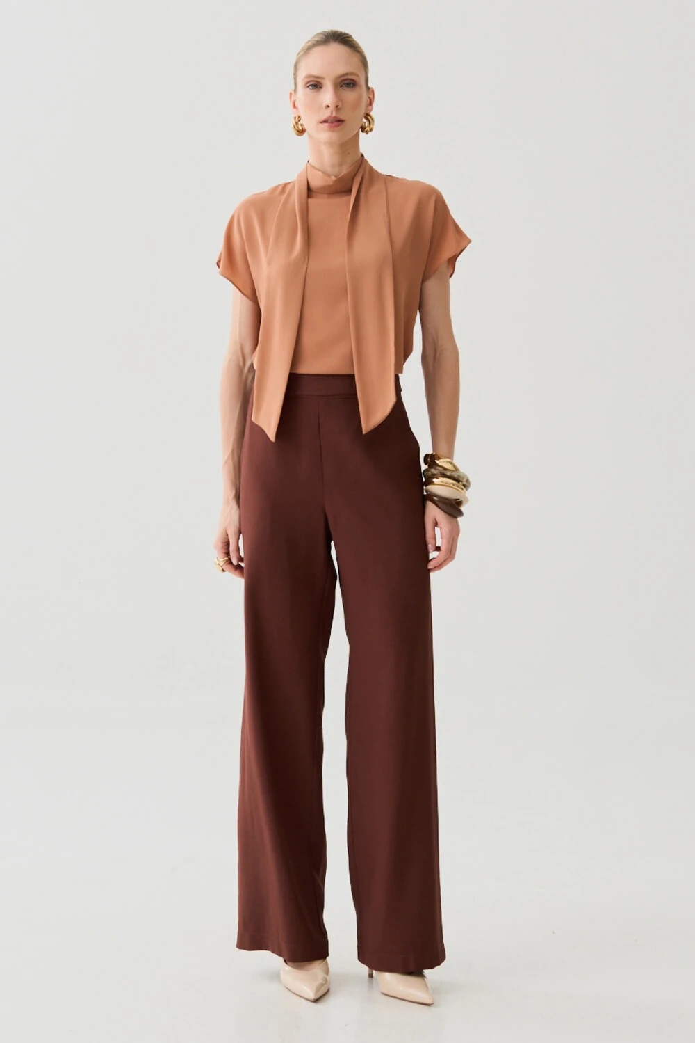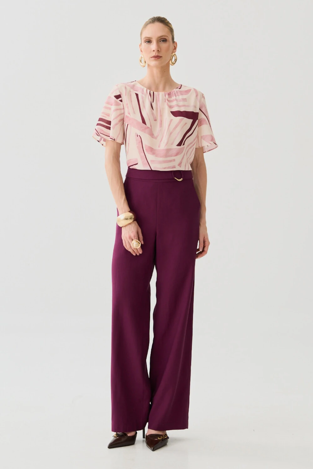 Calça em tecido de alfaiataria com caimento fluido e estrutura equilibrada.